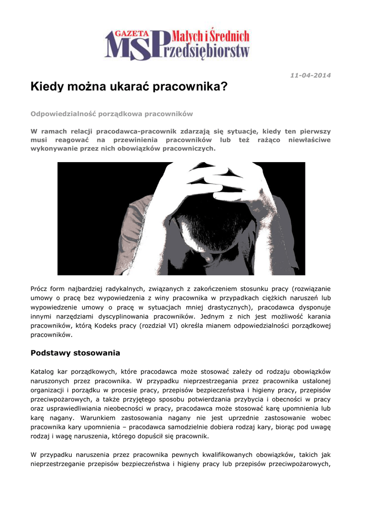 11-04-2014 Kiedy można ukarać pracownika? Odpowiedzialność porządkowa pracowników W ramach relacji pracodawca-pracownik zdarzają się sytuacje, kiedy ten pierwszy musi reagować na przewinienia pracowników lub też rażąco niewłaściwe wykonywanie przez nich obowiązków pracowniczych. Prócz form najbardziej radykalnych, związanych z zakończeniem stosunku pracy (rozwiązanie umowy o pracę bez wypowiedzenia z winy pracownika w przypadkach ciężkich naruszeń lub wypowiedzenie umowy o pracę w sytuacjach mniej drastycznych), pracodawca dysponuje innymi narzędziami dyscyplinowania pracowników. Jednym z nich jest możliwość karania pracowników, którą Kodeks pracy (rozdział VI) określa mianem odpowiedzialności porządkowej pracowników. Podstawy stosowania Katalog kar porządkowych, które pracodawca może stosować zależy od rodzaju obowiązków naruszonych przez pracownika. W przypadku nieprzestrzegania przez pracownika ustalonej organizacji i porządku w procesie pracy, przepisów bezpieczeństwa i higieny pracy, przepisów przeciwpożarowych, a także przyjętego sposobu potwierdzania przybycia i obecności w pracy oraz usprawiedliwiania nieobecności w pracy, pracodawca może stosować karę upomnienia lub karę nagany. Warunkiem zastosowania nagany nie jest uprzednie zastosowanie wobec pracownika kary upomnienia – pracodawca samodzielnie dobiera rodzaj kary, biorąc pod uwagę rodzaj i wagę naruszenia, którego dopuścił się pracownik. W przypadku naruszenia przez pracownika pewnych kwalifikowanych obowiązków, takich jak nieprzestrzeganie przepisów bezpieczeństwa i higieny pracy lub przepisów przeciwpożarowych, opuszczenie pracy bez usprawiedliwienia, stawienie się w pracy w stanie nietrzeźwości lub spożywanie alkoholu w miejscu pracy – pracodawca może stosować karę pieniężną. Możliwość nałożenia kary pieniężnej nie zobowiązuje pracodawcy do stosowania tylko tego rodzaju kary (najbardziej dolegliwej dla pracownika, gdyż uszczuplającej jego finanse). Pracodawca może przykładowo w razie spożywania przez pracownika alkoholu w miejscu pracy poprzestać na karze upomnienia lub nagany. Jednak niezgodne z prawem byłoby zastosowanie w takim przypadku łącznie kary niepieniężnej (upomnienia lub nagany) i kary pieniężnej. Kara pieniężna za jedno naruszenie, jak również za każdy dzień nieusprawiedliwionej nieobecności, nie może być wyższa od jednodniowego wynagrodzenia pracownika, a łącznie kary pieniężne w danym miesiącu nie mogą przewyższać jednej dziesiątej części wynagrodzenia, przypadającego pracownikowi do wypłaty. Bardzo istotny (i pracodawców, i pracowników) jest fakt, że pracodawca nie może stosować wobec pracowników innych kar, niż te określone w rozdziale czwartym Kodeksu pracy. Ponadto, pracownicy nie mogą być ukarani karą porządkową za inne naruszenia, niż wprost przewidziane przez ustawodawcę. Mówiąc inaczej – zarówno katalog kategorii przewinień pracowników, jak też kar możliwych do stosowania przez pracodawcę, są katalogami zamkniętymi. Nie jest zatem dopuszczalne zaostrzenia kar, przykładowo przez podanie do wiadomości załogi informacji o ukaraniu. Stosowanie kar spoza katalogu zawartego w Kodeksie pracy stanowi wykroczenie przeciwko prawom pracownika (art. 281 pkt 4 k.p.). Jednymi z częstszych wątpliwości, jakie pracodawcy mają przy stosowaniu kar porządkowych, jest to, czy pracownika można ukarać taką karą za naruszenie regulaminu pracy lub niewykonanie (odmowę wykonania) polecenia służbowego. Od 1 stycznia 2004 roku art. 108 § 1 k.p. nie zawiera już odniesienia do naruszenia regulaminu pracy jako samodzielnej przyczyny odpowiedzialności porządkowej. Wprawdzie poprzez odesłanie do ustalonej organizacji i porządku w procesie pracy ustawodawca nawiązuje do regulaminu pracy (właśnie ten akt m.in. ustala organizację i porządek w procesie pracy), jednak nie czyni przez to przesłanką odpowiedzialności jego naruszenia, tylko nieprzestrzegania w istocie rzeczy części jego postanowień dotyczących wspomnianej organizacji i porządku w procesie pracy. Zatem błędem byłoby użycie następującego sformułowania: Stosuję wobec Pana/Pani karę porządkową upomnienia/nagany z powodu naruszenia § X regulaminu pracy, które to naruszenie polegało na ..., natomiast uzasadnione będzie następujące sformułowanie: Stosuję wobec Pana/Pani karę porządkową upomnienia/nagany z powodu naruszenia ustalonej organizacji i porządku w procesie pracy, określonej w § X regulaminy pracy, które to naruszenie polegało na … Odnośnie niewykonania (odmowy wykonania) polecenia służbowego w doktrynie prawa pracy wskazuje się, że samo niewykonanie (odmowa wykonania) takiego polecenia nie stanowi podstawy nałożenia kary porządkowej. Natomiast, jeżeli polecenie odnosi się do jednej z podstaw stosowania kar porządkowych, określonych w art. 108 § 1 k.p., pracodawca możne nakładać kary porządkowe za jego niewykonanie (odmowę wykonania). W praktyce trudno jednak spotkać sytuacje, w której niewykonanie (odmowa wykonania) polecenia służbowego nie stanowi nieprzestrzegania ustalonej organizacji i porządku w procesie pracy. Możliwość wystąpienia problemów praktycznych dostrzegł ustawodawca, gdyż w projekcie nowelizacji Kodeksu pracy (nr druku 1948), artykułowi 108 § 1 k.p. nadano brzmienie Za niedbałe lub nienależyte wykonywanie obowiązków, zadań i poleceń służbowych, nieprzestrzeganie przez pracownika ustalonej organizacji i porządku w procesie pracy, przepisów bezpieczeństwa i higieny pracy, przepisów przeciwpożarowych, a także przyjętego sposobu potwierdzania przybycia i obecności w pracy oraz usprawiedliwiania nieobecności w pracy, pracodawca może stosować (…). Widać zatem, że ustawodawca planuje poszerzenie katalogu podstaw odpowiedzialności porządkowej wprost o niewykonywanie poleceń służbowych. P