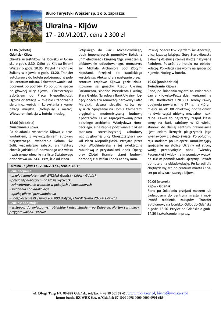 Biuro Turystyki Wojażer sp. z o.o. zaprasza: Ukraina - Kijów 17 - 20.VI.2017, cena 2 300 zł 17.06 (sobota) Gdańsk - Kijów Zbiórka uczestników na lotnisku w Gdańsku o godz. 8.30. Odlot do Kijowa liniami Wizzair o godz. 10.35. Przylot na lotnisko Żuliany w Kijowie o godz. 13.20. Transfer autokarowy do hotelu położonego w pobliżu centrum miasta. Zakwaterowanie i odpoczynek po podróży. Po południu spacer po głównej ulicy Kijowa - Chreszczatyku z dojściem do Placu Niepodległości. Ogólna orientacja w mieście i zapoznanie się z możliwościami korzystania z komunikacji miejskiej (trolejbusy i metro). Wieczorem kolacja w hotelu i nocleg. 18.06 (niedziela) Zwiedzanie Kijowa. Po śniadaniu zwiedzanie Kijowa z przewodnikiem, z wykorzystaniem autokaru turystycznego. Zwiedzanie Soboru św. Zofii, wspaniałego zabytku architektury chrześcijańskiej, ufundowanego w X wieku i wpisanego obecnie na listę Światowego dziedzictwa UNESCO. Przejście od Placu Sofijskiego do Placu Michałowskiego, obok imponujących pomników Bohdana Chmielnickiego i księżnej Olgi. Zwiedzanie, efektowanie odbudowanego, monastyru św. Michała Archanioła pod Złotymi Kopułami. Przejazd do katolickiego kościoła św. Aleksandra a następnie przez centrum rządowe Kijowa gdzie zlokalizowane są gmachy Rządu Ukrainy, Parlamentu, siedziba Prezydenta Ukrainy, Stara Giełda, Narodowy Bank Ukrainy i będący obecnie w renowacji barokowy Pałac Maryjski, dawna siedziba carów rosyjskich. Spojrzenie na Dom z Chimerami oryginalną, modernistyczną budowlę z początków XX w. zaprojektowaną przez polskiego architekta Władysława Horodeckiego, a następnie podziwianie z okien autokaru socrealistycznej zabudowy wzdłuż głównej ulicy Chreszczatyka i wokół Placu Niepodległości. Przejazd przez ulicę Włodzimierską z jej eklektyczną zabudową z przystankami obok Opery, przy Złotej Bramie, starej budowli obronnej z XI wieku i obok Kenesy Kara- Ukraina - Kijów: 17 - 20.06.2017 r., cena 2 300 zł Cena obejmuje: - przelot samolotem linii WIZZAIR Gdańsk - Kijów - Gdańsk - przejazdy autokarem na trasie wycieczki - zakwaterowanie w hotelu w pokojach dwuosobowych - śniadania i obiadokolacje - opiekę pilota i przewodnictwo - ubezpieczenie KL (suma 200 000 złotych) i NNW (suma 20 000 złotych) Cena nie obejmuje: - wstępów do zwiedzanych obiektów i rejsu statkiem po Dnieprze. Na ten cel należy przygotować ok. 30 euro imskiej. Spacer tzw. Zjazdem św. Andrzeja, ulicą łączącą książęcą Górę Starokijowską z dawną dzielnicą rzemieślniczą nazywaną Padołem. Powrót do hotelu na obiadokolację. Po kolacji czas wolny na spacer po Kijowie. Nocleg w hotelu. 19.06 (poniedziałek) Zwiedzanie Kijowa Rano, po śniadaniu wyjazd na zwiedzanie Ławry Kijowsko-Peczerskiej, wpisanej na listę Dziedzictwa UNESCO. Tereny Ławry obejmują powierzchnię 27 ha, na którym mieści się ok. 80 obiektów, podzielonych na dwie części obiekty muzealne i sakralne. Ławra to najstarszy zespół klasztorny na Rusi, założony w XI wieku, stanowi do dzisiaj centrum prawosławia i jest celem licznych pielgrzymek jego wyznawców z całego świata. Po południu rejs statkiem po Dnieprze, umożliwiający spojrzenie na stolicę Ukrainy od strony wody, przepłynięcie obok Twierdzy Peczerskiej i widok na imponujący wysoki na 108 m pomnik Matki Ojczyzny. Powrót do hotelu na obiadokolację. Po kolacji dla chętnych wyjazd do centrum miasta i spacer po uliczkach starego Kijowa. 20.06 (wtorek) Kijów - Gdańsk Rano po śniadaniu przejazd metrem lub trolejbusem do centrum miasta i możliwość zrobienia zakupów. Transfer autokarowy na lotnisko. Odlot do Gdańska o godz. 13.50. Przylot do Gdańska o godz. 14.30 i zakończenie imprezy. ul. Długi Targ 1-7, 80-828 Gdańsk, tel/fax + 48 58 301 38 47, www.wojazer.pl, [email protected] konto bank. BZ WBK S.A. o/Gdańsk 57 1090 1098 0000 0000 0901 6154