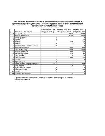 Dane liczbowe do szacowania strat w działalnościach zwierzęcych poniesionych w wyniku klęsk żywiołowych w 2012 r. Do wykorzystania przez komisje powołane w tym celu przez Wojewodę Mazowieckiego lp 1 2 3 4 5 6 7 8 9 10 11 12 13 14 15 16 17 18 19 20 21 działalność zwierzęca krowy mleczne jałówka hodowlana bydło opasowe cielęta prosię tucznik żywiec wieprzowy brakowany loszka hodowlana knur hodowlany rodzina pszczela odkład (4 plastry) koza młoda koza dorosła konina jagnięta żywe owce dorosłe waga poubojowa kura nioska wybrakowana nioska żywiec drobiowy kaczki kurczaki do odchowu średnia cena z lat ubiegłych w zł/kg 6 10 5 3 6 7 13,5 1,5 3,9 5 średnia cena z lat średnia cena ubiegłych w zł/szt prognozowana 3800 3800 3500 3500 6 10 130 130 5 3 900 900 1200 1200 300 300 150 150 70 70 200 200 6 7 13,5 12 12 1,5 3,9 5 6 6 Opracowano w Mazowieckim Ośrodku Doradztwa Rolniczego w Warszawie źródło: dane własne