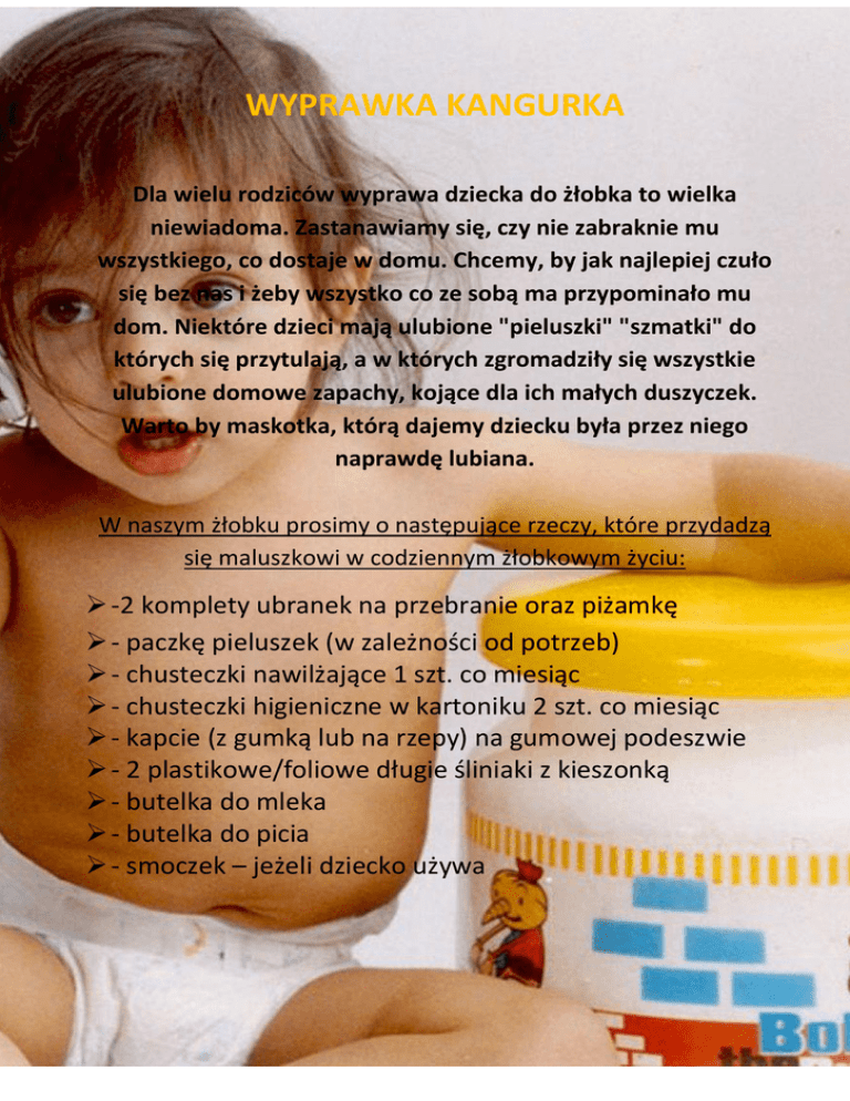 WYPRAWKA KANGURKA Dla wielu rodziców wyprawa dziecka do żłobka to wielka niewiadoma. Zastanawiamy się, czy nie zabraknie mu wszystkiego, co dostaje w domu. Chcemy, by jak najlepiej czuło się bez nas i żeby wszystko co ze sobą ma przypominało mu dom. Niektóre dzieci mają ulubione "pieluszki" "szmatki" do których się przytulają, a w których zgromadziły się wszystkie ulubione domowe zapachy, kojące dla ich małych duszyczek. Warto by maskotka, którą dajemy dziecku była przez niego naprawdę lubiana. W naszym żłobku prosimy o następujące rzeczy, które przydadzą się maluszkowi w codziennym żłobkowym życiu: -2 komplety ubranek na przebranie oraz piżamkę - paczkę pieluszek (w zależności od potrzeb) - chusteczki nawilżające 1 szt. co miesiąc - chusteczki higieniczne w kartoniku 2 szt. co miesiąc - kapcie (z gumką lub na rzepy) na gumowej podeszwie - 2 plastikowe/foliowe długie śliniaki z kieszonką - butelka do mleka - butelka do picia - smoczek – jeżeli dziecko używa