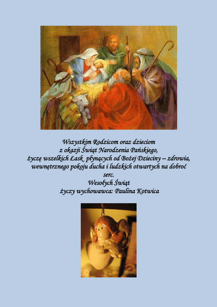Wszystkim Rodzicom oraz dzieciom z okazji Świąt Narodzenia Pańskiego, życzę wszelkich Łask płynących od Bożej Dzieciny – zdrowia, wewnętrznego pokoju ducha i ludzkich otwartych na dobroć serc. Wesołych Świąt życzy wychowawca: Paulina Kotwica