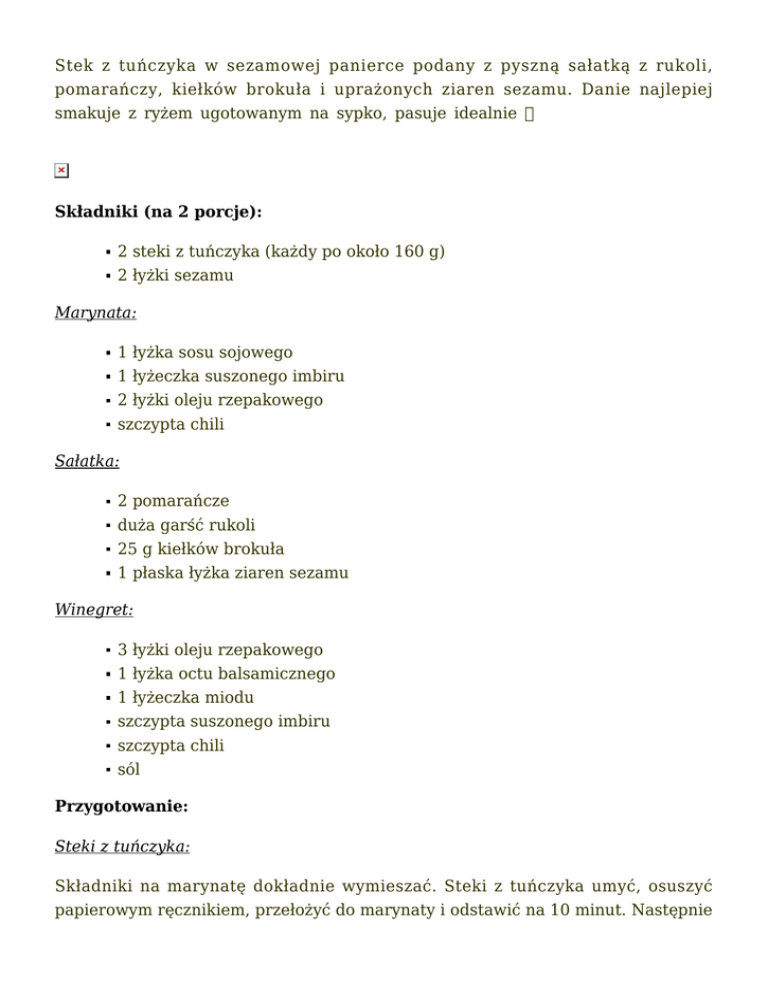 Stek z tuńczyka w sezamowej panierce podany z pyszną sałatką z rukoli, pomarańczy, kiełków brokuła i uprażonych ziaren sezamu. Danie najlepiej smakuje z ryżem ugotowanym na sypko, pasuje idealnie Składniki (na 2 porcje): 2 steki z tuńczyka (każdy po około 160 g) 2 łyżki sezamu Marynata: 1 łyżka sosu sojowego 1 łyżeczka suszonego imbiru 2 łyżki oleju rzepakowego szczypta chili Sałatka: 2 pomarańcze duża garść rukoli 25 g kiełków brokuła 1 płaska łyżka ziaren sezamu Winegret: 3 łyżki oleju rzepakowego 1 łyżka octu balsamicznego 1 łyżeczka miodu szczypta suszonego imbiru szczypta chili sól Przygotowanie: Steki z tuńczyka: Składniki na marynatę dokładnie wymieszać. Steki z tuńczyka umyć, osuszyć papierowym ręcznikiem, przełożyć do marynaty i odstawić na 10 minut. Następnie wyjąć i dokładnie obtoczyć w sezamie. Smażyć na rozgrzanej patelni z odrobiną oleju około 2 minut z każdej strony (w zależności od grubości steku), tak aby w środku były różowe. Sałatka: Rukolę opłukać, osuszyć i przełożyć na półmisek. Pomarańcze obrać, wyciąć cząstki miąższu (bez błonek) i przełożyć do rukoli. Dodać kiełki brokuła i wszystko delikatnie wymieszać. Wszystkie składniki na sos winegret mieszamy, do uzyskania gładkiej konsystencji i polewamy sałatkę. Posypujemy uprażonymi na suchej patelni ziarnami sezamu. Smacznego