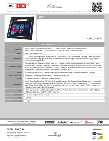 Białołęcka 158E • 03-253 Warszawa • tel.: +48 22 510 14 40 • fax: +48 22 741 69 33 • hotline 24h: +48 22 510 14 79 • e-mail: [email protected] • www.rscautoid.pl R12 SPECYFIKACJA TECHNICZNA Procesor Grafika Wyświetlacz Oprogramowanie Bateria System operacyjny Pamięć Komunikacja Porty Wymiary Waga Gwarancja Intel® Core™ i7 vPro™ processor - 4610Y - 1.7 GHz to 2.9 GHz, 4M Cache, 2 cores (4 threads). Intel® Core™ i5 processor - 4210Y - 1.5 GHz to 1.9 GHz, 3M Cache, 2 cores (4 threads). Intel® HD Graphics 4200 12.5” Wide Viewing Angle Display; Full-HD Resolution (1920 x 1080); Anti-Smudge + Anti-Reflective View Anywhere Display; Capacitive 10-Point Touch; Wacom Digital Pen Input; Intel Display Power Saving Technology (DPST) SnapWorks™ by Motion® Camera App; RFID Sample Reader; Barcode Reader; Motion/Softex OmniPass Security Software (Windows 7); Motion Dashboard (Windows 7); Know Your Motion Tablet (Windows 8.1); Pen and Touch Enabled BIOS Setup; Infineon Security Platform Tools; Motion Tablet Center (Windows 8.1); Microsoft Office - Trial Version (Windows 8.1) Battery life over 9 hours3; Hot swappable Lithium Ion Standard battery with 43WHr capacity Windows® 8.1 Pro 64-bit; Windows® 7 Professional 64-bit1 4 GB or 8 GB DDR3L 1600 MHz SDRAM memory Intel® Dual Band Wireless-AC 7260 Wi-Fi plus Bluetooth® 4.0; Optional Internal Wireless (1 expansion slot) - 4G LTE Mobile Broadband with GNSS (GPS + GLONASS) - Sierra Wireless EM7355 (North America) - Sierra Wireless EM7305 (Rest of World) lub - GPS Module with SBAS (WAAS, EGNOS and MSAS) - Navisys Technology GE-730 (u-blox 7 Docking connector; USB 3.0 port; Optional Serial Port via SlateMate® Module; 3mm Audio I/O jack; HDMI port; SD Card Slot; Micro-SIM Card Slot 328 mm x 205.74 mm x 17 mm 1,34 kg 3 lata Zapewniamy oprogramowanie i materiały eksploatacyjne renomowanych firm EXCELLENCE IN: digital & flexo label printing and converting automated labelling systems supply chain management solutions professional multi-platform services MEMBER OF