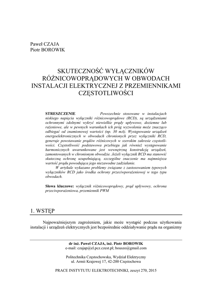 Paweł CZAJA Piotr BOROWIK SKUTECZNOŚĆ WYŁĄCZNIKÓW RÓŻNICOWOPRĄDOWYCH W OBWODACH INSTALACJI ELEKTRYCZNEJ Z PRZEMIENNIKAMI CZĘSTOTLIWOŚCI STRESZCZENIE Powszechnie stosowane w instalacjach niskiego napięcia wyłączniki różnicowoprądowe (RCD), są urządzeniami ochronnymi zdolnymi wykryć niewielkie prądy upływowe, doziemne lub rażeniowe, ale w pewnych warunkach ich próg wyzwolenia może znacząco odbiegać od znamionowej wartości (np. 30 mA). Występowanie urządzeń energoelektronicznych w obwodach chronionych przez wyłączniki RCD, generuje powstawanie prądów różnicowych w szerokim zakresie częstotliwości. Częstotliwość podstawowa przebiegu jak również występowanie harmonicznych uwarunkowane jest wewnętrzną konstrukcją urządzeń, zamontowanych w chronionym obwodzie. Jeżeli wyłącznik RCD ma stanowić skuteczną ochronę uzupełniającą, szczególne znaczenie ma najmniejsza wartość prądu powodująca jego niezawodne zadziałanie. W artykule wykazano problemy związane z zastosowaniem typowych wyłączników RCD jako środka ochrony przeciwporażeniowej w tego typu obwodach. Słowa kluczowe: wyłącznik różnicowoprądowy, prąd upływowy, ochrona przeciwporażeniowa, przemiennik PWM 1. WSTĘP Najpoważniejszym zagrożeniem, jakie może wystąpić podczas użytkowania instalacji i urządzeń elektrycznych jest bezpośrednie oddziaływanie prądu na organizmy dr inż. Paweł CZAJA, inż. Piotr BOROWIK e-mail: [email protected]; [email protected] Politechnika Częstochowska, Wydział Elektryczny ul. Armii Krajowej 17, 42-200 Częstochowa PRACE INSTYTUTU ELEKTROTECHNIKI, zeszyt 270, 2015 110 P. Czaja, P. Borowik żywe. Wystąpienie niekorzystnych zmian patofizjologicznych w organizmie uzależnione jest od wartości i rodzaju prądu rażeniowego oraz od drogi i czasu przepływu. Wystąpienie negatywnych skutków rażenia prądem elektrycznym ocenić można na podstawie raportu nr 479 Międzynarodowej Komisji Elektrotechnicznej [1]. Na rysunku 1 przedstawiono charakterystykę skutków rażenia prądem przemiennym o częstotliwości 15 ÷ 100 Hz, dla najczęściej występujących porażeń, na drodze przepływu prądu, lewa ręka – stopy. Rys. 1. Działanie na organizm ludzki prądu elektrycznego o częstotliwości 15 ÷ 100 Hz przy przepływie prądu na drodze obie stopy – lewa ręka [1] Na rysunku 1 zaznaczono strefy występowania skutków patofizjologicznych w zależności od czasu i wartości prądu rażeniowego. Krzywą b uznaje się za graniczną wartość prądu samouwolnienia, po przekroczeniu której nie jest możliwe samodzielne uwolnienie się rażonego spod napięcia. Zdarzenia zagrażające bezpośrednio życiu występują wówczas, gdy wartości prądu i czasu rażenia przekraczają wartości graniczne wynikające z krzywych c1 – c2 – c3, rozdzielających strefy AC-3 i AC-4. Krzywa c1 wyznacza granicę tolerowanego ryzyka, dopuszczalnego przy stosowaniu środków ochrony przeciwporażeniowej [2]. 2. ZASADY OCHRONY PRZECIWPORAŻENIOWEJ Stosowanie środków ochrony przeciwporażeniowej w instalacjach i urządzeniach niskiego napięcia, ma na celu zapewnienie bezpieczeństwa ich użytkowników. Podstawową zasadą ochrony przed porażeniem prądem elektrycznym zgodnie z normą [3], jest zapewnienie braku dostępu do części czynnych niebezpiecznych w normalnych 111 Skuteczność wyłączników różnicowoprądowych w obwodach instalacji… warunkach użytkowania lub w przypadku pojedynczego uszkodzenia. Zasady ograniczenia dostępności mogą różnić się w zależności od kwalifikacji użytkowników: osoby postronne, poinstruowane, wykwalifikowane. Wszystkie środki ochrony powinny być tak projektowane i wykonywane, aby były skuteczne przez cały okres spodziewanego użytkowania instalacji i urządzeń, zgodnie z ich przeznaczeniem i przy właściwej konserwacji [3]. W instalacjach elektrycznych niskiego napięcia, ochrona przed porażeniem prądem elektrycznym, powinna składać się z odpowiednio dobranego środka ochrony podstawowej i niezależnego środka ochrony przy uszkodzeniu lub wzmocnionego środka ochrony, który zapewnia zarówno ochronę podstawową jak i ochronę przy uszkodzeniu [4]. W warunkach specjalnych, wynikających z przeznaczenia pomieszczenia lub wpływów warunków zewnętrznych, norma [4] nakazuje zastosowanie dodatkowo środków ochrony uzupełniającej. Najczęściej wykorzystywanym środkiem ochrony przy uszkodzeniu w instalacjach niskiego napięcia jest samoczynne wyłączenie zasilania. Ochrona ta polega na spowodowaniu wyłączenia uszkodzonego obwodu lub urządzenia w wymaganym czasie. Najdłuższe, dopuszczalne czasy wyłączenia określone zostały w normie [4]. Zależą one od napięcia instalacji (obwodu, urządzenia) względem ziemi, typu układu sieci zasilającej oraz od rodzaju obwodu i jego maksymalnego prądu. Graniczne czasy wyłączenia dla najbardziej rozpowszechnionych instalacji o napięciu względem ziemi 230 V zestawiono w tabeli 1. TABELA 1 Zestawienie wymagań odnośnie do dopuszczalnego czasu samoczynnego wyłączenia zasilania w instalacjach prądu przemiennego o napięciu względem ziemi 230 V [4] Rodzaj obwodu Układ TN Układ TT Układ IT Obwody odbiorcze o prądzie znamionowym In ≤ 32 A 0,4 s 0,2 s 0,4 s lub 0,2 s Obwody odbiorcze o prądzie znamionowym In > 32 A 5s 1s 5 s lub 1s Obwody rozdzielcze o dowolnym prądzie znamionowym 5s 1s 5 s lub 1s Obwody, w których brak możliwości uzyskania samoczynnego wyłączenia zasilania w wymaganym czasie Miejscowe połączenia wyrównawcze ochronne ograniczające długotrwale utrzymujące się napięcie dotykowe na poziomie dopuszczalnym długotrwale W przypadku wystąpienia dotyku bezpośredniego części niebezpiecznej w układzie typu TN-S i TT lub dotyku pośredniego w układzie TT, prąd rażeniowy przepływa przez ciało człowieka, rezystancję obuwia i stanowiska, które znacząco ograniczają jego wartość. W takich w