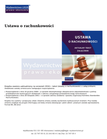 Ustawa o rachunkowości Książka zawiera uaktualniony na wrzesień 2016 r. tekst Ustawy o rachunkowości z załącznikami. Dodatkowo zostały umieszczone następujące rozporządzenia: ● ● Rozporządzenie z dnia 16 grudnia 2008 r. w sprawie obowiązkowego ubezpieczenia odpowiedzialności cywilnej przedsiębiorców wykonujących działalność z zakresu usługowego prowadzenia ksiąg rachunkowych Rozporządzenie z dnia 28 listopada 2001 r. w sprawie zakresu działania i sposobu organizacji Komitetu Standardów Rachunkowości. Książka ma czytelny i przejrzysty układ. Ostatnie zmiany zostały wyróżnione wytłuszczonym drukiem. Przy każdej zmianie znajduje się przypis informujący od kiedy zmiana obowiązuje i jakim aktem prawnym została wprowadzona. Format B5, 88 stron