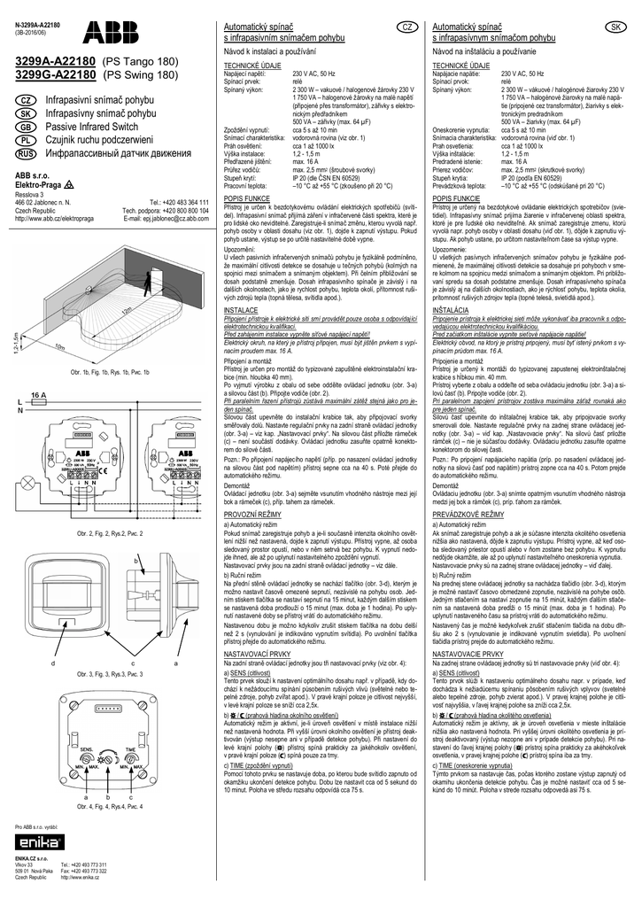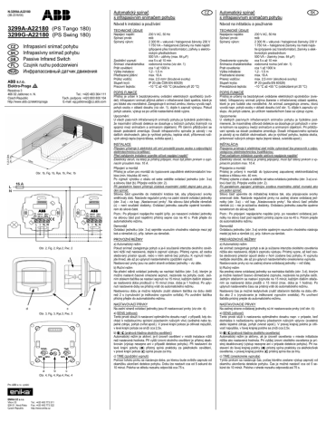 Automatický spínač s infrapasivním snímačem pohybu N-3299A-A22180 (3B-2016/06) 3299A-A22180 (PS Tango 180) 3299G-A22180 (PS Swing 180) CZ SK GB PL RUS Infrapasivní snímač pohybu Infrapasívny snímač pohybu Passive Infrared Switch Czujnik ruchu podczerwieni Инфрапассивный датчик движения ABB s.r.o. Elektro-Praga Resslova 3 466 02 Jablonec n. N. Czech Republic http://www.abb.cz/elektropraga Tel.: +420 483 364 111 Tech. podpora: +420 800 800 104 E-mail: [email protected] Obr. 1b, Fig. 1b, Rys. 1b, Рис. 1b Obr. 2, Fig. 2, Rys.2, Рис. 2 b d c Obr. 3, Fig. 3, Rys.3, Рис. 3 a b c Obr. 4, Fig. 4, Rys.4, Рис. 4 Pro ABB s.r.o. vyrábí: ENIKA.CZ s.r.o. Vlkov 33 509 01 Nová Paka Czech Republic Tel.: +420 493 773 311 Fax: +420 493 773 322 http://www.enika.cz a CZ Automatický spínač s infrapasívnym snímačom pohybu Návod k instalaci a používání Návod na inštaláciu a používanie TECHNICKÉ ÚDAJE TECHNICKÉ ÚDAJE Napájecí napětí: Spínací prvek: Spínaný výkon: Zpoždění vypnutí: Snímací charakteristika: Práh osvětlení: Výška instalace: Předřazené jištění: Průřez vodičů: Stupeň krytí: Pracovní teplota: 230 V AC, 50 Hz relé 2 300 W – vakuové / halogenové žárovky 230 V 1 750 VA – halogenové žárovky na malé napětí (připojené přes transformátor), zářivky s elektronickým předřadníkem 500 VA – zářivky (max. 64 µF) cca 5 s až 10 min vodorovná rovina (viz obr. 1) cca 1 až 1000 lx 1,2 - 1,5 m max. 16 A max. 2,5 mm2 (šroubové svorky) IP 20 (dle ČSN EN 60529) –10 °C až +55 °C (zkoušeno při 20 °C) SK Napájacie napätie: Spínací prvok: Spínaný výkon: 230 V AC, 50 Hz relé 2 300 W – vákuové / halogénové žiarovky 230 V 1 750 VA – halogénové žiarovky na malé napätie (pripojené cez transformátor), žiarivky s elektronickým predradníkom 500 VA – žiarivky (max. 64 µF) Oneskorenie vypnutia: cca 5 s až 10 min Snímacia charakteristika: vodorovná rovina (viď obr. 1) Prah osvetlenia: cca 1 až 1000 lx Výška inštalácie: 1,2 - 1,5 m Predradené istenie: max. 16 A Prierez vodičov: max. 2,5 mm2 (skrutkové svorky) Stupeň krytia: IP 20 (podľa EN 60529) Prevádzková teplota: –10 °C až +55 °C (odskúšané pri 20 °C) POPIS FUNKCE POPIS FUNKCIE Přístroj je určen k bezdotykovému ovládání elektrických spotřebičů (svítidel). Infrapasivní snímač přijímá záření v infračervené části spektra, které je pro lidské oko neviditelné. Zaregistruje-li snímač změnu, kterou vyvolá např. pohyb osoby v oblasti dosahu (viz obr. 1), dojde k zapnutí výstupu. Pokud pohyb ustane, výstup se po určité nastavitelné době vypne. Upozornění: U všech pasivních infračervených snímačů pohybu je fyzikálně podmíněno, že maximální citlivosti detekce se dosahuje u tečných pohybů (kolmých na spojnici mezi snímačem a snímaným objektem). Při čelním přibližování se dosah podstatně zmenšuje. Dosah infrapasivního spínače je závislý i na dalších okolnostech, jako je rychlost pohybu, teplota okolí, přítomnost rušivých zdrojů tepla (topná tělesa, svítidla apod.). Prístroj je určený na bezdotykové ovládanie elektrických spotrebičov (svietidiel). Infrapasívny snímač prijíma žiarenie v infračervenej oblasti spektra, ktoré je pre ľudské oko neviditeľné. Ak snímač zaregistruje zmenu, ktorú vyvolá napr. pohyb osoby v oblasti dosahu (viď obr. 1), dôjde k zapnutiu výstupu. Ak pohyb ustane, po určitom nastaviteľnom čase sa výstup vypne. Upozornenie: U všetkých pasívnych infračervených snímačov pohybu je fyzikálne podmienené, že maximálnej citlivosti detekcie sa dosahuje pri pohyboch v smere kolmom na spojnicu medzi snímačom a snímaným objektom. Pri približovaní spredu sa dosah podstatne zmenšuje. Dosah infrapasívneho spínača je závislý aj na ďalších okolnostiach, ako je rýchlosť pohybu, teplota okolia, prítomnosť rušivých zdrojov tepla (topné telesá, svietidlá apod.). INSTALACE INŠTALÁCIA Připojení přístroje k elektrické síti smí provádět pouze osoba s odpovídající elektrotechnickou kvalifikací. Před zahájením instalace vypněte síťové napájecí napětí! Elektrický okruh, na který je přístroj připojen, musí být jištěn prvkem s vypínacím proudem max. 16 A. Připojení a montáž Přístroj je určen pro montáž do typizované zapuštěné elektroinstalační krabice (min. hloubka 40 mm). Po vyjmutí výrobku z obalu od sebe oddělte ovládací jednotku (obr. 3-a) a silovou část (b). Připojte vodiče (obr. 2). Při paralelním řazení přístrojů zůstává maximální zátěž stejná jako pro jeden spínač. Silovou část upevněte do instalační krabice tak, aby připojovací svorky směřovaly dolů. Nastavte regulační prvky na zadní straně ovládací jednotky (obr. 3-a) – viz kap. „Nastavovací prvky“. Na silovou část přiložte rámeček (c) – není součástí dodávky. Ovládací jednotku zasuňte opatrně konektorem do silové části. Pozn.: Po připojení napájecího napětí (příp. po nasazení ovládací jednotky na silovou část pod napětím) přístroj sepne cca na 40 s. Poté přejde do automatického režimu. Demontáž Ovládací jednotku (obr. 3-a) sejměte vsunutím vhodného nástroje mezi její bok a rámeček (c), příp. tahem za rámeček. Pripojenie prístroja k elektrickej sieti môže vykonávať iba pracovník s odpovedajúcou elektrotechnickou kvalifikáciou. Pred začiatkom inštalácie vypnite sieťové napájacie napätie! Elektrický obvod, na ktorý je prístroj pripojený, musí byť istený prvkom s vypínacím prúdom max. 16 A. Pripojenie a montáž Prístroj je určený k montáži do typizovanej zapustenej elektroinštalačnej krabice s hĺbkou min. 40 mm. Prístroj vyberte z obalu a oddeľte od seba ovládaciu jednotku (obr. 3-a) a silovú časť (b). P