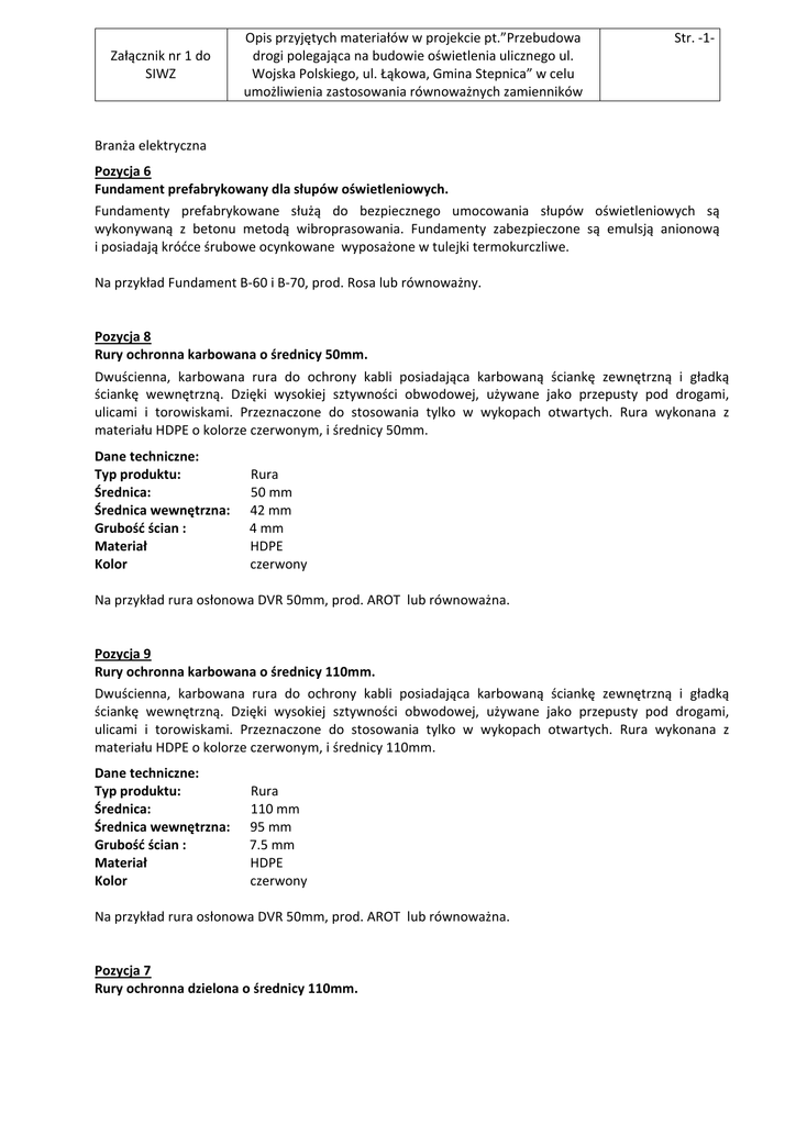 Załącznik nr 1 do SIWZ Opis przyjętych materiałów w projekcie pt.”Przebudowa drogi polegająca na budowie oświetlenia ulicznego ul. Wojska Polskiego, ul. Łąkowa, Gmina Stepnica” w celu umożliwienia zastosowania równoważnych zamienników Str. ‐1‐ Branża elektryczna Pozycja 6 Fundament prefabrykowany dla słupów oświetleniowych. Fundamenty prefabrykowane służą do bezpiecznego umocowania słupów oświetleniowych są wykonywaną z betonu metodą wibroprasowania. Fundamenty zabezpieczone są emulsją anionową i posiadają króćce śrubowe ocynkowane wyposażone w tulejki termokurczliwe. Na przykład Fundament B‐60 i B‐70, prod. Rosa lub równoważny. Pozycja 8 Rury ochronna karbowana o średnicy 50mm. Dwuścienna, karbowana rura do ochrony kabli posiadająca karbowaną ściankę zewnętrzną i gładką ściankę wewnętrzną. Dzięki wysokiej sztywności obwodowej, używane jako przepusty pod drogami, ulicami i torowiskami. Przeznaczone do stosowania tylko w wykopach otwartych. Rura wykonana z materiału HDPE o kolorze czerwonym, i średnicy 50mm. Dane techniczne: Typ produktu: Rura Średnica: 50 mm Średnica wewnętrzna: 42 mm Grubość ścian : 4 mm Materiał HDPE Kolor czerwony Na przykład rura osłonowa DVR 50mm, prod. AROT lub równoważna. Pozycja 9 Rury ochronna karbowana o średnicy 110mm. Dwuścienna, karbowana rura do ochrony kabli posiadająca karbowaną ściankę zewnętrzną i gładką ściankę wewnętrzną. Dzięki wysokiej sztywności obwodowej, używane jako przepusty pod drogami, ulicami i torowiskami. Przeznaczone do stosowania tylko w wykopach otwartych. Rura wykonana z materiału HDPE o kolorze czerwonym, i średnicy 110mm. Dane techniczne: Typ produktu: Rura Średnica: 110 mm Średnica wewnętrzna: 95 mm Grubość ścian : 7.5 mm Materiał HDPE Kolor czerwony Na przykład rura osłonowa DVR 50mm, prod. AROT lub równoważna. Pozycja 7 Rury ochronna dzielona o średnicy 110mm. Załącznik nr 1 do SIWZ Opis przyjętych materiałów w projekcie pt.”Przebudowa drogi polegająca na budowie oświetlenia ulicznego ul. Wojska Polskiego, ul. Łąkowa, Gmina Stepnica” w celu umożliwienia zastosowania równoważnych zamienników Str. ‐2‐ Dzielona rura do ochrony kabli. Służy do ochrony istniejących kabli oraz naprawy uszkodzonych kanalizacji kablowych oraz stosowana pod drogami, ulicami i torowiskami. Rura wykonana z materiału HDPE o kolorze czerwonym, i średnicy 110mm. Dane techniczne: Typ produktu: Rura Średnica: 110 mm Średnica wewnętrzna: 100 mm Grubość ścian : 5 mm Materiał HDPE Kolor czerwony Na przykład rura osłonowa A 110 PS prod. AROT lub równoważna. Pozycja 22 Oprawa ledowa o mocy 68W. Oprawa ledowa z obudową wykonaną z aluminium, optyką z metalizowanego poliwęglanu, kloszem z szkła hartowanego o grubości 4mm. Oprawa montowana na wysięgniku lub bezpośrednio na szczycie słupa o średnicy zakończenia Ø60 ÷ Ø76 mm . Oprawa z regulacją kąta nachylenia oprawy w zakresie od 0° do 15° co 5° przy montażu bezpośrednio na słupie oraz od 0° do ‐15° co 5° przy montażu na wysięgniku bocznym. Dane techniczne: Moc Współczynnik mocy: Żywotność: Temperatura barwy: Krzywa rozsyłu oprawy: Dodatkowo: 68W, > 0,98, 60000 hr, LM80 %, Ta=25 °C, IF=350 mA 150000 hr, LM70 %, Ta=25 °C, IF=350 mA 6000°K Oprawy wyposażone są w elektroniczny statecznik pozwalający regulować strumień wyjściowy. Innowacyjny system sterowania – regulacja strumienia świetlnego według czterech programów: − oprawa fabrycznie ustawiona na stałą żądną jasność świecenia, Załącznik nr 1 do SIWZ Opis przyjętych materiałów w projekcie pt.”Przebudowa drogi polegająca na budowie oświetlenia ulicznego ul. Wojska Polskiego, ul. Łąkowa, Gmina Stepnica” w celu umożliwienia zastosowania równoważnych zamienników Str. ‐3‐ − fabrycznie programowana funkcja, której określone parametry pozwalają na załączanie, wyłączanie lub zmniejszanie jasności świecenia oprawy o określonych porach uwzględniając okres obniżonego poboru energii, − program pozwalający za pomocą wbudowanego odbiornika podczerwieni na dostosowywanie sposobu świecenia oprawy do indywidualnych potrzeb w miejscu zainstalowanej oprawy, PLM – funkcja pozwalająca połączyć grupę opraw w zdalny system telemetryczny, umożliwiający sterowanie i monitorowanie każdej z opraw z dowolnego miejsca. Na przykład oprawa oświetleniowa LED‐in 54 prod. Rosa lub równoważna. Pozycja 11 Tabliczka bezpiecznikowa słupowa. Tabliczka bezpiecznikowa służąca do podłączenia kabli zasilających oraz zabezpieczenia elektrycznego opraw montowanych na słupach ulicznych i parkowych. Do zastosowania we wszystkich słupach, których średnica wewnętrzna jest większa niż 95 mm. Tabliczka składa się z: − zintegrowanej listwy zaciskowej wykonanej z PBT (politereftalan butylenu), tworzywa o wysokich parametrach izolacyjnych i dużej wytrzymałości mechanicznej, − pokrywy złącza oraz osłony zacisków i przewodów wykonanych z poliwęglanu przezroczystego, − podstawy złącza wykonana z poliwęglanu wzmocnionego włóknem szklanym Tabliczka bezpiecznikowa słupowa przystosowana jest fabrycznie do mocowana do szyny aluminiowej we wnęce na tylnej ścianie konstrukcji słupa dwoma śrubami M6. Wymiary obudowy tabliczki bezpiecznikowej słupowej: 274 mm x 90 mm x 74 mm. Dane techniczne: Stopień ochrony: IP 54, Klasa izolacji: II, Napięcie znamionowe: 500 V, Prąd znamionowy: 80 A, Wkładka topikowa: D01/E14, 2‐16 A, 400 V, AC Przekroje kabli przyłączanych: od 4 x 10 mm² do 4 x 35 mm² Na przykład tabliczka bezpiecznikowa słupowa TB‐1 prod. Rosa lub równoważna. Pozycja 20 Słup aluminiowy 6 metrowy. Słup aluminiowy, wykonany ze stopu EN AW 6060, cylindryczno‐stożkowy bezszwowy o wysokości całkowitej 6m. Słup anodowany na kolor oliwkowy C‐33 o grubości anody min. 20 mikronów. Średnica słupa przy podstawie to