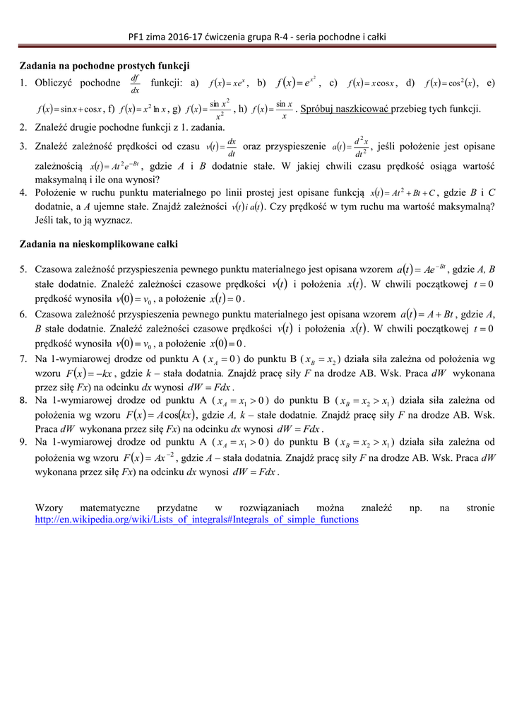 PF1 zima 2016-17 ćwiczenia grupa R-4 - seria pochodne i całki Zadania na pochodne prostych funkcji 1. Obliczyć pochodne df dx funkcji: a) f x sin x cos x , f) f x x 2 ln x , g) f x f x xe x , b) f x e x , c) sin x 2 sin x x x 2 , h) f x 2 f x x cos x , d) f x cos 2 x , e) . Spróbuj naszkicować przebieg tych funkcji. 2. Znaleźć drugie pochodne funkcji z 1. zadania. 3. Znaleźć zależność prędkości od czasu vt dx dt oraz przyspieszenie at d 2x dt 2 , jeśli położenie jest opisane zależnością xt At 2 e Bt , gdzie A i B dodatnie stałe. W jakiej chwili czasu prędkość osiąga wartość maksymalną i ile ona wynosi? 4. Położenie w ruchu punktu materialnego po linii prostej jest opisane funkcją xt At 2 Bt C , gdzie B i C dodatnie, a A ujemne stałe. Znajdź zależności vt i at . Czy prędkość w tym ruchu ma wartość maksymalną? Jeśli tak, to ją wyznacz. Zadania na nieskomplikowane całki 5. Czasowa zależność przyspieszenia pewnego punktu materialnego jest opisana wzorem at Ae Bt , gdzie A, B stałe dodatnie. Znaleźć zależności czasowe prędkości vt i położenia xt . W chwili początkowej t 0 prędkość wynosiła v0 v0 , a położenie x t 0 . 6. Czasowa zależność przyspieszenia pewnego punktu materialnego jest opisana wzorem a t A Bt , gdzie A, B stałe dodatnie. Znaleźć zależności czasowe prędkości vt i położenia xt . W chwili początkowej t 0 prędkość wynosiła v0 v0 , a położenie x0 0 . 7. Na 1-wymiarowej drodze od punktu A ( x A 0 ) do punktu B ( x B x2 ) działa siła zależna od położenia wg wzoru F x kx , gdzie k – stała dodatnia. Znajdź pracę siły F na drodze AB. Wsk. Praca dW wykonana przez siłę Fx) na odcinku dx wynosi dW Fdx . 8. Na 1-wymiarowej drodze od punktu A ( x A x1 0 ) do punktu B ( xB x2 x1 ) działa siła zależna od położenia wg wzoru F x A coskx , gdzie A, k – stałe dodatnie. Znajdź pracę siły F na drodze AB. Wsk. Praca dW wykonana przez siłę Fx) na odcinku dx wynosi dW Fdx . 9. Na 1-wymiarowej drodze od punktu A ( x A x1 0 ) do punktu B ( xB x2 x1 ) działa siła zależna od położenia wg wzoru F x Ax 2 , gdzie A – stała dodatnia. Znajdź pracę siły F na drodze AB. Wsk. Praca dW wykonana przez siłę Fx) na odcinku dx wynosi dW Fdx . Wzory matematyczne przydatne w rozwiązaniach można znaleźć http://en.wikipedia.org/wiki/Lists_of_integrals#Integrals_of_simple_functions np. na stronie