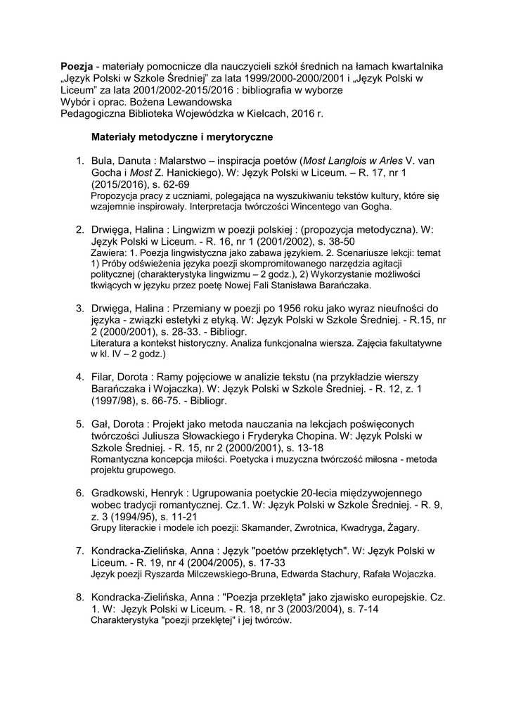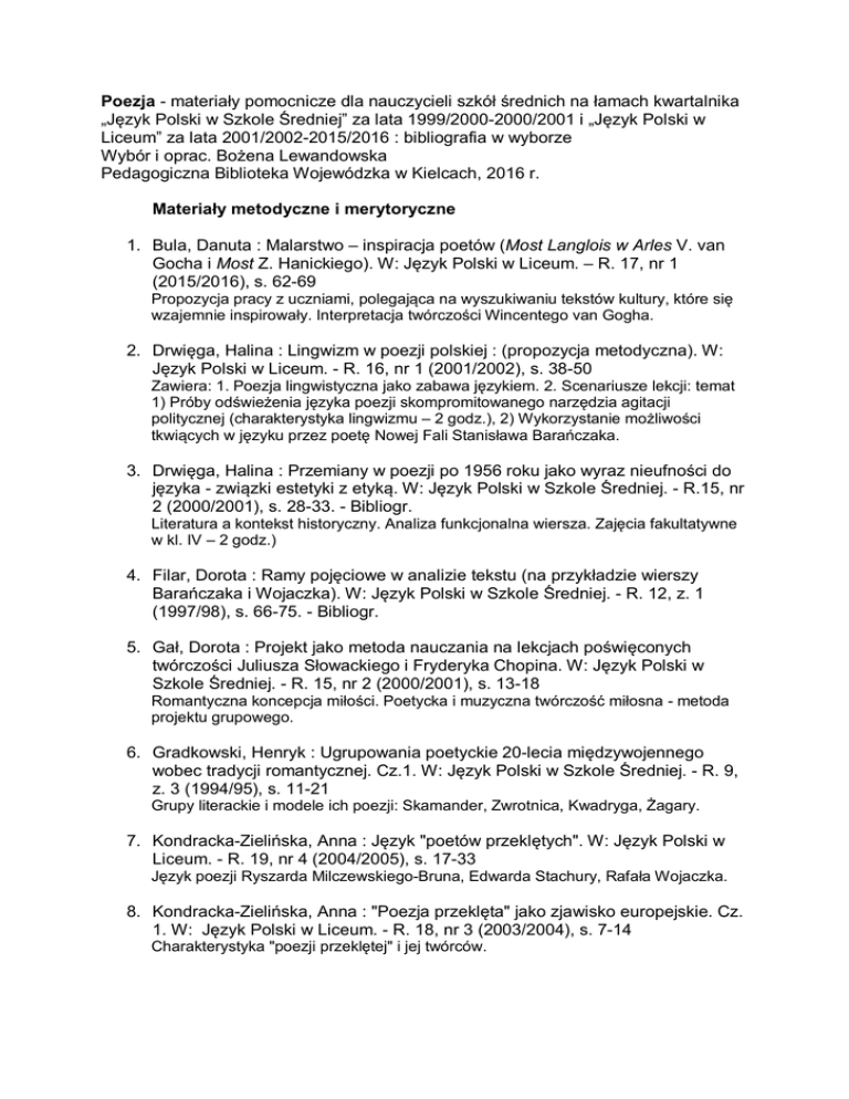 Poezja - materiały pomocnicze dla nauczycieli szkół średnich na łamach kwartalnika „Język Polski w Szkole Średniej” za lata 1999/2000-2000/2001 i „Język Polski w Liceum” za lata 2001/2002-2015/2016 : bibliografia w wyborze Wybór i oprac. Bożena Lewandowska Pedagogiczna Biblioteka Wojewódzka w Kielcach, 2016 r. Materiały metodyczne i merytoryczne 1. Bula, Danuta : Malarstwo – inspiracja poetów (Most Langlois w Arles V. van Gocha i Most Z. Hanickiego). W: Język Polski w Liceum. – R. 17, nr 1 (2015/2016), s. 62-69 Propozycja pracy z uczniami, polegająca na wyszukiwaniu tekstów kultury, które się wzajemnie inspirowały. Interpretacja twórczości Wincentego van Gogha. 2. Drwięga, Halina : Lingwizm w poezji polskiej : (propozycja metodyczna). W: Język Polski w Liceum. - R. 16, nr 1 (2001/2002), s. 38-50 Zawiera: 1. Poezja lingwistyczna jako zabawa językiem. 2. Scenariusze lekcji: temat 1) Próby odświeżenia języka poezji skompromitowanego narzędzia agitacji politycznej (charakterystyka lingwizmu – 2 godz.), 2) Wykorzystanie możliwości tkwiących w języku przez poetę Nowej Fali Stanisława Barańczaka. 3. Drwięga, Halina : Przemiany w poezji po 1956 roku jako wyraz nieufności do języka - związki estetyki z etyką. W: Język Polski w Szkole Średniej. - R.15, nr 2 (2000/2001), s. 28-33. - Bibliogr. Literatura a kontekst historyczny. Analiza funkcjonalna wiersza. Zajęcia fakultatywne w kl. IV – 2 godz.) 4. Filar, Dorota : Ramy pojęciowe w analizie tekstu (na przykładzie wierszy Barańczaka i Wojaczka). W: Język Polski w Szkole Średniej. - R. 12, z. 1 (1997/98), s. 66-75. - Bibliogr. 5. Gał, Dorota : Projekt jako metoda nauczania na lekcjach poświęconych twórczości Juliusza Słowackiego i Fryderyka Chopina. W: Język Polski w Szkole Średniej. - R. 15, nr 2 (2000/2001), s. 13-18 Romantyczna koncepcja miłości. Poetycka i muzyczna twórczość miłosna - metoda projektu grupowego. 6. Gradkowski, Henryk : Ugrupowania poetyckie 20-lecia międzywojennego wobec tradycji romantycznej. Cz.1. W: Język Polski w Szkole Średniej. - R. 9, z. 3 (1994/95), s. 11-21 Grupy literackie i modele ich poezji: Skamander, Zwrotnica, Kwadryga, Żagary. 7. Kondracka-Zielińska, Anna : Język "poetów przeklętych". W: Język Polski w Liceum. - R. 19, nr 4 (2004/2005), s. 17-33 Język poezji Ryszarda Milczewskiego-Bruna, Edwarda Stachury, Rafała Wojaczka. 8. Kondracka-Zielińska, Anna : "Poezja przeklęta" jako zjawisko europejskie. Cz. 1. W: Język Polski w Liceum. - R. 18, nr 3 (2003/2004), s. 7-14 Charakterystyka "poezji przeklętej" i jej twórców. 9. Kondracka-Zielińska, Anna : "Poezja przeklęta" jako zjawisko europejskie. Cz. 2. W: Język Polski w Liceum. - R. 18, nr 4 (2003/2004), s. 7-15 Charakterystyka "poetów przeklętych". 10. Marczuk, Anna : Kant i Kafka w filozoficznym zwierciadle poezji. W: Język Polski w Szkole Średniej. - R. 15, nr 3 (2000/2001), s.66-76 Szkice dwóch tematów lekcji: 1. Wielcy filozofowie, jak zwykli ludzie, również są śmiertelni. 2. Czy wytoczony nam proces życia może dawać nadzieję? 11. Niewiadomski, Andrzej : Od ,,barbarzyńców’’ i ,,klasycystów’’ do ,,ponowoczesnych’’. Poezja lat dziewięćdziesiątych - druga faza. W: Język Polski w Szkole Średniej. - R.14, nr 4 (1999/2000), s. 66-76 12. Poturała, Wioletta : Pisarze i poeci w Internecie : przegląd wybranych stron. W: Język Polski w Liceum. - R. 21, nr 1 (2006/2007), s. 44-51 13. Poturała, Wioletta : Recytacja sztuką tylko dla wybranych w szkole ponadgimnazjalnej? W: Język Polski w Liceum. – R. 13, nr 3 (2011/2012), s. 55-60 Miejsce recytacji w nowej podstawie programowej. Umiejętności jakie rozwija w sobie uczeń poprzez ćwiczenia recytatorskie. Zadania nauczyciela i pomysły na uatrakcyjnienie lekcji recytacji. 14. Żukowska-Rumin, Irena : O Panu Bogu, który patrzy zza pieca, czyli co zostałoby z poezji, gdyby nie związki frazeologiczne : (propozycja metodyczna). W: Język Polski w Liceum. - R. 16, nr 4 (2001/2002), s. 30-33 Propozycja zajęć z wykorzystaniem utworów: "Nazywam się ikar" - Piotr Ciężkowski; „Pies pożegnalny" - Miron Białoszewski; "Piosenka o trzech wesołych aniołach" Konstanty Ildefons Gałczyński. Asnyk Adam „Do młodych” 15. Narkiewicz, Aldona : Adama Asnyka Do młodych - nieciekawe pozytywistyczne wierszydło? (szkic interpretacyjno-metodyczny). W: Język Polski w Liceum. - R. 18, nr 1 (2003/2004), s. 27-35 Baczyński Krzysztof Kamil 16. Grodecka, Ewa : Różne odsłony poezji. W: Język Polski w Liceum. – R. 17, nr 2 (2015/2016), s. 100-105 Konteksty i interteksty, czyli klucz do zrozumienia poezji S. Barańczaka. Tradycjonalizm w pigułce, czyli o sztuce czytania poezji K. K. Baczyńskiego. Neolingwiści, czyli próby odnalezienia się poetów w nowej rzeczywistości. 17. Zroślak, Paula : Brytyjski model pracy z tekstem lirycznym obecny na lekcji języka polskiego w liceum. W: Język Polski w Liceum. – R. 16, nr 2 (2014/2015), s. 89-106 Prezentacja pracy z tekstem wiersza K. K. Baczyńskiego w oparciu o brytyjski model edukacji. Baczyński Krzysztof Kamil „Wróble” 18. Gronek, Barbara : Baczyńskiego i Barańczaka dwugłos w sprawie śniegu. W: Język Polski w Liceum. - R. 23, nr 4 (2008/2009), s. 47-55 Interpretacja porównawcza wierszy "Wróble" K. K. Baczyńskiego i XII liryku z "Podróży zimowej" S. Barańczaka. Barańczak Stanisław 19. Grodecka, Ewa : Różne odsłony poezji. W: Język Polski w Liceum. – R. 17, nr 2 (2015/2016), s. 100-105 Konteksty i interteksty, czyli klucz do zrozumienia poezji S. Barańczaka. Tradycjonalizm w pigułce, czyli o sztuce czytania poezji K. K. Baczyńskiego. Neolingwiści, czyli próby odnalezienia się poetów w nowej rzeczywistości. Barańczak Stanisław „Podróż zimowa” (XII liryk) 20. Gronek, Barbara : Baczyńskiego i Barańczaka dwugłos w sprawie śniegu. W: Język Polski w Liceum. - R. 23, nr 4 (2008/2009), s. 47-55 Interpretacj