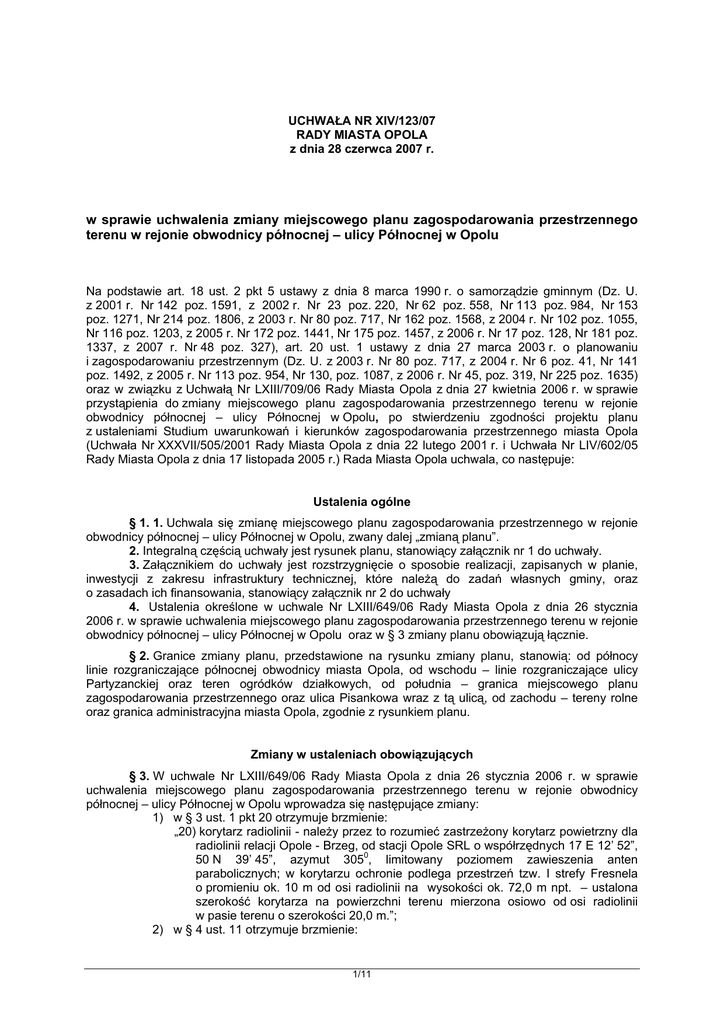 UCHWAŁA NR XIV/123/07 RADY MIASTA OPOLA z dnia 28 czerwca 2007 r. w sprawie uchwalenia zmiany miejscowego planu zagospodarowania przestrzennego terenu w rejonie obwodnicy północnej – ulicy Północnej w Opolu Na podstawie art. 18 ust. 2 pkt 5 ustawy z dnia 8 marca 1990 r. o samorządzie gminnym (Dz. U. z 2001 r. Nr 142 poz. 1591, z 2002 r. Nr 23 poz. 220, Nr 62 poz. 558, Nr 113 poz. 984, Nr 153 poz. 1271, Nr 214 poz. 1806, z 2003 r. Nr 80 poz. 717, Nr 162 poz. 1568, z 2004 r. Nr 102 poz. 1055, Nr 116 poz. 1203, z 2005 r. Nr 172 poz. 1441, Nr 175 poz. 1457, z 2006 r. Nr 17 poz. 128, Nr 181 poz. 1337, z 2007 r. Nr 48 poz. 327), art. 20 ust. 1 ustawy z dnia 27 marca 2003 r. o planowaniu i zagospodarowaniu przestrzennym (Dz. U. z 2003 r. Nr 80 poz. 717, z 2004 r. Nr 6 poz. 41, Nr 141 poz. 1492, z 2005 r. Nr 113 poz. 954, Nr 130, poz. 1087, z 2006 r. Nr 45, poz. 319, Nr 225 poz. 1635) oraz w związku z Uchwałą Nr LXIII/709/06 Rady Miasta Opola z dnia 27 kwietnia 2006 r. w sprawie przystąpienia do zmiany miejscowego planu zagospodarowania przestrzennego terenu w rejonie obwodnicy północnej – ulicy Północnej w Opolu, po stwierdzeniu zgodności projektu planu z ustaleniami Studium uwarunkowań i kierunków zagospodarowania przestrzennego miasta Opola (Uchwała Nr XXXVII/505/2001 Rady Miasta Opola z dnia 22 lutego 2001 r. i Uchwała Nr LIV/602/05 Rady Miasta Opola z dnia 17 listopada 2005 r.) Rada Miasta Opola uchwala, co następuje: Ustalenia ogólne § 1. 1. Uchwala się zmianę miejscowego planu zagospodarowania przestrzennego w rejonie obwodnicy północnej – ulicy Północnej w Opolu, zwany dalej „zmianą planu”. 2. Integralną częścią uchwały jest rysunek planu, stanowiący załącznik nr 1 do uchwały. 3. Załącznikiem do uchwały jest rozstrzygnięcie o sposobie realizacji, zapisanych w planie, inwestycji z zakresu infrastruktury technicznej, które należą do zadań własnych gminy, oraz o zasadach ich finansowania, stanowiący załącznik nr 2 do uchwały 4. Ustalenia określone w uchwale Nr LXIII/649/06 Rady Miasta Opola z dnia 26 stycznia 2006 r. w sprawie uchwalenia miejscowego planu zagospodarowania przestrzennego terenu w rejonie obwodnicy północnej – ulicy Północnej w Opolu oraz w § 3 zmiany planu obowiązują łącznie. § 2. Granice zmiany planu, przedstawione na rysunku zmiany planu, stanowią: od północy linie rozgraniczające północnej obwodnicy miasta Opola, od wschodu – linie rozgraniczające ulicy Partyzanckiej oraz teren ogródków działkowych, od południa – granica miejscowego planu zagospodarowania przestrzennego oraz ulica Pisankowa wraz z tą ulicą, od zachodu – tereny rolne oraz granica administracyjna miasta Opola, zgodnie z rysunkiem planu. Zmiany w ustaleniach obowiązujących § 3. W uchwale Nr LXIII/649/06 Rady Miasta Opola z dnia 26 stycznia 2006 r. w sprawie uchwalenia miejscowego planu zagospodarowania przestrzennego terenu w rejonie obwodnicy północnej – ulicy Północnej w Opolu wprowadza się następujące zmiany: 1) w § 3 ust. 1 pkt 20 otrzymuje brzmienie: „20) korytarz radiolinii - należy przez to rozumieć zastrzeżony korytarz powietrzny dla radiolinii relacji Opole - Brzeg, od stacji Opole SRL o współrzędnych 17 E 12’ 52”, 50 N 39’ 45”, azymut 3050, limitowany poziomem zawieszenia anten parabolicznych; w korytarzu ochronie podlega przestrzeń tzw. I strefy Fresnela o promieniu ok. 10 m od osi radiolinii na wysokości ok. 72,0 m npt. – ustalona szerokość korytarza na powierzchni terenu mierzona osiowo od osi radiolinii w pasie terenu o szerokości 20,0 m.”; 2) w § 4 ust. 11 otrzymuje brzmienie: 1/11 „11. Ustala się zakaz lokalizacji w obszarze planu obiektów usług i przemysłu uciążliwego, powodującego przekroczenia dopuszczalnych wartości zanieczyszczeń poza granice nieruchomości będącej własnością inwestora prowadzącego daną działalność przemysłową.”; 3) w § 6 dodaje się ust. 9 w brzmieniu: „9. w przypadku objęcia terenów oznaczonych numerami 1, 2, 3, 5, 6, 7, 8, 28, 29, 30, 32 wałbrzyską specjalną strefą ekonomiczną, obowiązują ustalenia ustawy i przepisów wykonawczych, dotyczących tej strefy.”; 4) w § 6 ust. 5 dodaje się pkt 10 w brzmieniu: „10) dopuszcza się na terenach ZZ, ZI, (ZK), (ZP), WS, (WSr) jako przeznaczenie towarzyszące lokalizację pompowni ścieków sanitarnych z zachowaniem strefy ochrony sanitarnej wg przepisów szczególnych.”; 5) w § 6 ust. 8 pkt 2 otrzymuje brzmienie: „2) E.. – tereny urządzeń elektroenergetycznych, jak: Egpz - główny punkt zasilania energetycznego (GPZ) – jako przeznaczenie podstawowe, (Et) – stacje transformatorowe kontenerowe i wbudowane- jako przeznaczenie towarzyszące.”; 6) w § 7 ust. 6 otrzymuje brzmienie: „6. Ustala się na terenach przeznaczenia podstawowego zasadę lokalizowania jako przeznaczenia towarzyszącego stref głównych placów postojowych - (KP) o ilości miejsc parkingowych zapewniającej pełne potrzeby użytkowe danego terenu, usytuowanych od strony wjazdów z publicznych ulic.”; 7) w § 8 ust. 2 otrzymuje brzmienie: „2. Ustala się zakaz realizacji przedsięwzięć uciążliwych dla środowiska, zgodnie z zasadą określoną w § 4 ust. 11.”; 8) w § 8 dodaje się ust. 9 w brzmieniu: „9. Ustala się zakaz objęcia części lub całości obszaru planu strefą przemysłową, o której mowa w przepisach o ochronie środowiska.”; 9) w § 10 ust. 3 pkt 4 otrzymuje brzmienie: „4) elewacje budynków i forma architektoniczna budowli lokalizowanych i eksponowanych od strony przestrzeni publicznych powinny być kształtowane starannie, a od strony obwodnicy północnej, obwodnicy południowej oraz ulic Partyzanckiej, Północnej –bis, oznaczonych numerami - 100 - 108 powinny mieć charakter reprezentacyjny; nie dopuszcza się lokalizacji obiektów zaplecza gospodarczego od strony przestrzeni publicznych.”; 10) § 12 otrzymuje brzmienie: „§ 12