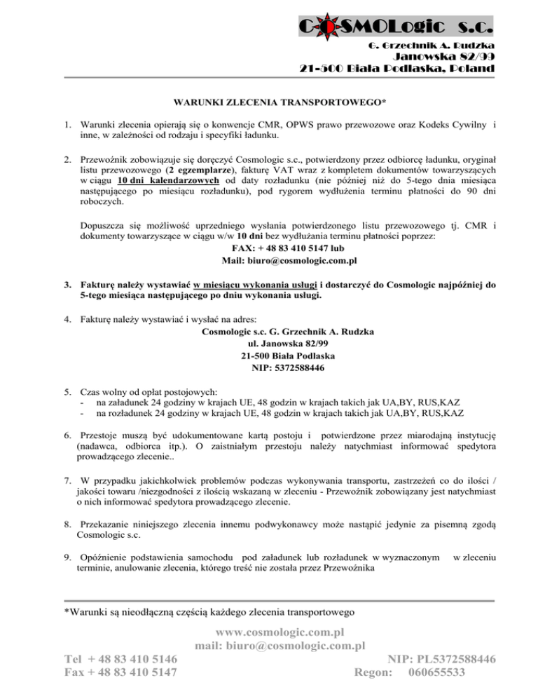 G. Grzechnik A. Rudzka Janowska 82/99 21-500 Biała Podlaska, Poland WARUNKI ZLECENIA TRANSPORTOWEGO* 1. Warunki zlecenia opierają się o konwencje CMR, OPWS prawo przewozowe oraz Kodeks Cywilny i inne, w zależności od rodzaju i specyfiki ładunku. 2. Przewoźnik zobowiązuje się doręczyć Cosmologic s.c., potwierdzony przez odbiorcę ładunku, oryginał listu przewozowego (2 egzemplarze), fakturę VAT wraz z kompletem dokumentów towarzyszących w ciągu 10 dni kalendarzowych od daty rozładunku (nie później niż do 5-tego dnia miesiąca następującego po miesiącu rozładunku), pod rygorem wydłużenia terminu płatności do 90 dni roboczych. Dopuszcza się możliwość uprzedniego wysłania potwierdzonego listu przewozowego tj. CMR i dokumenty towarzyszące w ciągu w/w 10 dni bez wydłużania terminu płatności poprzez: FAX: + 48 83 410 5147 lub Mail: [email protected] 3. Fakturę należy wystawiać w miesiącu wykonania usługi i dostarczyć do Cosmologic najpóźniej do 5-tego miesiąca następującego po dniu wykonania usługi. 4. Fakturę należy wystawiać i wysłać na adres: Cosmologic s.c. G. Grzechnik A. Rudzka ul. Janowska 82/99 21-500 Biała Podlaska NIP: 5372588446 5. Czas wolny od opłat postojowych: - na załadunek 24 godziny w krajach UE, 48 godzin w krajach takich jak UA,BY, RUS,KAZ - na rozładunek 24 godziny w krajach UE, 48 godzin w krajach takich jak UA,BY, RUS,KAZ 6. Przestoje muszą być udokumentowane kartą postoju i potwierdzone przez miarodajną instytucję (nadawca, odbiorca itp.). O zaistniałym przestoju należy natychmiast informować spedytora prowadzącego zlecenie.. 7. W przypadku jakichkolwiek problemów podczas wykonywania transportu, zastrzeżeń co do ilości / jakości towaru /niezgodności z ilością wskazaną w zleceniu - Przewoźnik zobowiązany jest natychmiast o nich informować spedytora prowadzącego zlecenie. 8. Przekazanie niniejszego zlecenia innemu podwykonawcy może nastąpić jedynie za pisemną zgodą Cosmologic s.c. 9. Opóźnienie podstawienia samochodu pod załadunek lub rozładunek w wyznaczonym terminie, anulowanie zlecenia, którego treść nie została przez Przewoźnika w zleceniu *Warunki są nieodłączną częścią każdego zlecenia transportowego www.cosmologic.com.pl mail: [email protected] Tel + 48 83 410 5146 Fax + 48 83 410 5147 NIP: PL5372588446 Regon: 060655533 G. Grzechnik A. Rudzka Janowska 82/99 21-500 Biała Podlaska, Poland pisemnie zakwestionowana w ciągu 1 godziny od chwili jego otrzymania lub nieterminowe dostarczenie towaru do odbiorcy spowoduje obciążenie Przewoźnika karą w wysokości 20 % frachtu oraz ewentualnymi dodatkowymi kosztami wynikłymi z tego powodu. 10. Za nieterminowe dostarczenie dokumentów Przewoźnikowi zostaje potrącone ewentualne dodatkowe koszty wynikłe z tego powodu. 11. Przewoźnik zobowiązuje się do neutralności wobec klientów Cosmologic s.c. 12. W sprawach spornych sąd właściwy w Białej Podlaskiej 13. Jednorazowe potwierdzenie warunków zlecenia obowiązuje do wszystkich kolejnych zleceń udzielonych Zleceniobiorcy. Oświadczenie: Oświadczamy, że jesteśmy płatnikiem podatku VAT i posiadamy nr NIP: 5372588446. Równocześnie upoważniamy Państwa do wystawiania faktur VAT dla naszej firmy bez naszego podpisu. WARUNKI REALIZACJI PRZEWOZU W OPARCIU O KONWENCJĘ ATP (jeśli dotyczy) Przewoźnik jest zobowiązany do utrzymania w pojeździe temperatury zgodnej ze zleceniem. Potwierdzeniem tego faktu jest wydruk termografu lub brak pisemnej adnotacji odbiorcy o niewłaściwych warunkach przewozu. WARUNKI REALIZACJI PRZEWOZU W OPARCIU O UMOWĘ ADR (jeśli dotyczy) Przewoźnik oświadcza, że pojazd i kierowca spełniają wymagania Umowy ADR oraz że poniesie wszelkie konsekwencje w przypadku realizacji zlecenia pojazdem nie uprawnionym do tego przewozu lub z kierowcą nie posiadającym odpowiednich uprawnień i dokumentów. Zleceniodawca Zleceniobiorca …………………………… /pieczątka, data, podpis/ …………………………… /pieczątka, data, podpis/ *Warunki są nieodłączną częścią każdego zlecenia transportowego www.cosmologic.com.pl mail: [email protected] Tel + 48 83 410 5146 Fax + 48 83 410 5147 NIP: PL5372588446 Regon: 060655533