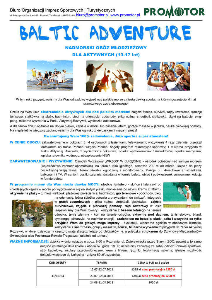 Biuro Organizacji Imprez Sportowych i Turystycznych ul. Międzychodzka 6, 60-371 Poznań, Tel./Fax (61) 8675-623/4, [email protected] www.promotor.pl NADMORSKI OBÓZ MŁODZIEŻOWY DLA AKTYWNYCH (13-17 lat) W tym roku przygotowaliśmy dla Was odjazdowy wyjazd nad polskie morze z niezłą dawką sportu, na którym poczujecie klimat prawdziwego życia obozowego! Czeka na Was kilka ekstremalnie aktywnych dni nad polskim morzem: zajęcia fitness, survival, rajdy rowerowe, turnieje tenisowe, siatkówka na plaży, badminton, biegi na orientację, podchody, piłka nożna, streetball, siatkówka, skoki na batucie, pingpong, militarne wyzwania w Parku Aktywnej Rozrywki, wycieczka autokarowa. A dla fanów chillu: opalanie na złotym piasku, kąpiele w morzu lub basenie letnim, gorące masaże w jacuzzi, nauka pierwszej pomocy. Na ciepłe letnie wieczory zaplanowaliśmy dla Was ognisko z kiełbaskami i mega imprezy! Gwarantujemy Wam 100% zadowolenia, dużo sportu i super atmosferę! W CENIE OBOZU: zakwaterowanie w pokojach 3 i 4 osobowych z łazienkami, telewizorami; wyżywienie 4 razy dziennie; przejazd autokarem na trasie Poznań-Łukęcin-Poznań; bogaty program rekreacyjno-sportowy; 1 militarna przygoda w Paku Aktywnej Rozrywki; 1 wycieczka autokarowa; opieka wychowawców / instruktorów; opieka medyczna; opieka ratownika wodnego; ubezpieczenie NNW ZAKWATEROWANIE i WYŻYWIENIE: Ośrodek Wczasowy „WRZOS” W ŁUKĘCINIE - ośrodek położony nad samym morzem (województwo zachodniopomorskie), na terenie lasu iglastego, zaledwie 200 m od morza. Dojście do plaży bezkolizyjną aleją leśną. Teren ośrodka ogrodzony i monitorowany. Pokoje 3 i 4-osobowe z łazienkami, balkonami i TV. W cenie 4 posiłki dziennie: śniadania w formie bufetu, obiad i podwieczorek serwowane, kolacja w formie bufetu. W programie mamy dla Was niezła dawkę MOCY: słodkie lenistwo - słońce i fale czyli od chłodzących kąpieli w morzu po wygrzewanie się na złotym piasku (koniecznie po użyciu kremu z filtrem), aktywnie na plaży – turnieje siatkówki plażowej, pierścienica, badminton, gry terenowe - podchody, biegi na orientację, leśna ścieżka zdrowia z przyrządami do ćwiczeń, integracja w grach zespołowych - piłka nożna, streetball, siatkówka, zajęcia survivalowe, zajęcia z pierwszej pomocy, rajd rowerowy w lesie (zapewniamy dla Was rowery), korzystanie z basenu letniego na terenie ośrodka, tenis ziemny - kort na terenie ośrodka, aktywnie pod dachem: tenis stołowy, bilard, cymbergaj, piłkarzyki, na nadmiar energii - szaleństwo na batucie: skoki, salta i wszystko co tylko przyjdzie Wam do głowy!, mega imprezy - dyskoteki, wieczorne ognisko w obozowym klimacie, korzystanie z sali fitness, gorący masaż w jacuzzi, Militarne wyzwania to przygoda w Parku Aktywnej Rozrywki, w której dziewczyny często bywają skuteczniejsze od chłopaków :-), wycieczka autokarem do Dziwnowa-MiędzyzdrojówŚwinoujścia albo Pobierowa-Rewala-Trzęsacza (zależnie od turnusu) WAŻNE INFORMACJE: zbiórka w dniu wyjazdu o godz. 9.00 w Poznaniu, ul. Zwierzyniecka przed Starym ZOO; powrót w to samo miejsce ostatniego dnia kolonii / obozu ok. godz. 18.00; uczestnicy zabierają ze sobą: odzież i obuwie sportowe, strój kąpielowy, okulary przeciwsłoneczne, krem z filtrem, ręczniki, legitymację szkolną; istnieje możliwość dojazdu własnego do Łukęcina - zniżka 60 zł/uczestnika. KOD OFERTY 33/18734 TERMIN CENA w PLN za 1 osobę 12.07-22.07.2013 1298 zł cena promocyjna 1250 zł 23.07-02.08.2013 1298 zł cena promocyjna 1250 zł 24.08-31.08.2013 1050 zł