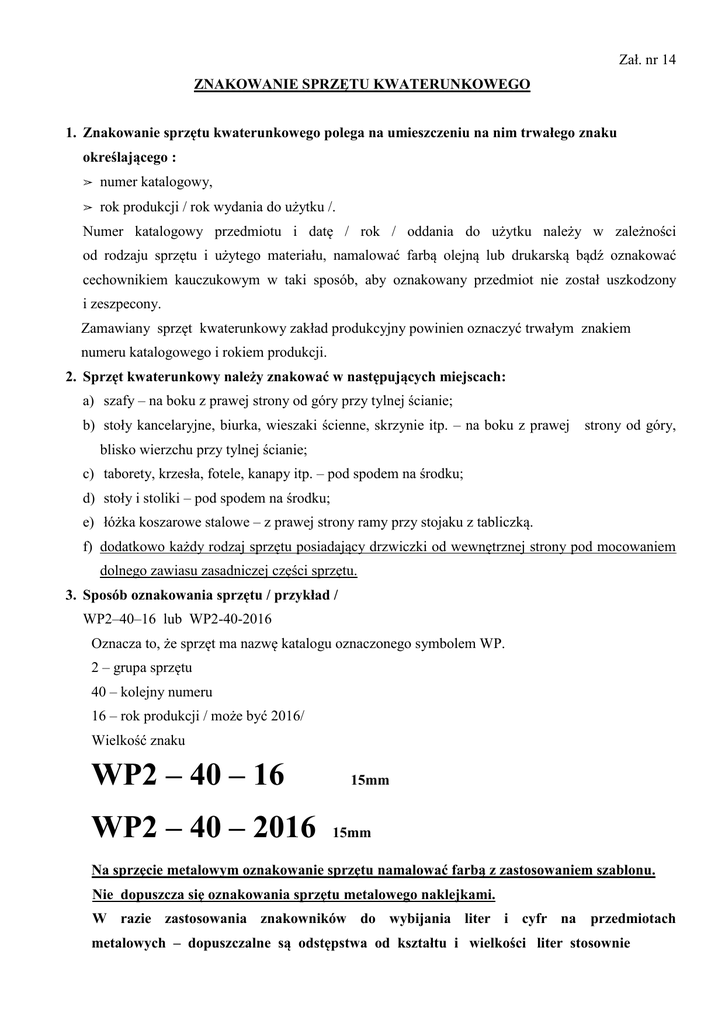Zał. nr 14 ZNAKOWANIE SPRZĘTU KWATERUNKOWEGO 1. Znakowanie sprzętu kwaterunkowego polega na umieszczeniu na nim trwałego znaku określającego : ➢ numer katalogowy, ➢ rok produkcji / rok wydania do użytku /. Numer katalogowy przedmiotu i datę / rok / oddania do użytku należy w zależności od rodzaju sprzętu i użytego materiału, namalować farbą olejną lub drukarską bądź oznakować cechownikiem kauczukowym w taki sposób, aby oznakowany przedmiot nie został uszkodzony i zeszpecony. Zamawiany sprzęt kwaterunkowy zakład produkcyjny powinien oznaczyć trwałym znakiem numeru katalogowego i rokiem produkcji. 2. Sprzęt kwaterunkowy należy znakować w następujących miejscach: a) szafy – na boku z prawej strony od góry przy tylnej ścianie; b) stoły kancelaryjne, biurka, wieszaki ścienne, skrzynie itp. – na boku z prawej strony od góry, blisko wierzchu przy tylnej ścianie; c) taborety, krzesła, fotele, kanapy itp. – pod spodem na środku; d) stoły i stoliki – pod spodem na środku; e) łóżka koszarowe stalowe – z prawej strony ramy przy stojaku z tabliczką. f) dodatkowo każdy rodzaj sprzętu posiadający drzwiczki od wewnętrznej strony pod mocowaniem dolnego zawiasu zasadniczej części sprzętu. 3. Sposób oznakowania sprzętu / przykład / WP2–40–16 lub WP2-40-2016 Oznacza to, że sprzęt ma nazwę katalogu oznaczonego symbolem WP. 2 – grupa sprzętu 40 – kolejny numeru 16 – rok produkcji / może być 2016/ Wielkość znaku WP2 – 40 – 16 WP2 – 40 – 2016 15mm 15mm Na sprzęcie metalowym oznakowanie sprzętu namalować farbą z zastosowaniem szablonu. Nie dopuszcza się oznakowania sprzętu metalowego naklejkami. W razie zastosowania znakowników do wybijania liter i cyfr na przedmiotach metalowych – dopuszczalne są odstępstwa od kształtu i wielkości liter stosownie do możliwości technicznych wykonania elementów znakowania OGÓLNE WYMAGANIA W ZAKRESIE KONSTRUKCJI I WYKONAWSTWA MEBLI 1. Podstawowe materiały i ich jakość. ➢ płyty wiórowe laminowane wykonane zgodnie z obowiązującymi normami, z atestem na stopień wydzielania formaldechydu – klasa higieny E1. ➢ materiały pochodzenia chemicznego tj. lakiery, kleje, tworzywa sztuczne, okleiny, materiały gąbczaste i inne – zgodnie z wymaganiami higienicznymi określonymi w normie przedmiotowej na dany rodzaj materiału – pozytywny atest PZH lub innej instytucji upoważnionej do atestowania wyrobów w tym zakresie. ➢ podstawy mebli ze stalowych profili zamkniętych o przekroju czworokątnym 25x25mm i 20x20mm. 2. Połączenia konstrukcyjne. ➢ połączenia rozbieralne powinny umożliwiać montaż i demontaż bez dodatkowych zabiegów technologicznych. ➢ połączenia śrubowe, nitowane, spawane itp. zgodnie z obowiązującymi normami. 3. Sposób wykończenia. a) powierzchnie zewnętrzne i krawędzie : ➢ gładkie a krawędzie załamane i zaokrąglone, ➢ doklejki krawędziowe z tworzyw sztucznych (PCV lub ABS). b) powierzchnie wewnętrzne Powierzchnie elementów wewnętrznych widoczne w meblu powinny być okleinowane, ściany tylne z płyty pilśniowej twardej – powierzchnie widoczne malowane. Powierzchnie elementów metalowych przewidzianych do malowania powinny być właściwie przygotowane a malowanie elementów konstrukcji zgodnie z normą dla zastosowanej technologii. Metalowe podstawy mebli biurowych wchodzących w skład zestawów biurowych malowane lakierem piecowym lub metodą proszkową – w kolorze czarnym. 4. Rodzaje zamków, okuć, kółek meblowych itp. Zamki, zawiasy, okucia oraz kółka meblowe muszą spełniać określone wymagania zawarte w normach branżowych. Zamki i okucia powinny mieć powłokę antykorozyjną lub zabezpieczającą oraz stanowić harmonijne uzupełnienie mebla. 5. Wymogi wytrzymałościowe i funkcjonalne. Powierzchnie robocze mebli powinny być odporne na działanie czynników fizykochemicznych. Odporność zgodna z normami na określone czynniki działania jak: płyny, temperatura, uderzenia, ścieranie itp. Odkształcalność i miękkość części tapicerowanych mebli, odporność użytkowa tkanin obiciowych powinna spełniać normy obowiązujące w branży tapicerskiej. Meble powinny spełniać wymagania “krytyczne” tzn. wytrzymałość, bezpieczne rozwiązania konstrukcyjne i higieniczność oraz inne istotne wymagania np. forma plastyczna, zestawialność, zharmonizowanie części składowych, funkcjonalność itp. 6. Kolorystyka mebli i tkanin obiciowych. Powinna być zgodna z zamówieniem. 7. Sposób oznakowania. Dostawca powinien oznakować meble trwałym znakiem numeru katalogu i roku produkcji zgodnie z obowiązującymi w wojsku przepisami. 8. Układ funkcjonalny i wymiary gabarytowe mebli – w załącznikach. Wyroby muszą posiadać parametry takie same lub równoważne do parametrów wskazanych w opisach oraz muszą być wykonane z podanych materiałów. Załączone szkice i zdjęcia mają charakter poglądowy, odzwierciedlają sparametryzowany przez zamawiającego wzorzec. Wyroby występujące w zestawach powinny stanowić harmonijna całość.