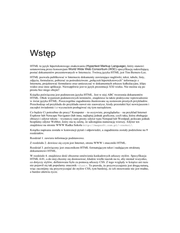 Wstęp HTML to język hipertekstowego znakowania (Hypertext Markup Language), który stanowi ustanowioną przez konsorcjum World Wide Web Consortium (W3C) specyfikację nakreślającą postać dokumentów prezentowanych w Internecie. Twórcą języka HTML jest Tim Berners-Lee. HTML pozwala publikować w Internecie dokumenty zawierające nagłówki, tekst, tabele, listy, zdjęcia, formularze, pobierać za pośrednictwem „połączeń hipertekstowych” informacje z Internetu, projektować formularze oraz umieszczać w dokumentach arkusze kalkulacyjne, klipy wideo oraz inne aplikacje. Niewątpliwie jest to język prezentacji XXI wieku. Nie można się po prostu bez niego obejść! Książka poświęcona jest podstawom języka HTML. Jest w niej ABC tworzenia dokumentów HTML. Obok wyjaśnień podstawowych terminów, znajdziesz tu także praktyczne wprowadzenie w świat języka HTML. Poszczególne zagadnienia ilustrowane są zestawem prostych przykładów. Przechodząc od przykładu do przykładu nawet nie zauważysz, kiedy przestałeś być nowicjuszem i zacząłeś świadomie i z wyczuciem posługiwać się tym narzędziem. Co będzie Ci potrzebne do pracy? Komputer – to oczywiste, przeglądarka – na przykład Internet Explorer lub Netscape Navigator (lub inna, najlepiej jednak graficzna, czyli taka, która obsługuje obrazy) i edytor tekstu – wystarczy nam prosty edytor typu Notepad lub Wordpad, polecam jednak bezpłatny edytor Webber, który ma tę zaletę, że udostępnia numerację wierszy. Edytor ten znajdziesz na stronie WWW Radka Sokoła http://magsoft.com.pl/~rsokol/. Książka napisana została w konwencji pytań i odpowiedzi, a zagadnienia zostały podzielone na 9 rozdziałów. Rozdział 1. zawiera informacje podstawowe. Z rozdziału 2. dowiesz się czym jest Internet, strona WWW i znaczniki HTML. Rozdział 3. poświęcony jest znacznikom HTML formatującym tekst i nadającym strukturę dokumentowi HTML. W rozdziale 4. znajdziesz dość obszerne omówienia kaskadowych arkuszy stylów. Specyfikacja HTML 4.01, a do niej chcemy się dostosować, kładzie wielki nacisk na to, aby niemal wszystko, co dotyczy stylów, definiowane było za pomocą arkuszy CSS. Z tego względy w książce ani razu nie pojawił się tak popularny znacznik <font>. To prawda, że przyzwyczajenie jest drugą naturą, więc zacznijmy się przyzwyczajać do stylów CSS, tym bardziej, że ich stosowanie nie jest trudne, a bardzo ułatwia życie. Rozdział 5. pokazuje różne sposoby korzystania z obrazów w dokumentach HTML, rozdział 6. zajmuje się połączeniami, także tymi nietypowymi, na bazie obrazu – ikonami, które można klikać, i mapami odnośników. W rozdziale 7. pojawiają się tabele HTML. Tabele to nie tylko sposób prezentacji danych, lecz także sposób na prezentację dokumentu (choć CSS też tu sięga!). W rozdziale 8. dominują ramki i układy ramek. Ważny jest także rozdział 9., który wskazuje różnice między obecnie najbardziej popularną wersją języka HTML, a nową specyfikacją, XHTML. Warto przeczytać ten rozdział, bowiem stosowanie się do zasad obowiązujących przy tworzeniu dokumentów XHTML pomoże tworzyć poprawne dokumenty HTML. Każdy z rozdziałów zawiera krótkie podsumowanie, w którym zebrane zostały najważniejsze informacje, warte przypomnienia od czasu do czasu. Do książki dołączone zostały cztery dodatki. Dodatek A to obszerny zestaw znaczników i ich atrybutów (wg. specyfikacji HTML 4.01). Znajdziesz w nim także podstawowe zasady korzystania z tych elementów. Mam nadzieję, że będzie to użyteczna ściągawka. Dodatek B to podstawowe moduły kodu HTML. Nie musisz więc kartkować całej książki, aby na przykład dowiedzieć się, jak zapisać kod HTML tabeli! Dodatek C prezentuje tabele atrybutów standardowych, które mogą być stosowane niemal ze wszystkimi znacznikami, a w dodatku D znajdziesz tabelkę kodów i nazw podstawowych kolorów. Życzę powodzenia w tworzeniu ciekawych dokumentów HTML. Maria Sokół
