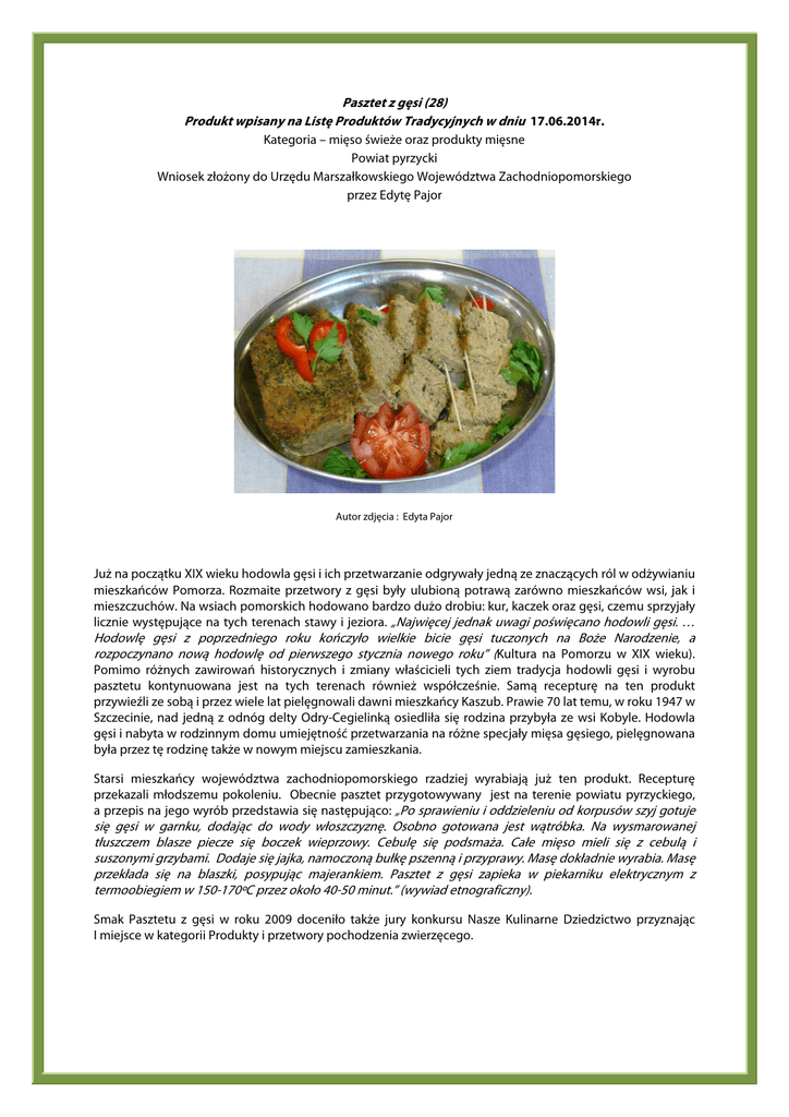 Pasztet z gęsi (28) Produkt wpisany na Listę Produktów Tradycyjnych w dniu 17.06.2014r. Kategoria – mięso świeże oraz produkty mięsne Powiat pyrzycki Wniosek złożony do Urzędu Marszałkowskiego Województwa Zachodniopomorskiego przez Edytę Pajor Autor zdjęcia : Edyta Pajor Już na początku XIX wieku hodowla gęsi i ich przetwarzanie odgrywały jedną ze znaczących ról w odżywianiu mieszkańców Pomorza. Rozmaite przetwory z gęsi były ulubioną potrawą zarówno mieszkańców wsi, jak i mieszczuchów. Na wsiach pomorskich hodowano bardzo dużo drobiu: kur, kaczek oraz gęsi, czemu sprzyjały licznie występujące na tych terenach stawy i jeziora. „Najwięcej jednak uwagi poświęcano hodowli gęsi. … Hodowlę gęsi z poprzedniego roku kończyło wielkie bicie gęsi tuczonych na Boże Narodzenie, a rozpoczynano nową hodowlę od pierwszego stycznia nowego roku” (Kultura na Pomorzu w XIX wieku). Pomimo różnych zawirowań historycznych i zmiany właścicieli tych ziem tradycja hodowli gęsi i wyrobu pasztetu kontynuowana jest na tych terenach również współcześnie. Samą recepturę na ten produkt przywieźli ze sobą i przez wiele lat pielęgnowali dawni mieszkańcy Kaszub. Prawie 70 lat temu, w roku 1947 w Szczecinie, nad jedną z odnóg delty Odry-Cegielinką osiedliła się rodzina przybyła ze wsi Kobyle. Hodowla gęsi i nabyta w rodzinnym domu umiejętność przetwarzania na różne specjały mięsa gęsiego, pielęgnowana była przez tę rodzinę także w nowym miejscu zamieszkania. Starsi mieszkańcy województwa zachodniopomorskiego rzadziej wyrabiają już ten produkt. Recepturę przekazali młodszemu pokoleniu. Obecnie pasztet przygotowywany jest na terenie powiatu pyrzyckiego, a przepis na jego wyrób przedstawia się następująco: „Po sprawieniu i oddzieleniu od korpusów szyj gotuje się gęsi w garnku, dodając do wody włoszczyznę. Osobno gotowana jest wątróbka. Na wysmarowanej tłuszczem blasze piecze się boczek wieprzowy. Cebulę się podsmaża. Całe mięso mieli się z cebulą i suszonymi grzybami. Dodaje się jajka, namoczoną bułkę pszenną i przyprawy. Masę dokładnie wyrabia. Masę przekłada się na blaszki, posypując majerankiem. Pasztet z gęsi zapieka w piekarniku elektrycznym z termoobiegiem w 150-170ºC przez około 40-50 minut.” (wywiad etnograficzny). Smak Pasztetu z gęsi w roku 2009 doceniło także jury konkursu Nasze Kulinarne Dziedzictwo przyznając I miejsce w kategorii Produkty i przetwory pochodzenia zwierzęcego.