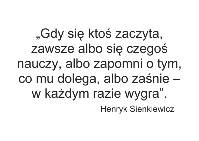 „Gdy się ktoś zaczyta, zawsze albo się czegoś nauczy, albo zapomni o tym, co mu dolega, albo zaśnie – w każdym razie wygra”. Henryk Sienkiewicz Parlament Rzeczypospolitej Polskiej ustanowił rok 2016 Rokiem Henryka Sienkiewicza. Obchodzić wówczas będziemy 170. rocznicę urodzin i 100. rocznicę śmierci pisarza, minie 120 lat od chwili wydania powieści Quo vadis, która przyniosła mu międzynarodową sławę. W tekście uchwały, przyjętej przez Sejm RP 22 grudnia 2015 r., zwrócono szczególną uwagę na zasługi Sienkiewicza dla odzyskania niepodległości, podtrzymywanie ducha narodowego i działalność społeczną. Zaakcentowano fakt, iż Henryk Sienkiewicz był pierwszym Polakiem uhonorowanym Nagrodą Nobla w dziedzinie literatury. Henryk Adam Aleksander Pius Sienkiewicz herbu Okszyk, pseudonim Litwos (ur. 5 maja 1846 w Woli Okrzejskiej, zm. 15 listopada 1916 w Vevey) - polski nowelista, powieściopisarz i publicysta; laureat Nagrody Nobla w dziedzinie literatury (1905) za całokształt twórczości, jeden najpopularniejszych polskich pisarzy przełomu XIX i XX w. Urodził się w 1846 r. na Podlasiu we wsi Wola Okrzejska w zubożałej rodzinie szlacheckiej, pieczętującej się herbem Okszyk, po mieczu wywodzącej się z Tatarów litewskich. Jego rodzicami byli Józef Sienkiewicz (1813-1896) i Stefania Sienkiewicz z domu Cieciszowska (1820-1873). Miał pięcioro rodzeństwa: brata Kazimierza i cztery siostry: Anielę, Helenę, Zofię i Marię. Po stracie majątku rodzina Sienkiewicza przenosiła się, by ostatecznie w 1861 r. osiąść na stałe w Warszawie. MUZEUM W WOLI OKRZEJSKIEJ Obecnie w dworku babki Felicjanny Cieciszewskiej w Woli Okrzejskiej, w którym Henryk Sienkiewicz urodził się i spędził pierwszych 9 lat życia, znajduje się Muzeum Henryka Sienkiewicza. Dworek szczęśliwie przetrwał burze dziejowe i w 1966 r. w 120 rocznicę urodzin Henryka Sienkiewicza otwarto w nim Muzeum biograficzne poświęcone pisarzowi. Muzeum posiada bogaty zbiór fotografii rodzinnych pisarza, dzieła malarskie i rzeźbiarskie obrazujące Henryka Sienkiewicza i bohaterów jego utworów literackich. zgromadzono też bogaty i unikalny księgozbiór zawierający wiele pierwszych wydań powieści pisarza oraz tłumaczenia na kilkadziesiąt języków świata. NAUKA W 1858 roku Sienkiewicz rozpoczął w Warszawie. W 1864r. zdobył swą wypracowanie Mowa Żółkiewskiego do W szkole nie uzyskiwał jednak wysokich przedmioty humanistyczne. naukę w gimnazjum pierwszą nagrodę za wojska pod Cecorą. not, najlepiej szły mu Wskutek trudnej sytuacji materialnej, nie mogąc liczyć na pomoc finansową rodziców, dziewiętnastoletni Sienkiewicz podjął się posady guwernera u rodziny Weyherów w Płońsku. W 1866 r. uzyskał świadectwo dojrzałości. Zgodnie z wolą rodziców zdał na wydział lekarski do Szkoły Głównej Warszawskiej, jednak zrezygnował z medycyny i podjął studia prawnicze, by w ostateczności przenieść się na wydział filologiczno-historyczny. Zdobył tam gruntowną znajomość literatury i języka staropolskiego. DZIENNIKARSTWO To był przełomowy okres w jego życiu. Podjął pierwsze próby pisarskie i debiutował jako dziennikarz (1869). W 1871r. opuścił uczelnię nie zdając egzaminów końcowych i rozpoczął pracę dziennikarską jako felietonista i recenzent dla czołowych pism warszawskich: „Gazety Polskiej” oraz „Niwy”. Dał się wówczas poznać jako wybitny dziennikarz, reporter i korespondent, który przez kolejne lata współpracował także z wieloma innymi pismami. Przez wiele lat podpisywał się tylko inicjałami H. S. lub pseudonimem Litwos. PODRÓŻ DO AMERYKI Jako recenzent teatralny miał wstęp na popularne wówczas salony, gdzie poznał m. in. Stanisława Witkiewicza (ojca Witkacego), Józefa Chełmońskiego i Adama Chmielowskiego (późniejszego Brata Alberta). Bywał u swej krewnej Jadwigi Łuszczewskiej oraz u aktorki Heleny Modrzejewskiej. W latach 1876-1878 jako korespondent „Gazety Polskiej” przebywał w Ameryce Północnej. Jego Listy z podróży do Ameryki uratowały pismo od bankructwa. ŻONA I DZIECI W 1881 r. Sienkiewicz ożenił się z Marią Szetkiewicz. Często wyjeżdżał za granicę do włoskich, austriackich i francuskich uzdrowisk ze względu na zły stan zdrowia żony, a później także swój. Małżeństwo nie trwało długo, gdyż 19 października 1885 r. w wieku 31 lat Maria zmarła na gruźlicę. Ze związku tego urodziło się dwoje dzieci: Henryk Józef i Jadwiga Maria, które po śmierci matki wychowywały się u dziadków. SUKCES TRYLOGII W latach 1882-1887 Sienkiewicz był redaktorem dziennika „Słowo”, w którym drukował w odcinkach cykl powieści historycznych, nazwany Trylogią: Ogniem i mieczem (1884), Potop (1886) i Pan Wołodyjowski (1888), obejmujących burzliwe dzieje Polski w XVII w. podczas wojen z Tatarami, Turkami i Szwedami. Trylogia wyniosła Sienkiewicza na szczyty popularności i uczyniła z niego najpopularniejszego polskiego pisarza. Jako wyraz uznania Sienkiewicz dostał od nieznanego wielbiciela (podpisanego Michał Wołodyjowski) bardzo pokaźną sumę 15 tysięcy rubli. W 1889 r. pieniądze te przeznaczył na stypendium im. Marii Sienkiewiczowej dla artystów zagrożonych gruźlicą, z którego korzystali m. i. Maria Konopnicka i Stanisław Wyspiański. PODRÓŻE I DRUGI ŚLUB W 1886 r. odbył podróż do Konstantynopola, Aten i Włoch, a następnie w 1888 r. do Hiszpanii. W 1890 r. udał się na wyprawę myśliwską do Zanzibaru, która zaowocowała Listami z Afryki, spisanymi po powrocie. Okresowo mieszkał w Zakopanem, Krakowie i Warszawie. W 1893 r. Sienkiewicz ożenił się po raz drugi z Marią Romanowską, jednak po miesiącu panna młoda rozstała się z nim. Sienkiewicz uzyskał papieskie potwierdzenie niezaistnienia sakramentu małżeństwa. QUO VADIS? W latach 1895-1896 publikowano w warszawskiej „Gazecie Polskiej”, krakowskim „Czasie” oraz