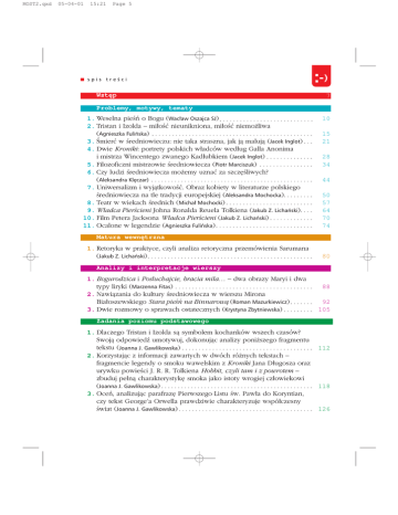 MOST2.qxd 05-04-01 15:21 Page 5 spis treœci Wstêp 7 Problemy, motywy, tematy 1. Weselna pieñ o Bogu (Wac³aw Oszajca SJ) 2. Tristan i Izolda mi³oæ nieunikniona, mi³oæ niemo¿liwa (Agnieszka Fuliñska) 3. mieræ w redniowieczu: nie taka straszna, jak j¹ maluj¹ (Jacek Inglot) 4. Dwie Kroniki: portrety polskich w³adców wed³ug Galla Anonima i mistrza Wincentego zwanego Kad³ubkiem (Jacek Inglot) 5. Filozoficzni mistrzowie redniowiecza (Piotr Marciszuk) 6. Czy ludzi redniowiecza mo¿emy uznaæ za szczêliwych? (Aleksandra Klêczar) 7. Uniwersalizm i wyj¹tkowoæ. Obraz kobiety w literaturze polskiego redniowiecza na tle tradycji europejskiej (Aleksandra Mochocka) 8. Teatr w wiekach rednich (Micha³ Mochocki) 9. W³adca Piercieni Johna Ronalda Reuela Tolkiena (Jakub Z. Lichañski) 10. Film Petera Jacksona W³adca Piercieni (Jakub Z. Lichañski) 11. Ocalone w legendzie (Agnieszka Fuliñska) 10 15 21 28 34 44 50 57 64 70 74 Matura wewnêtrzna 1. Retoryka w praktyce, czyli analiza retoryczna przemówienia Sarumana (Jakub Z. Lichañski) 80 Analizy i interpretacje wierszy 1. Bogurodzica i Pos³uchajcie, bracia mi³a dwa obrazy Maryi i dwa typy liryki (Marzenna Fitas) 2. Nawi¹zania do kultury redniowiecza w wierszu Mirona Bia³oszewskiego Stara pieñ na Binnarow¹ (Roman Mazurkiewicz) 3. Dwie rozmowy o sprawach ostatecznych (Krystyna Zbytniewska) 88 92 105 Zadania poziomu podstawowego 1. Dlaczego Tristan i Izolda s¹ symbolem kochanków wszech czasów? Swoj¹ odpowied umotywuj, dokonuj¹c analizy poni¿szego fragmentu tekstu (Joanna J. Gawlikowska) 2. Korzystaj¹c z informacji zawartych w dwóch ró¿nych tekstach fragmencie legendy o smoku wawelskim z Kroniki Jana D³ugosza oraz urywku powieci J. R. R. Tolkiena Hobbit, czyli tam i z powrotem zbuduj pe³n¹ charakterystykê smoka jako istoty wrogiej cz³owiekowi (Joanna J. Gawlikowska) 3. Oceñ, analizuj¹c parafrazê Pierwszego Listu w. Paw³a do Koryntian, czy tekst George'a Orwella prawdziwie charakteryzuje wspó³czesny wiat (Joanna J. Gawlikowska) 112 118 126 MOST2.qxd 05-04-01 15:21 Page 6 spis treœci 4. Wska¿ podobieñstwa i ró¿nice w przedstawieniu postaci Matki Boskiej w dwóch tekstach: Bogurodzicy i Pos³uchajcie, bracia mi³a (Joanna J. Gawlikowska) 136 Test czytania ze zrozumieniem 1. O mi³oci (Gra¿yna Bogucka, Janusz Wojczakowski) 146 Analizy obrazów 1. Mistrz szko³y z Arras Ofiarowanie serca (Ma³gorzata Konopiñska) 2. Mistrz Godzinek de Rohan Zmar³y przed S¹dem Bo¿ym 20 (Ma³gorzata Konopiñska) 24 27 33 43 49 56 124 (Ma³gorzata Konopiñska) 128 135 155 3. Malarz ma³opolski Epitafium Jana z Ujazdu (Ma³gorzata Konopiñska) 4. Witra¿ z ratusza w Lüneburgu Król Artur (Ma³gorzata Konopiñska) 5. Francesco Traini w. Tomasz z Akwinu (Ma³gorzata Konopiñska) 6. Hans Memling Portret m³odzieñca (Ma³gorzata Konopiñska) 7. Rogier van der Weyden Portret damy (Ma³gorzata Konopiñska) 8. Paolo Ucello w. Jerzy (Katarzyna Myrcik, Ma³gorzata Konopiñska) 9. Simone Martini w. Marcin dzieli siê p³aszczem z ubogim 10. Giotto Kazanie w. Franciszka do ptaków (Katarzyna Myrcik) 11. Dirk Bouts w. Krzysztof (Ma³gorzata Konopiñska)