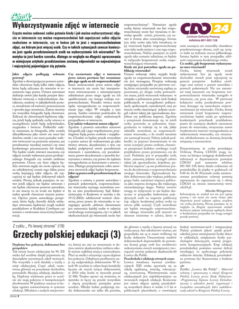 Wykorzystywanie zdjęć w internecie Często można zadawać sobie pytania kiedy i jak można wykorzystywać zdjęcia w internecie czy można rozpowszechniać lub zapożyczać sobie zdjęcia znalezione w internecie, czy w końcu jak to jest z rozpowszechnianiem zdjęć, na którym jest więcej osób. Czy w takich sytuacjach zawsze konieczna jest zgoda przedstawionych osób na wykorzystanie ich wizerunku? Tematyka ta jest bardzo szeroka, dlatego ze względu na długość opracowania w niniejszym artykule przedstawione zostaną odpowiedzi na najważniejsze i najczęściej pojawiające się pytania. Jakie zdjęcia podlegają ochronie prawnej? Zgodnie z obowiązującym prawem autorskim chronione będą tylko takie zdjęcia, które będą zaliczane do utworów w rozumieniu tego prawa. Ustawa natomiast definiuje utwór jako każdy przejaw działalności twórczej o indywidualnym charakterze, ustalony w jakiejkolwiek postaci, niezależnie od wartości, przeznaczenia i sposobu jego wyrażenia. Zatem niestety nie wszystkie fotografie będą chronione. Zaliczać do chronionych będziemy zdjęcia, jeżeli będą spełniały cechy utworu w szczególności jeżeli będą indywidualne, oryginalne i twórcze. Podkreślić należy natomiast, że fotografia, żeby została sklasyfikowana jako utwór nie musi być dziełem sztuki i nie musi posiadać walorów twórczości na poziomie artyzmu, ani przedstawiać wysokiej wartości czy mieć konkretnego przeznaczenia lub funkcji. Nie będzie miało również znaczenia czy zdjęcie zostało wykonane przez profesjonalnego fotografa czy zostało zrobione prywatnie. Ocena czy dane zdjęcie będzie utworem nigdy nie może opierać się na subiektywnej ocenie tego faktu przez osobę kopiującą takie zdjęcie, ale najczęściej to sąd będzie dokonywał takich ustaleń. Proszę jednak pamiętać, że nawet jeżeli zdjęcie nie będzie utworem i nie będzie chronione prawem autorskim, to nie znaczy to, że wcale nie będzie w żaden sposób chronione innymi prawami. Oprócz prawa autorskiego przepisami, które będą chroniły dzieła niebędące utworami, będziemy mogli znaleźć przykładowo w Kodeksie Cywilnym czy ustawie o zwalczaniu nieuczciwej konkurencji. Czy wystawianie zdjęć w internecie przez autora powinno być rozumiane jako jego zgoda na ich rozpowszechnianie? Samo umieszczanie przez autora zdjęć w internecie nie może być interpretowane równoznacznie z automatycznym udzieleniem przez niego zgody na ich upublicznianie czy innego rodzaju rozpowszechnianie. Ponadto twórca może żądać wynagrodzenia za rozpowszechnianie jego zdjęć. W związku z tym proszę bardzo ostrożnie podchodzić do rozpowszechniania zdjęć znalezionych przypadkowo w internecie. Czy należy wskazywać autora zdjęcia? Zgodnie z prawem autorskim autorowi fotografii, jak i jego współautorom, przysługiwać będą prawa osobiste i majątkowe. Chodzić tu będzie przede wszystkim o prawo autora do wskazywania go jako twórcy utworu, decydowania o tym czy będzie podpisywał utwór prawdziwym imieniem i nazwiskiem, czy pseudonimem, prawo decydowania o sposobie korzystania z utworu, czy prawo do żądania wynagrodzenia za korzystanie z utworu i inne. Dlatego przypisywanie sobie autorstwa nieswoich zdjęć będzie bezprawne. Jakie są prawa osób przedstawionych na zdjęciu? Zgodnie z ustawą o prawie autorskim i prawach pokrewnych, rozpowszechnianie wizerunku wymaga zezwolenia osoby na nim przedstawionej. Sąd Administracyjny w Krakowie w wyroku z dn. 19.12.2002r. zdefiniował wartość chronioną przez prawo do wizerunku w następujący sposób: „dobrem chronionym jest autonomia każdej osoby w zakresie swobodnego rozstrzygania, czy i w jakich okolicznościach jej wizerunek może być Z cyklu „ Po lewej stronie” (19) Grzechy polskiej edukacji (3) Dyplomy bez pokrycia, doktoranci bez perspektyw Tak zwany boom edukacyjny lat 90. XX wieku był możliwy dzięki pojawieniu się dziesiątków prywatnych szkół wyższych. Nie wszystkie z nich działały z myślą o misji edukacyjnej. Część szkół, nastawiona głównie na pozyskanie dochodów, prowadziła fikcyjną edukację akademicką. Dyplomy wydawane przez te uczelnie nie mają pokrycia w kompetencjach absolwentów. W praktyce oznacza to kolejne ogniwo rozwarstwienia w systemie edukacji. Młodzież z małych miejscowostrona 8 ści, której nie stać na utrzymanie w dużym mieście akademickim, wybiera szkoły wyższe najbliżej miejsca zamieszkania. Płaci za studia i otrzymuje często dyplom bez pokrycia. Odrębnym problemem staje się nadprodukcja doktorantów. W latach 90. uczelnie w całym kraju kształciły łącznie ok. trzech tysięcy doktorantów, w 2010 roku liczba ta wynosiła ponad 32 000. Trudno oprzeć się wrażeniu, że zjawisko to łączy się przede wszystkim z chęcią pozyskania pieniędzy przez uczelnie. Młodzi ludzie podejmują studia doktoranckie nie tylko dla prestiżu, rozpowszechniany“. Natomiast zgoda osoby, której wizerunek ma być rozpowszechniany może być wyrażona w dowolny sposób: ustnie, pisemnie, czy nawet w formie aktu notarialnego. Istotne jest, żeby osoba taka była świadoma, że jej wizerunek będzie rozpowszechniany oraz żeby znała miejsce i czas tego rozpowszechniania. Należy pamiętać, że jeżeli zgoda taka zostanie udzielona, to będzie to wyłączało bezprawność osoby rozpowszechniającej wizerunek. Kiedy nie jest potrzebna zgoda na publikację wizerunku? Ustawa wskazuje także wyjątki kiedy zgoda na rozpowszechnianie wizerunku nie jest wymagana. Przepisy wskazują następujące przypadki: po pierwsze osoby, które otrzymały umówioną zapłatę za pozowanie, po drugie osoby powszechnie znane, jeżeli wizerunek wykonano w związku z pełnieniem przez nich funkcji publicznych, w szczególności politycznych, społecznych, zawodowych oraz po trzecie osoby stanowiącej jedynie szczegół całości takiej jak zgromadzenie, krajobraz czy publiczna impreza. Zgo