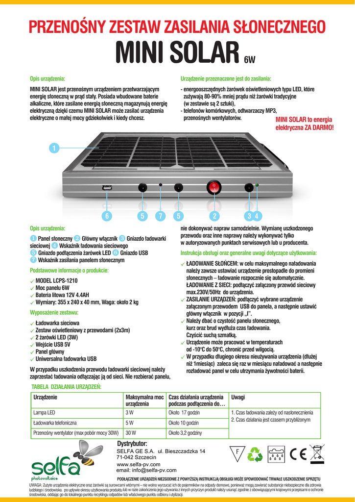 PRZENOŚNY ZESTAW ZASILANIA SŁONECZNEGO MINI SOLAR 6W Opis urządzenia: Urządzenie przeznaczone jest do zasilania: MINI SOLAR jest przenośnym urządzeniem przetwarzającym energię słoneczną w prąd stały. Posiada wbudowane baterie alkaliczne, które zasilane energią słoneczną magazynują energię elektryczną dzięki czemu MINI SOLAR może zasilać urządzenia elektryczne o małej mocy gdziekolwiek i kiedy chcesz. - energooszczędnych żarówek oświetleniowych typu LED, które zużywają 80-90% mniej prądu niż żarówki tradycyjne (w zestawie są 2 sztuki), - telefonów komórkowych, odtwarzaczy MP3, przenośnych wentylatorów. MINI SOLAR to energia elektryczna ZA DARMO! 1 6 5 7 5 2 3 4 nie dokonywać napraw samodzielnie. Wymianę uszkodzonego przewodu oraz inne naprawy należy wykonywać tylko w autoryzowanych punktach serwisowych lub u producenta. Opis urządzenia: Panel słoneczny Główny włącznik Gniazdo ładowarki sieciowej ‚ Wskaźnik ładowania sieciowego ƒ Gniazdo podłączenia żarówek LED „ Gniazdo USB … Wskaźnik zasilania panelem słonecznym Instrukcja obsługi oraz generalne uwagi dotyczące użytkowania: Podstawowe informacje o produkcie: MODEL LCPS-1210 Moc panelu 6W Bateria litowa 12V 4.4AH Wymiary: 355 x 240 x 40 mm, Waga: około 2 kg Wyposażenie zestawu: Ładowarka sieciowa Zestaw oświetleniowy z przewodami (2x3m) 2 żarówki LED (3W) Wejście USB 5V Panel główny Uniwersalna ładowarka USB W przypadku uszkodzenia przewodu ładowarki sieciowej należy zaprzestać ładowania odłączając ją od sieci. Nie rozbierać panelu, ŁADOWANIE SŁOŃCEM: w celu maksymalnego naładowania należy zawsze ustawiać urządzenie prostopadle do promieni słonecznych – ładowanie rozpocznie się automatycznie. ŁADOWANIE Z SIECI: podłączyć załączony przewód sieciowy max.230V/50Hz do urządzenia. ZASILANIE URZĄDZEŃ: podłączyć wybrane urządzenie załączonym przewodem USB do panela, a następnie ustawić główny włącznik w pozycji „I”. Należy dbać o czystość panelu słonecznego, kurz oraz brud wydłuża czas ładowania. Czyścić suchą szmatką. Urządzenie może pracować w temperaturach od -10°C do 50°C, chronić przed wilgocią. W przypadku długiego okresu nieużywania urządzenia (dłużej niż 1miesiąc) zaleca się raz w miesiącu naładować a następnie rozładować panel w celu utrzymania żywotności baterii. TABELA DZIAŁANIA URZĄDZEŃ: Urządzenie Maksymalna moc Czas działania urządzenia Uwagi urządzenia podczas podłączenia do… Lampa LED 3W Około 17 godzin Ładowarka telefoniczna 5W Około 10 godzin Przenośny wentylator (max pobór mocy 30W) 30 W Około 3,2 godziny 1. Czas ładowania zależy od nasłonecznienia 2. Czas działania jest czasem przybliżonym Dystrybutor: SELFA GE S.A. ul. Bieszczadzka 14 71-042 Szczecin www.selfa-pv.com email: [email protected] PODŁĄCZENIE URZĄDZEŃ NIEZGODNIE Z POWYŻSZĄ INSTRUKCJĄ OBSŁUGI MOŻE SPOWODOWAĆ TRWAŁE USZKODZENIE SPRZĘTU UWAGA: Zużyte urządzenia elektryczne oraz żarówki są surowcami wtórnymi – nie wolno wyrzucać ich do pojemników na odpady domowe, ponieważ mogą zawierać substancje niebezpieczne dla zdrowia ludzkiego i środowiska. po upływie okresu użytkowania produktu lub w razie zakończenia jego używania z innych przyczyn produkt należy usunąć zgodnie z obowiązującymi krajowymi przepisami o ochronie środowiska, oddając go do lokalnego punktu recyklingu odpadów lub właściwego punktu odbioru i utylizacji.