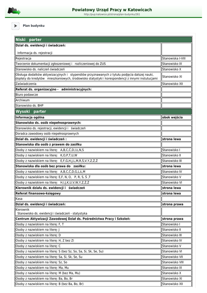 Powiatowy Urząd Pracy w Katowicach http://pup.katowice.pl/strona/plan-budynku/261 Plan budynku Niski parter Dział ds. ewidencji i świadczeń: Informacja ds. rejestracji Rejestracja Stanowiska I-VIII Tworzenie dokumentacji zgłoszeniowej i rozliczeniowej do ZUS Stanowisko IX Stanowisko ds. naliczeń świadczeń Stanowisko X Obsługa dodatków aktywizacyjnych i stypendiów przyznawanych z tytułu podjęcia dalszej nauki, dopłaty do kredytów mieszkaniowych, środowisko statystyki i korespondencji z innymi instutucjami Stanowisko XI Zaświadczenia Stanowisko XII Referat ds. organizacyjno - administracyjnych: Biuro podawcze Archiwum Stanowisko ds. BHP Wysoki parter Informacja ogólna obok wejścia Stanowisko ds. osób niepełnosprawnych: Stanowisko ds. rejestracji, ewidencji i świadczeń Doradca zawodowy osób niepełnosprawnych Dział ds. ewidencji i świadczeń : strona lewa Stanowiska dla osób z prawem do zasiłku Osoby z nazwiskiem na literę: A,B,C,Ć,D,I,Ł,N,S Stanowisko I Osoby z nazwiskiem na literę: K,O,P,T,U,W Stanowisko II Osoby z nazwiskiem na literę: E,F,G,H,J,L,M,R,Ś,V,Y,Z,Ź,Ż Stanowisko III Stanowiska dla osób bez prawa do zasiłku: strona lewa Osoby z nazwiskiem na literę: A,B,C,Ć,D,G,L,Ł,M Stanowisko IV Osoby z nazwiskiem na literę: E,F, N, O, P, R, S, Ś ,T Stanowisko V Osoby z nazwiskiem na literę: H,I,J,K,U,V,W,Y,Z,Ź,Ż Stanowisko VI Kierownik działu ds. ewidencji i świadczeń strona lewa Referat finansowo-księgowy strona lewa Kasa Dział ds. ewidencji i świadczeń: strona prawa Kierownik Stanowisko ds. ewidencji i świadczeń - statystyka Centrum Aktywizacji Zawodowej Dział ds. Pośrednictwa Pracy i Szkoleń: strona prawa Osoby z nazwiskiem na literę: F, T Stanowisko I Osoby z nazwiskiem na literę: J Stanowisko II Osoby z nazwiskiem na literę: D Stanowisko III Osoby z nazwiskiem na literę: H, Z bez Zi Stanowisko IV Osoby z nazwiskiem na literę: C Stanowisko V Osoby z nazwiskiem na literę: S (bez Sz, So, Sa, Si, Sk, Se, Su) Stanowisko VI Osoby z nazwiskiem na literę: Sa, Si, Sk, Se, Su Stanowisko VII Osoby z nazwiskiem na literę: Sz, So Stanowisko VIII Osoby z nazwiskiem na literę: Ma, Mu Stanowisko IX Osoby z nazwiskiem na literę: M (bez Ma, Mu) Stanowisko X Osoby z nazwiskiem na literę: Ba, Bo, Br Stanowisko XI Osoby z nazwiskiem na literę: B (bez Ba, Bo, Br) Stanowisko XII Osoby z nazwiskiem na literę: Pa, Pi Stanowisko XIII Osoby z nazwiskiem na literę: P (bez Pa, Pi) Stanowisko XIV Osoby z nazwiskiem na literę: G (bez Ga, Gr, Gu) Zi Stanowisko XV Osoby z nazwiskiem na literę: Ga, Gr, Gu Stanowisko XVI Centrum Aktywizacji Zawodowej Dział ds. Pośrednictwa Pracy i Szkoleń: strona lewa Osoby z nazwiskiem na literę: Wa(bez War) Stanowisko XVII Osoby z nazwiskiem na literę: N, O Stanowisko XVIII Osoby z nazwiskiem na literę: Wi, Wy, We, Ć, E, X, Y, V, I, Q, Ź Stanowisko XIX Osoby z nazwiskiem na literę: War, Wol, Wod, Wą, Wł, Wd, Wz, Wn, Wl, Wc Stanowisko Osoby z nazwiskiem na literę: Wo (bez Wol, Wod) Stanowisko XX Osoby z nazwiskiem na literę: Wu, Wó, Wr, Ws, Wś Stanowisko XXI I piętro Referat ds. poradnictwa zawodowego: Kierownik Pokój 4 Osoby z nazwiskiem na literę: KL, KU Pok.1 Stanowisko XXII Osoby z nazwiskiem na literę: KOC, KOŁ, KON, KOP, KOR, KOS, KÓS, KOZ pok.1 Stanowisko XXIII Osoby z nazwiskiem na literę: KN, KR, KOW pok.1 Stanowisko XXIV Osoby z nazwiskiem na literę: KA, KŁ, KOŚ, KÖ pok.1 Stanowisko XXV Osoby z nazwiskiem na literę: KB, KC, KD, KE, KĘ, KH, KI, KJ, KM, KP, KS, KŚ, KT, KW, KZ, KY, KOA, KOB, pok.1 KOĆ, KOD, KOE, KOĘ, KOF, KOG, KOH, KOI, KOJ, KOK, KOL, KOM, KOŃ, KOT, KOŹ, KOŻ, U Stanowisko XXVI Osoby z nazwiskiem na literę: R (bez RZ) Pok. 2 Stanowisko XXVII Osoby z nazwiskiem na literę: A, RZ, Ś, Ż Pok. 2 Stanowisko XXVIII Osoby z nazwiskiem na literę: L, Ł Pok. 3 Stanowisko XXIX Poradnictwo indywidualne ds. działalności gospodarczej Pok. 11 Poradnictwo indywidualne Pok. 13 Centrum Aktywizacji Zawodowej Dział ds. Pośrednictwa Pracy i Szkoleń: Kierownik Działu ds. pośrednictwa pracy i szkoleń Pokój 8 Obsługa pracodawców Pokój 9 Sala Pracodawców Referat ds. Instrumentów Rynku Pracy: Kierownik Referatu ds. Instrumentów Rynku Pracy Pokój 10 Stanowiska ds. organizowania miejsc pracy Pokój 6 II piętro Sekretariat Pokój 14 Dyrektor Urzędu Pokój 15 Z- ca Dyrektora Pokój 16 Stanowisko ds. Europejskiego Funduszu Społecznego Pokój 18 Referat ds. organizacyjno - administracyjnych: Kierownik Stanowisko ds. kadr i organizacji Pokój 21 Stanowisko ds. prawnych Pokój 17 i 22 Stanowisko ds. prawnych Pokój 23 Stanowisko ds. administracyjno - gospodarczych Pokój 22 Referat finansowo- księgowy: Główny ksiegowy Pokój 26 Stanowisko ds. księgowości budżetowej Pokój 25 Stanowisko ds. płac Pokój 24 Stanowisko ds. obsługi Funduszu Pracy i innych funduszy celowych Pokój 19 Referat ds. Instrumentów Rynku Pracy: Stanowisko ds. organizowania miejsc pracy z Funduszu Pracy: Pokój 27 Przyznawanie środków na podjęcie działalności gospodarczej Refundacja ze środków Funduszu Pracy kosztów wyposażenia lub doposażenia stanowiska pracy dla skierowanego bezrobotnego Stanowisko ds. organizowania miejsc pracy z PFRON: Pokój 27 Przyznawanie środków na podjęcie działalności gospodarczej dla osób niepełnosprawnych Refundacja ze środków PFRON kosztów wyposażenia stanowiska pracy dla osoby niepełnosprawnej Radca Prawny Pokój 27 Referat ds. poradnictwa zawodowego Klub Pracy Sala szkoleń Sala szkoleń Osoby z nazwiskiem na literę: KL, KU