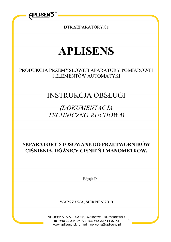 DTR.SEPARATORY.01 APLISENS PRODUKCJA PRZEMYSŁOWEJI APARATURY POMIAROWEJ I ELEMENTÓW AUTOMATYKI INSTRUKCJA OBSŁUGI (DOKUMENTACJA TECHNICZNO-RUCHOWA) SEPARATORY STOSOWANE DO PRZETWORNIKÓW CIŚNIENIA, RÓśNICY CIŚNIEŃ I MANOMETRÓW. Edycja D WARSZAWA, SIERPIEN 2010 APLISENS S.A., 03-192 Warszawa, ul. Morelowa 7 tel. +48 22 814 07 77; fax +48 22 814 07 78 www.aplisens.pl, e-mail: [email protected] D 1 DTR.SEPARATORY.01 SPIS TREŚCI 1. WSTĘP........................................................................................................................... 2 2. PRZEZNACZENIE I CECHY CHARAKTERYSTYCZNE ................................................ 2 3. DANE TECHNICZNE...................................................................................................... 3 4. ZALECENIA DOTYCZĄCE DOBORU SEPARATORÓW............................................... 3 5. MIEJSCE INSTALOWANIA. MONTAś ........................................................................... 3 6. PRZEGLĄDY.................................................................................................................. 3 7. WSTĘPNA INFORMACJA O PRESOSTATACH............................................................ 3 8. WYKAZ SEPARATORÓW PRODUKCJI APLISENS ..................................................... 4 9. SZCZEGÓŁOWE DANE O SEPARATORACH. ............................................................. 5 9.1. SEPARATORY KOŁNIERZOWE PŁASKIE TYPU S-P............................................................................... 5 9.2. SEPARATORY KOŁNIERZOWE TUBUSOWE TYPU S-T .......................................................................... 6 9.3. SEPARATORY TYPU S-DIN, S-CLAMP, S-POZIOM ZE STANDARDOWYMI ZŁĄCZAMI HIGIENICZNYMI ................ 7 9.4. SEPARATORY TYPU S-MAZUT DLA MEDIÓW GORĄCYCH O DUśEJ LEPKOŚCI ......................................... 8 9.5. SEPARATORY KOŁNIERZOWE CHEMOODPORNE TYPU S-CH ............................................................... 9 9.6. SEPARATORY KOMPAKTOWE TYPU S-COMP Z PRZECIWKOŁNIERZAMI ................................................10 9.7. SEPARATORY KOMPAKTOWE CHEMOODPORNE TYPU S-COMPCH......................................................11 9.8. SEPARATORY TYPU S-RC DLA MEDIÓW GORĄCYCH, LEPKICH KRZEPNĄCYCH LUB ZAPYLONYCH ........12 D 2 DTR.SEPARATORY.01 DOKUMENTACJA TECHNICZNO RUCHOWA SEPARATORÓW STOSOWANYCH DO PRZETWORNIKÓW CIŚNIENIA, RÓśNICY CIŚNIEŃ I MANOMETRÓW 1. WSTĘP Niniejsza DTR zawiera dane dotyczące separatorów oraz wspólne dane charakteryzujące przetworniki ciśnienia i róŜnicy ciśnień z separatorami. Dane dotyczące separatorów, zawarte w niniejszej DTR mogą być wykorzystywane przy instalowaniu i uŜytkowaniu wszystkich typów przetworników ciśnienia z separatorami np. APC-2000, APC-2000ALW, APC-2000/XX PROFIBUS PA, PC-28, PC-50 i przetworników róŜnicy ciśnień z separatorami np. PR-54, APR-2000, APR-2000ALW, APR-2000/XX PROFIBUS PA, APR-2200, APR-2200ALW, APR-2200/XX PROFIBUS PA oraz manometrów typu MS z separatorami. 2. PRZEZNACZENIE I CECHY CHARAKTERYSTYCZNE Przetworniki ciśnienia, róŜnicy ciśnień i manometry z separatorami, są przeznaczone do pomiaru ciśnienia, poziomu i róŜnicy ciśnień, w trudnych warunkach pomiaru, gdzie konieczne jest stosownie specjalnych przyłączy procesorowych (przemysł spoŜywczy, chemiczny). Przetwornik ciśnienia (lub manometr), wyposaŜony jest wtedy w jeden, a przetwornik róŜnicy ciśnień w jeden lub dwa separatory produkcji APLISENS wyspecyfikowane w p.8. Separator powoduje oddzielenie przetwornika od medium, a ciśnienie przekazywane jest poprzez membranę separującą za pośrednictwem cieczy manometrycznej wypełniającej przestrzeń pomiędzy membraną separatora a głowicą przetwornika. W wyniku separacji, następuje zmniejszenie wpływu na pomiar, niekorzystnych parametrów charakteryzujących medium i warunki pracy takich jak np.: - wysoka lub niska temperatura - duŜa lepkość, zawartość osadów i zanieczyszczeń - działanie korozyjne medium - drgania i wibracje instalacji, (separacja odległościowa). 2.2. Pod względem przeznaczenia, oferowane separatory podzielić moŜna na kilka grup, z których kaŜda zawiera z kolei kilka wykonań. NajwaŜniejsze z tych grup to: a. separatory kołnierzowe płaskie, b. separatory kołnierzowe tubusowe do pomiaru mediów krystalizujących w zbiornikach wielopłaszczowych c. separatory ze złączami higienicznymi - o konstrukcjach przystosowanych do pomiaru w warunkach aseptycznych. W wykonaniach specjalnych moŜe być zastosowana ciecz NEOBEE M-20 – dopuszczona do kontaktu z Ŝywnością. Posiadają atest PZH. d. separatory do tlenu – jako ciecz manometryczną zastosowano chemicznie bierną ciecz Fluorolube e. separatory do mediów gorących o duŜej lepkości (np. mazut), f. separatory chemoodporne g. separatory specjalne – o budowie nietypowej Większość separatorów z grup wymienionych wyŜej, mogą być z kolei wykonywane w 2 wersjach jako separatory bezpośrednie zmontowane w jeden blok z przetwornikiem, lub odległościowe – połączone z przetwornikiem kapilarą, stosowane np. do oddzielania się od wpływu wibracji i wysokiej temperatury medium. 2.3. Przetworniki ciśnienia i róŜnicy ciśnień z separatorem mogą pracować w przestrzeniach zagroŜonych wybuchem– zgodnie z DTR ,,przedmiotowymi” dla wykonań Ex. D 3. 3 DTR.SEPARATORY.01 DANE TECHNICZNE 3.1. Materiały konstrukcyjne Przylga separatora 316Lss (00H17N14M2) lub teflon, nikiel, tytan, tantal, hastelloy, monel Membrana separatora 316Lss (00H17N14M2) lub teflon, nikiel, tytan, tantal, hastelloy, monel Ciecz wypełniająca wnętrze separatorów olej silikonowy, olej jadalny, ciecz Fluorolube 3.2. Pozostałe dane techniczne dotyczące separatorów podano w p. 9 4. ZALECENIA DOTYCZĄCE DOBORU SEPARATORÓW Podstawowym problemem metrologicznym przy stosowaniu separatorów jest bezwzględny błąd temperaturowy ,,z