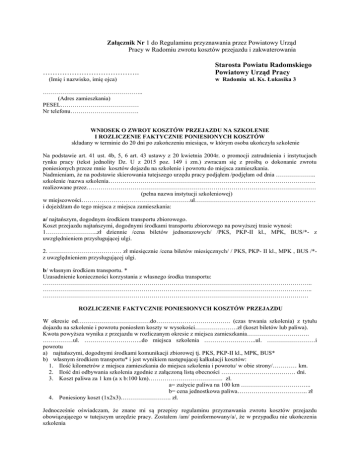 Załącznik Nr 1 do Regulaminu przyznawania przez Powiatowy Urząd Pracy w Radomiu zwrotu kosztów przejazdu i zakwaterowania …………………………………. (Imię i nazwisko, imię ojca) Starosta Powiatu Radomskiego Powiatowy Urząd Pracy w Radomiu ul. Ks. Łukasika 3 ………………………………………….. (Adres zamieszkania) PESEL………………………………… Nr telefonu……………………………. WNIOSEK O ZWROT KOSZTÓW PRZEJAZDU NA SZKOLENIE I ROZLICZENIE FAKTYCZNIE PONIESIONYCH KOSZTÓW składany w terminie do 20 dni po zakończeniu miesiąca, w którym osoba ukończyła szkolenie Na podstawie art. 41 ust. 4b, 5, 6 art. 43 ustawy z 20 kwietnia 2004r. o promocji zatrudnienia i instytucjach rynku pracy (tekst jednolity Dz. U z 2015 poz. 149 i zm.) zwracam się z prośbą o dokonanie zwrotu poniesionych przeze mnie kosztów dojazdu na szkolenie i powrotu do miejsca zamieszkania. Nadmieniam, że na podstawie skierowania tutejszego urzędu pracy podjąłem /podjęłam od dnia ……………….. szkolenie /nazwa szkolenia…………………………………………………………………………………………. realizowane przez…………………………………………………………………………………………………… (pełna nazwa instytucji szkoleniowej) w miejscowości………………………………………………ul…………………………………………………… i dojeżdżam do tego miejsca z miejsca zamieszkania: a/ najtańszym, dogodnym środkiem transportu zbiorowego. Koszt przejazdu najtańszymi, dogodnymi środkami transportu zbiorowego na powyższej trasie wynosi: 1……………………..zł dziennie /cena biletów jednorazowych/ /PKS, PKP-II kl., MPK, BUS/*- z uwzględnieniem przysługującej ulgi. 2. ……………………………… zł miesięcznie /cena biletów miesięcznych/ / PKS, PKP- II kl., MPK , BUS /*z uwzględnieniem przysługującej ulgi. b/ własnym środkiem transportu. * Uzasadnienie konieczności korzystania z własnego środka transportu: …………………………………………………………………………………………………………………….. …………………………………………………………………………………………………………………….. …………………………………………………………………………………………………………………… ROZLICZENIE FAKTYCZNIE PONIESIONYCH KOSZTÓW PRZEJAZDU W okresie od………………………………do………………………………. (czas trwania szkolenia) z tytułu dojazdu na szkolenie i powrotu poniosłem koszty w wysokości…………………zł (koszt biletów lub paliwa). Kwota powyższa wynika z przejazdu w rozliczanym okresie z miejsca zamieszkania…………………………. ……………ul. ………………………..do miejsca szkolenia ……………………..ul. ……………………i powrotu a) najtańszymi, dogodnymi środkami komunikacji zbiorowej tj. PKS, PKP-II kl., MPK, BUS* b) własnym środkiem transportu* i jest wynikiem następującej kalkulacji kosztów: 1. Ilość kilometrów z miejsca zamieszkania do miejsca szkolenia i powrotu/ w obie strony/………… km. 2. Ilość dni odbywania szkolenia zgodnie z załączoną listą obecności ………………………………. dni. 3. Koszt paliwa za 1 km (a x b:100 km)………………………………. zł. a= zużycie paliwa na 100 km …………………………….. b= cena jednostkowa paliwa…………………………….. zł 4. Poniesiony koszt (1x2x3)……………………. zł. Jednocześnie oświadczam, że znane mi są przepisy regulaminu przyznawania zwrotu kosztów przejazdu obowiązującego w tutejszym urzędzie pracy. Zostałem /am/ poinformowany/a/, że w przypadku nie ukończenia szkolenia z własnej winy z wyjątkiem przyczyn wymienionych w art.41 ust.6 ustawy o promocji (…), tj. podjęcie zatrudnienia, innej pracy zarobkowej lub działalności gospodarczej jestem zobowiązany/a/ do zwrotu kosztów dojazdu Załączniki potwierdzone za zgodność z oryginałem: 1. 2. 3. 4. 5. Zaświadczenie lub oświadczenie o cenie biletu miesięcznego /jednorazowego. Zaświadczenie o ukończeniu szkolenia. Listy obecności na szkoleniu. Potwierdzenie w przypadku osób poszukujących pracy wymienionych w art. 43 ustawy promocji (…) spełniania jednego z wymienionych w tym artykule warunków. Bilety za przejazdy. Ponadto za wyjątkiem pkt 5 w przypadku dojazdu własnym środkiem transportu: 1. 2. Kserokopia dowodu rejestracyjnego pojazdu. Kserokopia prawa jazdy. Świadomy odpowiedzialności karnej za składanie nieprawdziwych zeznań (art. 233 § 1 KK **) oświadczam, że dane zawarte w niniejszym wniosku są zgodne z prawdą. ……………………………..……………… (Data i czytelny podpis wnioskodawcy) *) Niepotrzebne skreślić **) Art. 233 § 1 KK : „Kto składając zeznanie mające służyć za dowód w postępowaniu sądowym lub innym postępowaniu prowadzonym na podstawie ustawy zeznaje nieprawdę lub zataja prawdę podlega karze pozbawienia wolności do lat 3„ UWAGA: Starosta może odmówić dokonania zwrotu w przypadku nie spełniania warunków określonych w regulaminie, niewłaściwego udokumentowania poniesionych kosztów, bądź wyczerpania limitu środków.