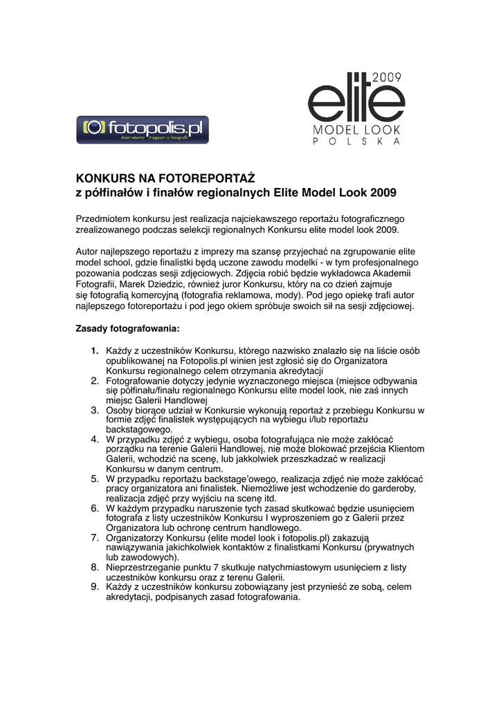 KONKURS NA FOTOREPORTAŻ z półfinałów i finałów regionalnych Elite Model Look 2009 Przedmiotem konkursu jest realizacja najciekawszego reportażu fotograficznego zrealizowanego podczas selekcji regionalnych Konkursu elite model look 2009. Autor najlepszego reportażu z imprezy ma szansę przyjechać na zgrupowanie elite model school, gdzie finalistki będą uczone zawodu modelki - w tym profesjonalnego pozowania podczas sesji zdjęciowych. Zdjęcia robić będzie wykładowca Akademii Fotografii, Marek Dziedzic, również juror Konkursu, który na co dzień zajmuje się fotografią komercyjną (fotografia reklamowa, mody). Pod jego opiekę trafi autor najlepszego fotoreportażu i pod jego okiem spróbuje swoich sił na sesji zdjęciowej. Zasady fotografowania: 1. Każdy z uczestników Konkursu, którego nazwisko znalazło się na liście osób opublikowanej na Fotopolis.pl winien jest zgłosić się do Organizatora Konkursu regionalnego celem otrzymania akredytacji 2. Fotografowanie dotyczy jedynie wyznaczonego miejsca (miejsce odbywania się półfinału/finału regionalnego Konkursu elite model look, nie zaś innych miejsc Galerii Handlowej 3. Osoby biorące udział w Konkursie wykonują reportaż z przebiegu Konkursu w formie zdjęć finalistek występujących na wybiegu i/lub reportażu backstagowego. 4. W przypadku zdjęć z wybiegu, osoba fotografująca nie może zakłócać porządku na terenie Galerii Handlowej, nie może blokować przejścia Klientom Galerii, wchodzić na scenę, lub jakkolwiek przeszkadzać w realizacji Konkursu w danym centrum. 5. W przypadku reportażu backstageʼowego, realizacja zdjęć nie może zakłócać pracy organizatora ani finalistek. Niemożliwe jest wchodzenie do garderoby, realizacja zdjęć przy wyjściu na scenę itd. 6. W każdym przypadku naruszenie tych zasad skutkować będzie usunięciem fotografa z listy uczestników Konkursu I wyproszeniem go z Galerii przez Organizatora lub ochronę centrum handlowego. 7. Organizatorzy Konkursu (elite model look i fotopolis.pl) zakazują nawiązywania jakichkolwiek kontaktów z finalistkami Konkursu (prywatnych lub zawodowych). 8. Nieprzestrzeganie punktu 7 skutkuje natychmiastowym usunięciem z listy uczestników konkursu oraz z terenu Galerii. 9. Każdy z uczestników konkursu zobowiązany jest przynieść ze sobą, celem akredytacji, podpisanych zasad fotografowania.