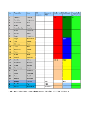 Lp Nazwisko Imię 1 Pociecha Elżbieta 2 Kowalska Małgorzata 3 Kucharczyk Ilona 4 Kuboń Ilona 5 Krzyszkowska Angelika 6 Kupiec Magdalena 7 Kuczek Alicja 8 Ligęza Magdalena 9 Bajger Aleksandra 10 Giża Justyna 11 Górowska Aneta 12 Gucwa Anna 13 Juszkiewicz Justyna 14 Kantor Anna 15 Wideł Aneta 16 Kurczab Agnieszka 17 Balicka Sylwia 18 Rogaliński Wojciech 19 Roman Karolina 20 Rubaszewska Natalia 21 Szot Katarzyna 22 Kluska Weronika 23 Malski Daniel 24 Strójwąs Weronika 1 Kwaśna Patrycja AI/2 2 Dziedzic Agata AI/2 3 Zuwała Aleksandra zwolniona Nr indeksu Lektorat AI/1 Bad w piel Bad fizyk Farmakolo gia/diet/pat BP I F1 1 BF 2 BF BP II 3 BF 4BF + KULA ALEKSANDRA – do tej Grupy razem z KWAŚNA DZIEDZIC ZUWAŁA Lp Nazwisko Imię 4 Kasperowicz Jakub 5 Rudnik Aleksandra 6 Kosoń Kinga 7 Kasperowicz Magdalena 8 Woźniczka Beata 9 Cebula Sylwia 10 Charchut Wioletta 11 Krudysz Agnieszka 12 Madejska Anna 13 Kmiecik Aleksandra 14 Kras Alicja 15 Kołaczek Adam 16 Kłósek Patrycja 17 Kruk Iwona 18 Boduch Anna 19 Budzyń Ewelina 20 Jackowska Justyna 21 Kawalec Paulina 22 Klimczak Agata 23 Bernasiewicz Agata 24 Stefańczyk Anna 25 Łakoma Natalia Nr indeksu Lektorat AI/2 Bad w piel Bad fizyk 4 BF BP III Farmakolo gia/diet/pat F1 5 Bf F2 6 BF Lp Nazwisko Imię 1 Merchut Katarzyna 2 Piątek Paulina 3 Szewczyk Paulina 4 Porwisz Joanna 5 Porosło Paulina 6 Maślanka Gabriela 7 Szumlańska Barbara 8 Ważydrąg Paulina 9 Mazgaj Daria 10 Podraza Aleksandra 11 Truchan Aleksandra 12 Woźniak Karolina 13 Wszołek Anna 14 Zdziarska Patrycja 15 Zelek Aldona 16 Wójtowicz Agnieszka 17 Reczkowska Justyna 18 Pytel Wiktoria 19 Pieprzny Wiktoria 20 Jewulska Marlena 21 Mróz Jakub 22 Mężyk Aleksandra 23 Mazur Anna Nr indeksu Lektorat AI/3 Bad w piel Bad fizyk BP IV 7 BF = 8 BF BP V 9 BF Farmakolo gia/diet/pat Lp Nazwisko Imię Nr indeksu 1 Bartoń Karolina 28108 2 Cąber Klaudia 3 Dynak Kinga 4 Gniadek Adrianna 5 Grabiec Katarzyna 6 Grabowska Paulina 7 Kukla Kamila 8 Kukla Karolina 9 Ryndak Sebastian 10 Bobulska Patrycja 11 Galas Wioletta 12 Giża Olga 13 Laska Korneliusz 14 Legutko Karolina 15 Łętkiewicz Barbara 16 Nowak Karolina 17 Kot Klaudia Lektorat AI/21 Bad w piel Bad fizyk BP V Farmakolo gia/diet/pat 9 BF 10 BF F3 BP VI 11 BF Lp Nazwisko Imię 1 Grzegórzek Łukasz 2 Wabno Dominika 3 Słota Marcelina 4 Stężowska Natalia 5 Stopa Ewa 6 Trzaskuś Olga 7 Pych Anita 8 Szatko Natalia 9 Sak Angelika 10 Siedlik Krystyna 11 Smagacz Paulina 12 Wiśniowska Anna 13 Wojtas Magdalena 14 Kruczała Joanna 15 Potępa Patryk 16 Zachara Natalia 17 Ostrowska Karolina 18 Pajdak Aleksandra 19 Rogoziński Michał 20 Rusinek Agata 21 Kaleta Paulina 28128 22 Kądzielawa Aleksandra 28133 Nr indeksu Lektorat AI/22 Bad w piel Bad fizyk Farmakolo gia/diet/pat BP VI 12 BF F3 BP VII 13 BF 28206 14 BF 28680 Pływalnia W-F wtorek