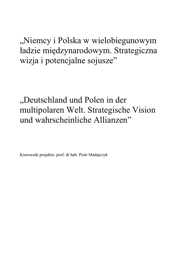 „Niemcy i Polska w wielobiegunowym ładzie międzynarodowym. Strategiczna wizja i potencjalne sojusze” „Deutschland und Polen in der multipolaren Welt. Strategische Vision und wahrscheinliche Allianzen” Kierownik projektu: prof. dr hab. Piotr Madajczyk Projekt Uczelni Łazarskiego We współpracy z Niemieckim Instytutem Historycznym Współfinansowany przez Fundację Współpracy Polsko-Niemieckiej w którym uczestniczą także pracownicy Instytutu Studiów Politycznych PAN realizowany w 2016 roku. Opis projektu: Po rozpadzie ładu bipolarnego, a następnie okresie dominacji Stanów Zjednoczonych następuje w XXI wieku nowe ukształtowanie współczesnego świata. W projekcie ukazane zostaną historia i warunkowania kształtowania się nowego wielobiegunowego ładu międzynarodowego i miejsce w tym procesie Polski i Niemiec. Punktem odniesienia będą mające w polskiej i niemieckiej perspektywie kluczowe znaczenie: USA i Rosja. W oparciu o toczone debaty naukowe, publicystyczne i polityczne przeanalizowane zostaną wybrane kluczowe problemy. Czy RFN wraz z Rosją będą starały się uzyskać status mocarstw światowych i staną się ważnymi filarami nowego multipolarnego ładu globalnego? Jaki wpływ na politykę niemiecką i polską mieć będą wahania w relacjach Rosja - USA i załamanie się koncepcji tzw. resetu? Jaka będzie atrakcyjność modeli proponowanych przez poszczególne państwa: Niemcy odwołują się do idei "cywilności", Rosja bojowości. Czy nadal atrakcyjny jest niemiecki model społecznej gospodarki rynkowej? Z polskiej perspektywy ogromnie ważne jest pytanie o wpływ wojny rosyjsko-ukraińskiej na politykę RFN wobec Rosji, a także szerzej wobec państw należących do Partnerstwa Wschodniego. Nach dem Zerfall der bipolaren Weltordnung, und dann der Periode der Dominanz der Vereinigten Staaten, erfolgt zur Zeit die Neugestaltung der Weltordnung. In dem Projekt wurde Geschichte und Bedingungen des Entstehungsprozesses einer multipolaren Weltordnung, und die Rolle in diesem Prozess Polens und Deutschlands. Beziehungspunkt sind Staaten, die aus der polnischen und deutschen Perspektive eine entscheidende Rolle spielen: US und Russland. Auf der Grundlage der wissenschaftlichen, öffentlichen und politischen Debatten werden die Schlüsselfragen analysiert. Werden BRD und Russland versuchen eine Weltmacht und Stütze der multipolaren, globalen Weltordnung zu sein? Welche Bedeutung für die deutsche und polnische Außenpolitik werden die Veränderungen in den Beziehungen Russland - US und Fiasko der Konzeption sgn. Resets haben? Welche ist Attraktivität der politisch-gesellschaftlichen Models, der deutschen und der russischen? Ist noch das Model der sozialen Marktwirtschaft attraktiv? Aus der polnischen Perspektive wichtig ist die Frage nach dem Einfluss des russisch-ukrainischen Krieges auf die deutsche Russlandpolitik, und gegenüber der Östlichen Partnerschaf. Uczestnicy projektu: Piotr Madajczyk Uczelnia Łazarskiego / ISP PAN Niemiecka polityka wobec Rosji a konflikt rosyjsko-ukraiński Józef Fiszer Uczelnia Łazarskiego PAN Polityka RFN wobec Rosji w multipolarnym ładzie globalnym: jej cele, zadania i konsekwencje dla Europy Jens Boysen Wanda Jarząbek Krzysztof Garczewski Martin Dahl /ISP Uczelnia Łazarskiego/DHI Niemiecka ‘cywilność’ a rosyjska ‘bojowość’ jako czynniki strategicznej orientacji w kontekście międzynarodowego bezpieczeństwa Instytut Studiów Politycznych PAN Wpływ załamania się koncepcji „resetu” w stosunkach amerykańsko-rosyjskich na stosunki amerykańsko-niemieckie Uczelnia Łazarskiego RFN wobec państw Partnerstwa Wschodniego, w kontekście niemieckiej polityki wschodniej w XXI wieku Uczelnia Łazarskiego Niemiecki model społecznej gospodarki rynkowej jako wzór reform dla państw w procesie przemian systemowych Konferencja: Uczelnia Łazarskiego wraz z Fundacją Współpracy Polsko-Niemieckiej mają zaszczyt zaprosić Państwa na ogólnopolską konferencję naukową nt. „Niemcy i Polska w wielobiegunowym ładzie międzynarodowym. Strategiczna wizja i potencjalne sojusze”. Uczestnicy konferencji podejmą próbę ukazania uwarunkowań kształtowania się nowego wielobiegunowego ładu międzynarodowego i miejsce w tym procesie Polski i Niemiec. Jednym z celów konferencji jest ukazanie, jak po rozpadzie ładu bipolarnego, a następnie po okresie dominacji Stanów Zjednoczonych następuje w XXI wieku nowe ukształtowanie współczesnego świata. Data: 17 października 2016 r. Miejsce: Uczelnia Łazarskiego, ul. Świeradowska 43, 02-662 Warszawa Aula: 58 Plan konferencji 10.00 – 10.15 Rozpoczęcie konferencji prof. nadzw. dr hab. Bogna Gawrońska-Nowak, Dziekan Wydziału EiZ Uczelni Łazarskiego dr hab. Krzysztof Miszczak, Dyrektor Fundacji Współpracy PolskoNiemieckiej (FWPN) prof. dr hab. Piotr Madajczyk – Przedstawienie koncepcji projektu Panel I 10.15 – 10.35 – prof. dr hab. Józef Fiszer, Polityka RFN wobec Rosji w multipolarnym ładzie globalnym: jej cele, zadania i konsekwencje dla Europy, Instytut Studiów Politycznych PAN/Uczelnia Łazarskiego 10.35 – 10.55 – dr hab. Wanda Jarząbek, Wpływ załamania się koncepcji „resetu” w stosunkach amerykańsko-rosyjskich na stosunki amerykańskoniemieckie, Instytut Studiów Politycznych PAN 10.55 – 11.40 - Dyskusja 11.40 – 11.50 Przerwa na kawę Panel II 11.50 – 12.10 prof. dr hab. Piotr Madajczyk, Niemiecka i polska polityka wobec Rosji a konflikt rosyjsko-ukraiński, Instytut Studiów Politycznych PAN/Uczelnia Łazarskiego 12.10 – 12.30 dr Krzysztof Garczewski, RFN wobec państw Partnerstwa Wschodniego, w kontekście niemieckiej polityki wschodniej w XXI wieku. Implikacje dla Polski, Akademia Humanistyczna im. Aleksandra Gieysztora 12.30-13.15 Dyskusja 13.15 – 13.25 Przerwa na kawę Panel III 13.25 – 13.55 dr Jens Boysen, Niemiecka ‘cywilność’ a rosyjska ‘bojowość’ jako czynniki strategicznej orientacji w kontekś