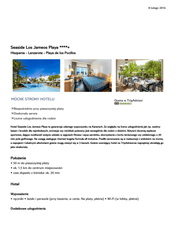 8 lutego 2016 Biuro Podrozy TU I TAM ul. Odrodzenia 3a 59-300 Lubin [email protected] 76 846 18 02 Seaside Los Jameos Playa ****+ Państwa konsultant: Krzysztof Raczkowiak e-mail: [email protected] Hiszpania - Lanzarote - Playa de los Pocillos MOCNE STRONY HOTELU Ocena w TripAdvisor »Bezpośrednio przy piaszczystej plaży »Doskonały serwis »Liczne udogodnienia dla rodzin Hotel Seaside Los Jameos Playa to gwarancja udanego wypoczynku na Kanarach. Ze względu na liczne udogodnienia jak np. osobny basen i brodzik dla najmłodszych, animacje czy miniklub polecany jest szczególnie dla rodzin z dziećmi. Aktywni docenią zaplecze sportowe, dające możliwość wzięcia udziału w zajęciach fitness i aqua aerobiku, skorzystania z kortu tenisowego czy oddalonego o 20 min pola golfowego. Na uwagę zasługuje również bogata formuła all inclusive. Posiłki serwowane są w restauracji z widokiem na morze, a napojami i lokalnymi alkoholami goście mogą cieszyć się w 3 barach. Goście oceniający hotel na TripAdvisorze najczęściej określają go jako doskonały. Położenie • 50 m do piaszczystej plaży • ok. 1,5 km do centrum miejscowości • czas dojazdu z lotniska: ok. 20 min Hotel Wyposażenie • ręczniki • leżaki i parasole (przy basenie, w cenie. Na plaży, płatne) • Wi-Fi (w lobby, płatne) Dodatkowe udogodnienia • butik • salon fryzjerski • pralnia (płatne) • parking Karty Visa, MasterCard Kategoria lokalna 4,5 gwiazdki Liczba pokojów 530 Pokoje Pokój 2-osobowy (DZX1) • 2-3 os. • ok. 26-30 m2 • klimatyzacja • taras • prysznic z wanną, • WC • suszarka do włosów • lodówka • TV • sejf (płatny) • minibar (płatny) • telefon. Pokój 2-osobowy (DZX2) • 1-3 os. • widok na ogród, na basen lub boczny widok na morze • ok. 26-30 m2 • klimatyzacja • balkon lub taras • prysznic z wanną, • WC • suszarka do włosów • lodówka • TV • sejf (płatny) • minibar (płatny) • telefon. Pokój 2-osobowy (DZX3) • 1-3 os. • widok na ogród, na basen lub na morze • ok. 26-30 m2 • klimatyzacja • taras • prysznic z wanną, • WC • suszarka do włosów • lodówka • TV • sejf (płatny) • minibar (płatny) • telefon. Pokój 2-osobowy (DZX4) • 1-3 os. • widok na ogród, na basen lub na morze • ok. 26-30 m2 • klimatyzacja • możliwość wstawienia dostawki • balkon lub taras • prysznic z wanną, • WC • suszarka do włosów • lodówka • ekspres do kawy • TV • sejf (płatny) • minibar (płatny) • telefon. Pokój rodzinny (FZX1) • 2-4 os. • widok na morze • ok. 31-35 m2 • klimatyzacja • balkon lub taras • ekspres do kawy • prysznic z wanną, • WC • suszarka do włosów • lodówka • TV • sejf (płatny) • minibar (płatny) • telefon. Junior suita (JSX1) • 1-4 os. • 36-40 m2 • widok na ogród, morze lub na basen • salon łączony z sypialnią • możliwość dostawki • balkon • prysznic z wanną • WC • suszarka do włosów • TV • ekspres do kawy • telefon • sejf (za opłatą) • minibar (za opłatą). Wyżywienie All inclusive • śniadanie i obiadokolacja • popołudniowe przekąski, ciasta i gorące napoje • napoje bezalkoholowe • lokalne napoje alkoholowe (11:00- 23:00). Dla dzieci • miniklub (od 4-12 lat) • 2 brodziki • minidisco • opiekunka do dzieci (płatna) Sport i Wellness W cenie • suana • łaźnia turecka • fitness • aqua aerobik • łucznictwo. Płatne • centrum odnowy biologicznej • masaże • nurkowanie • pole golfowe (ok. 3000 m od hotelu) • 4 korty tenisowe • wypożyczenie sprzętu do tenisa. Rozrywka • codzienne animacje • imprezy taneczne