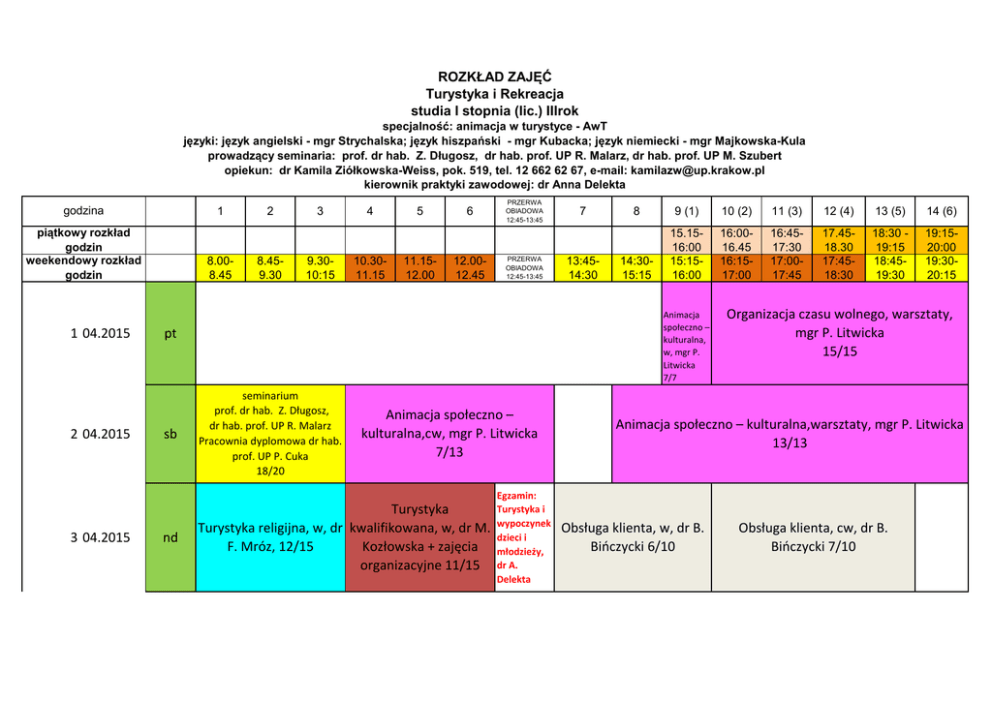 ROZKŁAD ZAJĘĆ Turystyka i Rekreacja studia I stopnia (lic.) IIIrok specjalność: animacja w turystyce - AwT języki: język angielski - mgr Strychalska; język hiszpański - mgr Kubacka; język niemiecki - mgr Majkowska-Kula prowadzący seminaria: prof. dr hab. Z. Długosz, dr hab. prof. UP R. Malarz, dr hab. prof. UP M. Szubert opiekun: dr Kamila Ziółkowska-Weiss, pok. 519, tel. 12 662 62 67, e-mail: [email protected] kierownik praktyki zawodowej: dr Anna Delekta godzina 1 piątkowy rozkład godzin weekendowy rozkład godzin 1 04.2015 2 04.2015 3 04.2015 8.008.45 2 8.459.30 3 9.3010:15 4 10.3011.15 5 11.1512.00 6 12.0012.45 PRZERWA OBIADOWA 12:45-13:45 PRZERWA OBIADOWA 12:45-13:45 nd 13:4514:30 8 9 (1) 10 (2) 11 (3) 12 (4) 13 (5) 14 (6) 14:3015:15 15.1516:00 15:1516:00 16:0016.45 16:1517:00 16:4517:30 17:0017:45 17.4518.30 17:4518:30 18:30 19:15 18:4519:30 19:1520:00 19:3020:15 Animacja społeczno – kulturalna, w, mgr P. Litwicka 7/7 pt sb 7 seminarium prof. dr hab. Z. Długosz, dr hab. prof. UP R. Malarz Pracownia dyplomowa dr hab. prof. UP P. Cuka 18/20 Animacja społeczno – kulturalna,cw, mgr P. Litwicka 7/13 Turystyka Turystyka religijna, w, dr kwalifikowana, w, dr M. F. Mróz, 12/15 Kozłowska + zajęcia organizacyjne 11/15 Egzamin: Turystyka i wypoczynek dzieci i młodzieży, dr A. Delekta Organizacja czasu wolnego, warsztaty, mgr P. Litwicka 15/15 Animacja społeczno – kulturalna,warsztaty, mgr P. Litwicka 13/13 Obsługa klienta, w, dr B. Bińczycki 6/10 Obsługa klienta, cw, dr B. Bińczycki 7/10 22 04.2015 pt 23 04.2015 sb 24 04.2015 nd 6 05.2015 pt 7 05.2015 8 05.2015 21 22 23 24 25 05.2015 05.2016 05.2016 05.2016 05.2016 sb nd zajęcia warsztatowe: Turystyka kwalifikowana, dr Małgorzata Kozłowska seminarium prof. dr hab. Z. Długosz, dr hab. prof. UP R. Malarz Pracownia dyplomowa dr hab. prof. UP P. Cuka realizowane zdalnie seminarium dr hab. prof. UP M. Szubert 14/20 seminarium dr hab. prof. UP M. Szubert 20/20 Krajoznawstwo, cw, dr hab. prof. UP M. Szubert 15/15 Turystyka religijna, w, dr F. Mróz, 15/15 Obsługa klienta, w, dr B. Bińczycki 10/10 sb nd pn wt śr Obsługa klienta, cw, dr B. Bińczycki 10/10 Regionalne ćwiczenia terenowe z krajoznawstwa, dr hab. prof. UP Mariusz Szubert dr Piotr Dolnicki 26 05.2016 godziny kontaktowe kod kursu nazwa kursu E/- punkty ECTS Szubert M, prof. Krajoznawstw o Produkcja roślinna i zwierzęca Padło T, dr Kozłowska M, dr Turystyka kwalifikowana Organizacja Litwicka P, czasu dr wolnego Augustowski Żywienie K, dr człowieka Turystyka i Delekta A, wypoczynek dr dzieci i młodzieży Turystyka Mróz F, dr religijna zajęć w grupach W A K L S P 15 15 30 15 15 30 15 15 30 moodle D. Okupny Wykład ogólnouczelni any/wydziałow y w języku obcym 2* 2 E 3 2 warsztaty 15 15 2 warsztaty 15 15 30 15 30 45 2 E 3 warsztaty 15 15 Wykład ogólnouczelni any/wydziałow y w języku polskim 3* Wykład ogólnouczelni any/wydziałow y w języku polskim 4* punkty ECTS E/- raze m nazwa kursu Elearni ng kod kursu 1 1 15 15 1 2 Cuka P, zajęcia w sali Pracownia prof., Malarz dyplomowa R, prof Długosz Z, prof. 20 Język obcy angielski B2C2 – 3** Język obcy 2 A1-C2 – 3*** Długosz Z, prof Malarz R, prof Szubert M, prof. 30 E 4 30 30 E 4 20 36 20 4 36 2 10 20 30 3 AWTIR 10 10 20 3 AWTIR 7 13 20 2 AWTIR warsztaty Formy turystyki kwalifikowanej 30 30 rodzaj zajęć Praktyka zawodowa* 4 AWTIR warsztaty 446 kod zajęć 1 30 Seminarium dyplomowe 2 Regionalne ćwiczenia Szubert M, terenowe z prof. krajoznawstw a**** Turystyka Rettinger R, biznesowa i dr eventowa Bińczycki B, Obsługa dr klienta Animacja Litwicka P, społeczno – mgr kulturalna Kozłowska M., dr 20 pracownia dyplomowa w ramach seminarium prof. R. Malarza oraz prof. Z. Długosza odbywają się w sposób indywidualny. godz 160 punkty ECTS tyg. 4 6