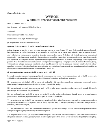Sygn. akt II K 37/15 WYROK W IMIENIU RZECZYPOSPOLITEJ POLSKIEJ Dnia 13 kwietnia 2015 r. Sąd Rejonowy w Przysusze II Wydział Karny w składzie : Przewodniczący : SSR Nina Kober Protokolant : sekr. sąd. Wiesława Pająk po rozpoznaniu w dniu 8 kwietnia 2015 r. sprawy D. L. syna S. i E. z d. P., urodzonego (...) w P. oskarżonego o to, że: w nocy z 23/24 stycznia 2015 r. w msc. S. gm. W. woj. (...) umyślnie naruszył zasady bezpieczeństwa w ruchu drogowym w ten sposób, że znajdując się w stanie nietrzeźwości wynoszącym 0,81 mg/ dm 3 alkoholu w wydychanym powietrzu kierując samochodem marki A. (...) nr rej. (...) nie zachował szczególnej ostrożności i nie dostosował prędkości do panujących warunków na drodze, w następstwie czego stracił panowanie nad pojazdem, a następnie bokiem pojazdu uderzył w przydrożne drzewo, w wyniku czego jadący z nim w pojeździe pasażer P. K. doznał złamania nasady dalszej kości promieniowej prawej i drugi pasażer A. Ś. doznał stłuczenia głowy, wstrząśnienia mózgu, złamania przedniej ściany zatoki czołowej prawej, złamania stropu i przyśrodkowej ściany oczodołu prawego, które to obrażenia spowodowały u wymienionych naruszenie czynności narządów ich ciała na okres, przekraczający dni siedem w rozumieniu art. 157§1 kk tj. o przestępstwo z art. 177§1 kk w zw. z art. 178§1 kk I. uznaje oskarżonego za winnego popełnienia zarzucanego mu czynu i za to na podstawie art. 177§1 kk w zw. z art. 178§1 kk wymierza mu karę 1 (jednego) roku i 6 (sześciu) miesięcy pozbawienia wolności, II. na podstawie art. 69§1 i 2 kk w zw. z art. 70§1 pkt 1 kk warunkowo zawiesza wykonanie orzeczonej wobec oskarżonego kary pozbawienia wolności na okres 3 (trzech) lat próby, III. na podstawie art. 71§1 kk w zw. z art. 33§1 i 3 kk orzeka wobec oskarżonego karę 100 (stu) stawek dziennych grzywny po 10 zł (dziesięć złotych) każda, IV. na podstawie art. 42§2 kk w zw. z art. 43§1 kk orzeka wobec oskarżonego środek karny w postaci zakazu prowadzenia wszelkich pojazdów mechanicznych na okres 3 (trzech) lat, V. na podstawie art. 63§1 kk na poczet orzeczonej względem oskarżonego grzywny zalicza oskarżonemu okres zatrzymania w dniach od 24 stycznia 2015 r. do 25 stycznia 2015 r., uznając grzywnę za uiszczoną do wysokości 4 (czterech) stawek dziennych, VI. na podstawie art. 63§2 kk zalicza oskarżonemu na poczet orzeczonego zakazu prowadzenia pojazdów okres zatrzymania prawa jazdy od dnia 24 stycznia 2015 roku, VII. na podstawie art. 627 kpk zasądza od oskarżonego na rzecz Skarbu Państwa kwotę 814,46 zł (ośmiuset czternastu złotych czterdziestu sześciu groszy) tytułem kosztów sądowych, w tym kwotę 400 zł (czterystu złotych) tytułem opłaty. Sygn. akt II K 37/15 UZASADNIENIE Sąd Rejonowy ustalił następujący stan faktyczny: Dnia 23 stycznia 2015 r. P. K. spotkał się ze swoim kolegą D. L., który przyjechał do niego do S. Mokrych swoim samochodem marki A. (...) o nr rej. (...). Około godz. 19.00 mężczyźni pojechali do P., skąd zabrali, mieszkającego w S. Mokrych A. Ś.. We trzech pojechali na stację paliw do W., gdzie kupili butelkę wódki o pojemności 0,7 l. Z alkoholem udali się na przystanek autobusowy w S. Mokrych, gdzie wypili kupioną wódkę. Następnie P. K. poszedł do sklepu, gdzie kupił dwa wina o pojemności 1 l. Kiedy koledzy wypili alkohol, P. K. zadzwonił po K. L.-brata D., z którym jeden z mężczyzn pojechał na stację paliw w W., gdzie kupił butelkę wódki o pojemności 0,5 l. Po powrocie na przystanek K. L. odjechał do domu, zaś pozostali mężczyźni wypili alkohol. Następnie jeździli po okolicy, a ostatecznie udali się, aby odwieźć P. K. do domu. Samochodem kierował D. L., P. K. siedział obok niego, zaś z tyłu siedział A. Ś.. Około 2.30 w nocy 24 stycznia 2015 r. w S. Mokrych na prostym odcinku drogi, przed łukiem w lewo, samochód wypadł z drogi i uderzył prawym bokiem w przydrożne drzewo. W miejscu zdarzenia świeciły dwie lampy uliczne, teren był niezabudowany. D. L. zadzwonił po brata, który przybiegł w opisane mu miejsce, na drodze pojawił się także K. K., który mieszkał niedaleko miejsca zdarzenia. Ponieważ A. Ś. i P. K. uskarżali się na ból, K. L. pobiegł do domu po samochód, a następnie zawiózł wszystkich trzech uczestników zdarzenia do szpitala w R.. K. K. sprowadził samochód na swoją posesję, znajdującą się w S. Mokrych pod nr 78. Samochód na skutek zdarzenia m.in. miał pękniętą szybę czołową, rozbity prawy przedni halogen z zabudową, rozbity prawy obrysowy kierunkowskaz, wybitą szybę w prawych przednich drzwiach, pogięte prawe przednie drzwi, urwane prawe lusterko, brak prawych tylnych drzwi, pogięte prawe tylne nadkole, rozbity prawy tylny reflektor zespolony wraz z prawym tylnym halogenem, brak powietrza w prawym tylnym kole. W szpitalu personel medyczny wezwał policję. Funkcjonariusze wykonali badania zawartości alkoholu w wydychanym powietrzu u P. K. (0,83 mg/l, 0,50 mg/l, 0,48 mg/l), D. L. (0,81 mg/l) i K. L. (0,00 mg/l), zaś od A. Ś. pobrano krew (1,92 promila). Następnie K. L. zabrany został przez policję na miejsce zdarzenia, zeznał także, chcąc chronić brata, że to on kierował samochodem w chwili wypadku. Na skutek zajścia P. K. doznał złamania nasady dalszej kości promieniowej prawej, zaś A. Ś. stłuczenia głowy, wstrząśnienia mózgu, złamania przedniej ściany zatoki czołowej prawej, złamania stropu i przyśrodkowej ściany oczodołu prawego, co spowodowało naruszenie czynności narządów ich ciała na okres przekraczający dni siedem w rozumieniu art. 157§1 kk (wyjaśnienia oskarżonego k. 109, zeznania P. K. k. 110, zeznania A. Ś. k. 110, cz. zeznania K. L. k. 110-111, protokół oględzin miejsca k. 3-4, protokół oględzin pojazdu k. 5-6, protokół badania stanu trzeźwości k. 8,9, 11, 21, świadectwo wzorcowania k. 10, 12, dokumentacja med