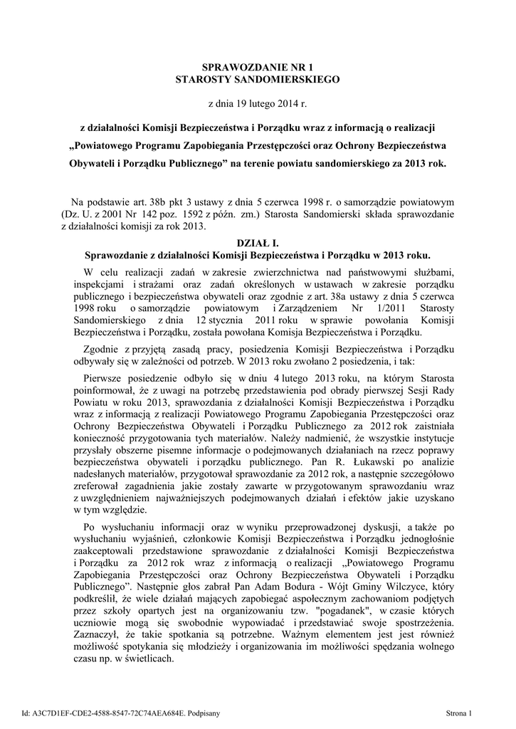 SPRAWOZDANIE NR 1 STAROSTY SANDOMIERSKIEGO z dnia 19 lutego 2014 r. z działalności Komisji Bezpieczeństwa i Porządku wraz z informacją o realizacji „Powiatowego Programu Zapobiegania Przestępczości oraz Ochrony Bezpieczeństwa Obywateli i Porządku Publicznego” na terenie powiatu sandomierskiego za 2013 rok. Na podstawie art. 38b pkt 3 ustawy z dnia 5 czerwca 1998 r. o samorządzie powiatowym (Dz. U. z 2001 Nr 142 poz. 1592 z późn. zm.) Starosta Sandomierski składa sprawozdanie z działalności komisji za rok 2013. DZIAŁ I. Sprawozdanie z działalności Komisji Bezpieczeństwa i Porządku w 2013 roku. W celu realizacji zadań w zakresie zwierzchnictwa nad państwowymi służbami, inspekcjami i strażami oraz zadań określonych w ustawach w zakresie porządku publicznego i bezpieczeństwa obywateli oraz zgodnie z art. 38a ustawy z dnia 5 czerwca 1998 roku o samorządzie powiatowym i Zarządzeniem Nr 1/2011 Starosty Sandomierskiego z dnia 12 stycznia 2011 roku w sprawie powołania Komisji Bezpieczeństwa i Porządku, została powołana Komisja Bezpieczeństwa i Porządku. Zgodnie z przyjętą zasadą pracy, posiedzenia Komisji Bezpieczeństwa i Porządku odbywały się w zależności od potrzeb. W 2013 roku zwołano 2 posiedzenia, i tak: Pierwsze posiedzenie odbyło się w dniu 4 lutego 2013 roku, na którym Starosta poinformował, że z uwagi na potrzebę przedstawienia pod obrady pierwszej Sesji Rady Powiatu w roku 2013, sprawozdania z działalności Komisji Bezpieczeństwa i Porządku wraz z informacją z realizacji Powiatowego Programu Zapobiegania Przestępczości oraz Ochrony Bezpieczeństwa Obywateli i Porządku Publicznego za 2012 rok zaistniała konieczność przygotowania tych materiałów. Należy nadmienić, że wszystkie instytucje przysłały obszerne pisemne informacje o podejmowanych działaniach na rzecz poprawy bezpieczeństwa obywateli i porządku publicznego. Pan R. Łukawski po analizie nadesłanych materiałów, przygotował sprawozdanie za 2012 rok, a następnie szczegółowo zreferował zagadnienia jakie zostały zawarte w przygotowanym sprawozdaniu wraz z uwzględnieniem najważniejszych podejmowanych działań i efektów jakie uzyskano w tym względzie. Po wysłuchaniu informacji oraz w wyniku przeprowadzonej dyskusji, a także po wysłuchaniu wyjaśnień, członkowie Komisji Bezpieczeństwa i Porządku jednogłośnie zaakceptowali przedstawione sprawozdanie z działalności Komisji Bezpieczeństwa i Porządku za 2012 rok wraz z informacją o realizacji „Powiatowego Programu Zapobiegania Przestępczości oraz Ochrony Bezpieczeństwa Obywateli i Porządku Publicznego”. Następnie głos zabrał Pan Adam Bodura - Wójt Gminy Wilczyce, który podkreślił, że wiele działań mających zapobiegać aspołecznym zachowaniom podjętych przez szkoły opartych jest na organizowaniu tzw. "pogadanek", w czasie których uczniowie mogą się swobodnie wypowiadać i przedstawiać swoje spostrzeżenia. Zaznaczył, że takie spotkania są potrzebne. Ważnym elementem jest jest również możliwość spotykania się młodzieży i organizowania im możliwości spędzania wolnego czasu np. w świetlicach. Id: A3C7D1EF-CDE2-4588-8547-72C74AEA684E. Podpisany Strona 1 Drugie posiedzenie Komisji Bezpieczeństwa i Porządku odbyło się w dniu 23 października 2013 roku. Omawianym tematem był stan bezpieczeństwa pożarowego na terenie powiatu sandomierskiego za 2013 rok przygotowany przez Komendę Powiatową Państwowej Straży Pożarnej w Sandomierzu. Pan Adam Czajka, Zastępca Komendanta Powiatowego PSP w Sandomierzu w swoim wystąpieniu szczegółowo omówił ww. temat. Poinformował, że w dniu 11 października odbyło się powiatowe ćwiczenie pod kryptonimem „AQUA 2013”. W ćwiczeniu brały udział służby z terenu powiatu sandomierskiego, Powiatowy i Gminny Zespół Zarządzania Kryzysowego w Dwikozach oraz instytucje takie jak WOPR, GR PCK i Państwowe Ratownictwo Medyczne. Ćwiczenie miało na celu doskonalenie umiejętności współdziałania służb ratowniczych, sprawdzeniem procedur postępowania w wypadkach zagrożenia życia i zdrowia oraz doskonalenie współpracy podczas usuwania skutków powodzi. Podzielone było na dwa epizody. Pierwszy miał charakter gry sztabowej, której celem było wypracowanie decyzji podczas występowania zdarzeń kryzysowych. Drugi epizod to praktyczne ćwiczenia, które miały na celu ograniczeniu skutków powodzi i odbywały się na terenie Gminy Dwikozy. Kontynuując swą wypowiedź przedstawiciel KP PSP podkreślił, że gdyby nie duże zaangażowanie i pomoc Starosty Sandomierskiego to ćwiczenie nie mogło by się odbyć aż na tak dużą skalę. Ponadto podziękował za dofinansowanie do zakupu sprężarki do napełniania butli powietrznych w aparatach ochrony dróg oddechowych i nurkowych. W dalszej części poinformował, że wiele jednostek OSP ma problem ze sprawnym funkcjonowaniem ponieważ coraz mniej młodych osób chce aktywnie działać w ich szeregach. Następnie głos zabrał Pan Wojciech Dzieciuch - Wicestarosta, który poinformował, że zakup sprężarki był słusznym zakupem, ponieważ będą z niego korzystać również jednostki OSP. Kontynuując zwrócił uwagę, że na terenie Miasta Sandomierz nie funkcjonuje jednostka OSP, która mogłaby brać czynny udział w działaniach ratowniczych. Jest to poważny problem, ponieważ Sandomierz często dotykany jest różnego rodzaju zdarzeniami klęskowymi, w usuwaniu których biorą udział strażacy z jednostek OSP. A koszty utrzymywania, doposażania i szkolenia jednostek OSP spoczywa na samorządach, z których dana jednostka pochodzi. DZIAŁ II. Sprawozdanie z realizacji Powiatowego Programu Zapobiegania Przestępczości oraz Ochrony Bezpieczeństwa Obywateli i Porządku Publicznego za 2013 rok. Powiatowy Program Zapobiegania Przestępczości oraz Ochrony Bezpieczeństwa Obywateli i Porządku Publicznego przyjęty Uchwałą Rady Powiatu Nr XXX/