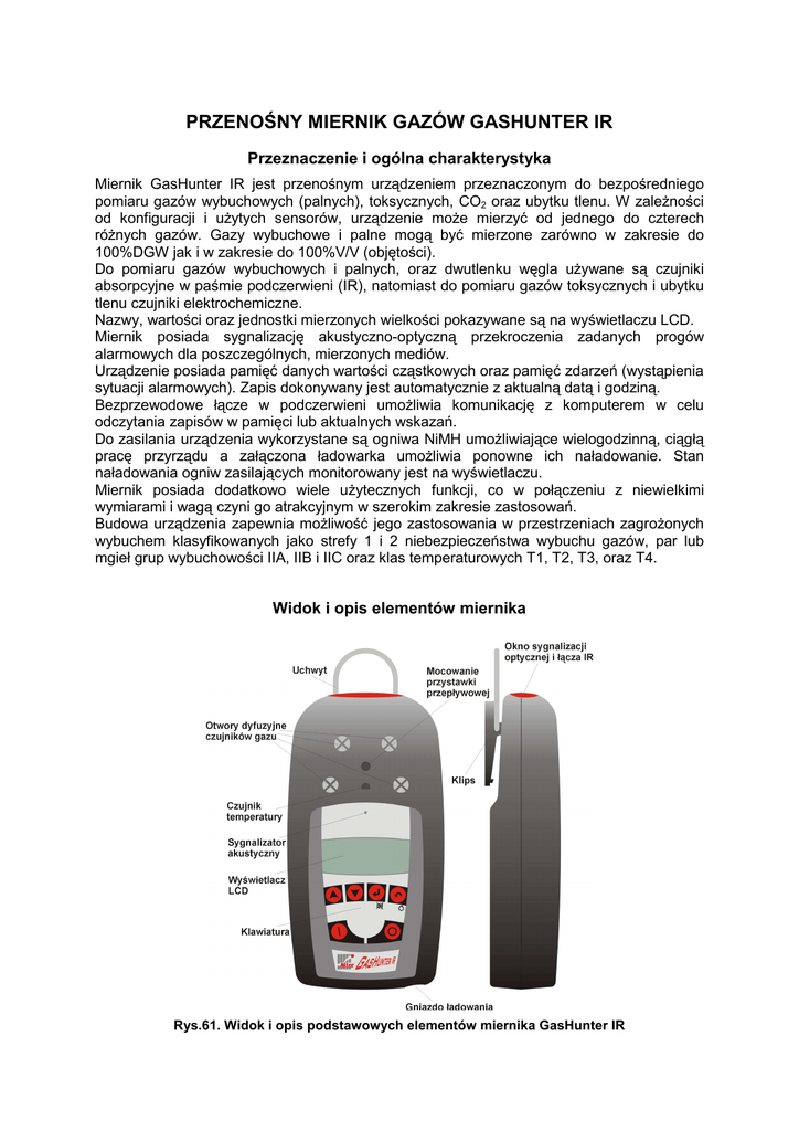 PRZENOŚNY MIERNIK GAZÓW GASHUNTER IR Przeznaczenie i ogólna charakterystyka Miernik GasHunter IR jest przenośnym urządzeniem przeznaczonym do bezpośredniego pomiaru gazów wybuchowych (palnych), toksycznych, CO2 oraz ubytku tlenu. W zależności od konfiguracji i użytych sensorów, urządzenie może mierzyć od jednego do czterech różnych gazów. Gazy wybuchowe i palne mogą być mierzone zarówno w zakresie do 100%DGW jak i w zakresie do 100%V/V (objętości). Do pomiaru gazów wybuchowych i palnych, oraz dwutlenku węgla używane są czujniki absorpcyjne w paśmie podczerwieni (IR), natomiast do pomiaru gazów toksycznych i ubytku tlenu czujniki elektrochemiczne. Nazwy, wartości oraz jednostki mierzonych wielkości pokazywane są na wyświetlaczu LCD. Miernik posiada sygnalizację akustyczno-optyczną przekroczenia zadanych progów alarmowych dla poszczególnych, mierzonych mediów. Urządzenie posiada pamięć danych wartości cząstkowych oraz pamięć zdarzeń (wystąpienia sytuacji alarmowych). Zapis dokonywany jest automatycznie z aktualną datą i godziną. Bezprzewodowe łącze w podczerwieni umożliwia komunikację z komputerem w celu odczytania zapisów w pamięci lub aktualnych wskazań. Do zasilania urządzenia wykorzystane są ogniwa NiMH umożliwiające wielogodzinną, ciągłą pracę przyrządu a załączona ładowarka umożliwia ponowne ich naładowanie. Stan naładowania ogniw zasilających monitorowany jest na wyświetlaczu. Miernik posiada dodatkowo wiele użytecznych funkcji, co w połączeniu z niewielkimi wymiarami i wagą czyni go atrakcyjnym w szerokim zakresie zastosowań. Budowa urządzenia zapewnia możliwość jego zastosowania w przestrzeniach zagrożonych wybuchem klasyfikowanych jako strefy 1 i 2 niebezpieczeństwa wybuchu gazów, par lub mgieł grup wybuchowości IIA, IIB i IIC oraz klas temperaturowych T1, T2, T3, oraz T4. Widok i opis elementów miernika Rys.61. Widok i opis podstawowych elementów miernika GasHunter IR Specyfikacja czujników pomiarowych Tabela 51. Specyfikacja czujników pomiarowych miernika GasHunter IR Uwagi Mierzone Typ czujnika Zakres Rozdzielczość Czas medium odpowiedzi T90 CH4 MSH-HC/TC 100%DGW 1%DGW <30sek IR 100%V/V 1%V/V 100%DGW 1%DGW HC* MSH-HHC/TC 100%V/V 1%V/V <30sek IR CO2 MSH-CO2/TC 5000ppm ≤50ppm <30sek IR 5%V/V ≤0,05%V/V MSH-HCO2/TC 100%V/V 1%V/V <30sek IR O2 4OX(2) 25%Vol 0,1%Vol <20sek CO 4CF 500ppm 1ppm <30sek Normalny H2S 4H 100ppm 0,1ppm <35sek Normalny SO2 4S 20ppm 0,1ppm <40sek Normalny HCN 4HN 50ppm ≤0,5ppm <205sek Normalny H2 4HYT 1000ppm ≤2ppm <95sek Normalny H2 H23E4% 4%V/V 0,01%V/V <60sek Normalny NH3 NH33E100SE 50ppm 1ppm <60sek Normalny (100ppm) NO 4NT 200ppm ≤0,5ppm <25sek Z biasem (250ppm) C2H4O 4ETO 20ppm 0,1ppm <125sek Z biasem Cl2 4CL 10ppm 0,1ppm <65sek Odwrotny Cl2 Cl23E10 5ppm ≤0,05ppm <60sek Odwrotny NO2 4ND 20ppm 0,1ppm <30sek Odwrotny HCl HCl3E30 30ppm 1ppm <75sek Z biasem (≤0,7ppm) THT** THT3E50 50mg/m3 ≤1,5mg/m3 <35sek Z biasem O3 O33E1 1ppm ≤0,02ppm <65sek Odwrotny Inne Według indywidualnych ustaleń * – propan, butan, LPG, itp. (możliwość pomiaru danego medium należy konsultować). ** - Czujniki THT dostępne są tylko w urządzeniach stacjonarnych IR – czujnik absorpcyjny w paśmie podczerwieni. UWAGA: Miernik może być wyposażony w maksymalnie 2 czujniki absorpcyjne w paśmie podczerwieni (IR) oraz w maksymalnie 2 pozostałe czujniki (elektrochemiczne). Podstawowe parametry techniczne Tabela 52. Podstawowe parametry techniczne miernika GasHunter IR Zasada pomiaru Zakres pomiarowy Rozdzielczość pomiaru Czas reakcji (odpowiedzi) T90 Pobór gazu Czas życia czujników Indykacja pomiaru Alarmy Sygnalizacja alarmu Natężenie sygnału akustycznego Zakres temperatur pracy Zakres wilgotności pracy Zakres ciśnienia pracy Graniczne temperatury przechowywania Zasilanie Czas pracy Obudowa Wymiary miernika Waga miernika Czasokres kalibracji Cecha budowy przeciwwybuchowej Typ ochrony obudowy Wyposażenie Gazy wybuchowe i CO2: czujnik IR Tlen i gazy toksyczne: czujniki elektrochemiczne Zgodnie ze specyfikacją czujników Zgodnie ze specyfikacją czujników Zgodnie ze specyfikacją czujników Dyfuzyjny lub przepływowy (przystawka przepływowa) Od 1,5 do 3 lat (czujniki IR do 5 lat) Wyświetlacz LCD z podświetleniem Ustawialne w całym zakresie pomiarowym Akustyczno - optyczna 85dB/0,3m -20 - +40°C 10 – 90%Rh bez kondensacji 80 – 120kPa -20 - +40°C 4 x NiMH typ HFR-50AA1500 1,2V/1500mAh Min. 8 godzin Vestamid L-R2-GF 25 (kolor czarny) 151x80x34 Około 400g 6 miesięcy II 2G Ex iad IIC T4 IP54 Ładowarka sieciowa typ LDR-10 (standard) Ładowarka samochodowa typ LDR-10S (opcja) Przystawka do pomiarów przepływowych (opcja) Przystawka do komunikacji z komputerem (opcja)