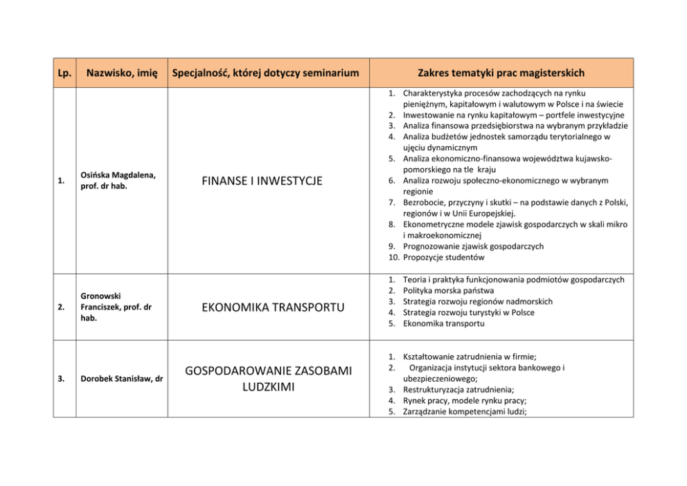 Lp. 1. 2. 3. Nazwisko, imię Osińska Magdalena, prof. dr hab. Gronowski Franciszek, prof. dr hab. Dorobek Stanisław, dr Specjalność, której dotyczy seminarium FINANSE I INWESTYCJE EKONOMIKA TRANSPORTU GOSPODAROWANIE ZASOBAMI LUDZKIMI Zakres tematyki prac magisterskich 1. Charakterystyka procesów zachodzących na rynku pieniężnym, kapitałowym i walutowym w Polsce i na świecie 2. Inwestowanie na rynku kapitałowym – portfele inwestycyjne 3. Analiza finansowa przedsiębiorstwa na wybranym przykładzie 4. Analiza budżetów jednostek samorządu terytorialnego w ujęciu dynamicznym 5. Analiza ekonomiczno-finansowa województwa kujawskopomorskiego na tle kraju 6. Analiza rozwoju społeczno-ekonomicznego w wybranym regionie 7. Bezrobocie, przyczyny i skutki – na podstawie danych z Polski, regionów i w Unii Europejskiej. 8. Ekonometryczne modele zjawisk gospodarczych w skali mikro i makroekonomicznej 9. Prognozowanie zjawisk gospodarczych 10. Propozycje studentów 1. 2. 3. 4. 5. Teoria i praktyka funkcjonowania podmiotów gospodarczych Polityka morska państwa Strategia rozwoju regionów nadmorskich Strategia rozwoju turystyki w Polsce Ekonomika transportu 1. Kształtowanie zatrudnienia w firmie; 2. Organizacja instytucji sektora bankowego i ubezpieczeniowego; 3. Restrukturyzacja zatrudnienia; 4. Rynek pracy, modele rynku pracy; 5. Zarządzanie kompetencjami ludzi; 6. 7. 8. 9. 10. 11. 12. 13. 14. 15. 4. 5. Fladrowska Emilia, dr Geise Mirosław, dr FINANSE I INWESTYCJE GOSPODAROWANIE ZASOBAMI LUDZKIMI Motywowanie w procesie pracy; Systemy wynagrodzeń w firmie; Ocena pracy i pracownika; Organizacja działalności personalnej w firmie; Marketing personalny, wprowadzenie zasad marketingu do strategii firmy; Dostosowanie procesu zarządzania przedsiębiorstwem do standardów UE Techniki i narzędzia wykorzystywane w zarządzaniu projektami Zarządzanie informacją jako proces decyzyjny Zarządzanie strategiczne i operacyjne małym przedsiębiorstwem Generalne problemy zarządzania kadrami na przykładzie wybranej firmy. 1. Poziom zastosowania narzędzi rachunkowości zarządczej w przedsiębiorstwach województwa Kujawsko-Pomorskiego 2. Rachunek kosztów stosowany w przedsiębiorstwach województwa Kujawsko-Pomorskiego 3. Zastosowanie rachunkowości zarządczej w uczelniach publicznych województwa Kujawsko – Pomorskiego 4. Diagnoza i przygotowanie do wdrożenia 5. systemu rachunkowości zarządczej w przedsiębiorstwie transportowym X 1. Rynek pracy. Bezrobocie. Funkcjonowanie współczesnego rynku pracy w układzie krajowym, regionalnym oraz lokalnym, w tym zmiany popytu na pracę – czynniki koniunkturalne i technologiczne kształtujące popyt na pracę, zmiany w zasobach pracy – zmiany w podaży pracy: czynniki kwalifikacyjne, demograficzne kształtujące podaż pracy, mobilność zawodowa, kwalifikacyjna i przestrzenna. Bezrobocie transformacyjne i strukturalne w Polsce. Aktywna polityka rynku pracy. Pasywna polityka rynku pracy. Grupy problemowe na rynku pracy. Rynki pracy wtórne a pierwotne w praktyce gospodarczej. Teorie segmentacyjne rynku pracy. Heterogeniczność polskiego rynku pracy. Wpływ globalizacji na funkcjonowanie lokalnych i regionalnych rynków pracy. Rynki pracy w krajach postkomunistycznych. 2. Kapitał ludzki. Gospodarowanie kapitałem ludzkim. Sposoby pomiaru kapitału ludzkiego w przedsiębiorstwach. Systemy szkoleń pracowników a wartość kapitału ludzkiego w przedsiębiorstwie. Kapitał ludzki w firmie postindustrialnej – znaczenie i wykorzystanie w praktyce. Problem wyceny kapitału ludzkiego. Problem relacji: płaca - wydajność pracy – kapitał ludzki w przedsiębiorstwie ery globalizacyjnej. 3. Gospodarowanie na szczeblu lokalnym. Bariery rozwoju terytorialnego. Instrumenty rozwoju lokalnego i regionalnego. Uwarunkowania rozwoju lokalnego i regionalnego. Lokalne rynki pracy a rozwój terytorialny. Polityczne, ekonomiczne i społeczne czynniki rozwoju terytorialnego. Intensywne a ekstensywne czynniki rozwoju lokalnego i regionalnego. Lokalny system podatkowy a samodzielność finansowa gmin. Autonomia lokalna – samodzielność finansowa- rozwój terytorium. 6. Jankowska Maria, dr GOSPODARKA I ADMINISTRACJA PUBLICZNA 1. Rachunkowość finansowa, rachunkowość podatkowa 2. Sprawozdawczość finansowa, badanie sprawozdań finansowych 3. Rachunkowość zarządcza 4. Audyt wewnętrzny i kontrola finansowa 5. Analiza finansowa 6. Biznes plan 7. Prawo finansów publicznych (w tym prawo podatkowe) 8. Prawo administracyjne, postępowanie administracyjne 9. Prawo karne-skarbowe 1. 2. 7. Jeran Agnieszka, dr GOSPDOAROWANIE ZASOBAMI LUDZKIMI 3. 4. 1. 2. 3. 9. Kozłowski Jerzy, prof. dr 4. FINANSE I INWESTYCJE 5. 6. 7. 8. 9. Wymiar mikrostrukturalny patologii w miejscu pracy (wyzysk, alienacja, mobbing) – spojrzenie z punktu widzenia interesów pracownika i/lub przedsiębiorstwa Oceny podejmowanych w przedsiębiorstwie oddziaływań – szkoleń, wyjazdów integracyjnych, zmian systemów motywacyjnych, przekształceń strukturalnych itp. – ponownie z punktu widzenia interesów, subiektywnego wrażenia objętego nimi pracownika i/lub całej organizacji Niespójności wewnętrzne organizacji – pomiędzy strukturami formalną i nieformalną, pomiędzy sferą normatywną a rzeczywistością i ich skutki dla funkcjonowania całej organizacji i/lub jej części strukturalnych (działów, zespołów pracowniczych itp.) i/lub jednostek Oczekiwania i wymagania dotyczące pracowników zatrudnianych – procesy diagnozy zapotrzebowania na kadry, selekcji kandydatów oraz ich skutki – w tym, ocena efektywności wykorzystanych narzędzi i trafności decyzji Diagnozowanie sytuacji finansowej przedsiębiorstwa Zastosowanie narzędzi analizy finansowej w ocenie kondycji przedsiębiorstwa Wykorzystanie rachunku przepływów pieniężnych w ocenie płynności finansowej przedsiębiorstwa Ocena zarządzania należnościami i zobowiązaniami w przedsiębiorstwie
