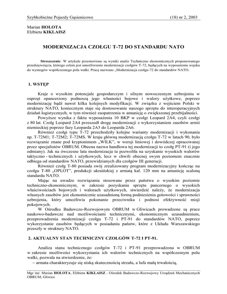 Szybkobieżne Pojazdy Gąsienicowe (18) nr 2, 2003 Marian HOLOTA Elżbieta KIKLAISZ MODERNIZACJA CZOŁGU T-72 DO STANDARDU NATO Streszczenie: W artykule przestawiono są wyniki analiz Techniczno ekonomicznych proponowanego przedsięwzięcia, którego celem jest umożliwienie modernizacji czołgów T-72, będących na wyposażeniu wojska do wymogów współczesnego pola walki. Pracę nazwano „Modernizacja czołgu-72 do standardów NATO. 1. WSTĘP Kraje o wysokim potencjale gospodarczym i silnym nowoczesnym uzbrojeniu w osprzęt opancerzony podnoszą jego własności bojowe i walory użytkowe, poprzez modernizację bądź nawet kilka kolejnych modyfikacji. W związku z wejściem Polski w struktury NATO, koniecznym staje się dostosowanie naszego sprzętu do interoperacyjnych działań logistycznych, w tym również zaopatrzenia w amunicję o zwiększonej przebijalności. Powyższe wynika z faktu wyposażenia 10 BKP w czołgi Leopard 2A4, czyli czołgi z 80 lat. Czołg Leopard 2A4 przeszedł drogę modernizacji z wykorzystaniem zasobów armii niemieckiej poprzez fazy Leoparda 2A5 do Leoparda 2A6. Również czołgi typu T-72 przechodziły kolejne warianty modernizacji i wykonania np. T-72M1; T-72M2; T-72MS. W kraju główną modernizacją czołgu T-72 w latach 90, było rozwiązanie znane pod kryptonimem „WILK”, w wersji liniowej i dowódczej opracowanej przez specjalistów OBRUM. Obecna nazwa handlowa tej modernizacji to czołg PT-91 (i jego odmiany). Jak na ówczesne lata modernizacja ta pozwoliła na uzyskanie wysokich walorów taktyczno - technicznych i użytkowych, lecz w chwili obecnej swym poziomem znacznie odbiega od standardów NATO, przewidzianych dla czołgów III generacji. Również czołg T-80 posiada swój zrealizowany program modernizacyjny kończąc na czołgu T-80 „OPLOT”, produkcji ukraińskiej z armatą kal. 120 mm na amunicję scaloną standardu NATO. Mając na uwadze rozwiązania stosowane przez państwa o wysokim poziomie techniczno-ekonomicznym, w zakresie pozyskania sprzętu pancernego o wysokich właściwościach bojowych i walorach użytkowych, stwierdzić należy, że modernizacja własnych zasobów jest ekonomicznie uzasadnioną formą podniesienia gotowości i sprawności uzbrojenia, który umożliwia pokonanie przeciwnika i podnosi efektywność misji pokojowych. W Ośrodku Badawczo-Rozwojowym OBRUM w Gliwicach prowadzone są prace naukowo-badawcze nad możliwościami technicznymi, ekonomicznym uzasadnieniem, przeprowadzenia modernizacji czołgu T-72 i PT-91 do standardów NATO, poprzez wykorzystanie zasobów będących w posiadaniu państw, które z Układu Warszawskiego przeszły w struktury NATO. 2. AKTUALNY STAN TECHNICZNY CZOŁGÓW T-72 I PT-91. Analiza stanu technicznego czołgów T-72 i PT-91 przeprowadzona w OBRUM w zakresie możliwości wykorzystania ich walorów technicznych na współczesnym polu walki, pozwala na stwierdzenie, że: armata charakteryzuje się niską skutecznością strzału, a lufa małą trwałością, Mgr inż. Marian HOLOTA, Elżbieta KIKLAISZ - Ośrodek Badawczo-Rozwojowy Urządzeń Mechanicznych OBRUM, Gliwice Marian HOLOTA, Elżbieta KIKLAISZ amunicja zapewnia przebicie pancerza o grubości ~ 450 mm, podczas gdy natowska posiada zdolność przebijania RHA (amunicja podkalibrowa DM53) powyżej 600 mm, zdolności obserwacji pola walki w nocy przez dowódcę czołgu są nieznaczne, a dowódca nie ma możliwości prowadzenia obserwacji celu w nocy na większych odległościach i dokładnego przekazania działonowemu informacji o celu, ani ostatecznie możliwości samodzielnego wykonania precyzyjnego strzału w przypadku nagłej konieczności, system kierowania ogniem, optoelektronika, stabilizacja uzbrojenia głównego i jego napędy w elewacji i azymucie, nie pozwalają działonowemu na wykonanie strzału do celu w czasie ruchu z prędkością wymaganą, nawet do celu nieruchomego z dostatecznym prawdopodobieństwem zniszczenia celu, natomiast namierzanie celu ruchomego jest wręcz niemożliwe, czołg nie dysponuje nowoczesnymi, o szerokim zakresie, środkami lokalizacji i określenia zagrożenia, opancerzenie zasadnicze czołgu dostosowane jest do odporności amunicji z lat osiemdziesiątych, brak pełnego zintegrowanego systemu zarządzania polem walki, niepełna jest odporność instalacji elektrycznej czołgu na narażenia elektromagnetyczne, wymagana normą obronną NO-06-A200, brak powiązań logistycznych w zakresie zaopatrywania w amunicję z baz NATO, niespełnione są w całej rozciągłości wymagania C3J (docelowo C4J). − − − − − − Spośród tych parametrów, z punktu widzenia użytkownika, najbardziej istotnymi są: zasięg skutecznego ognia, duży spadek prędkości wylotowej pocisku na odległości skutecznego ognia, dwuczęściowa amunicja, brak szczelności elektromagnetycznej, w systemie DRAWA stabilizacja linii celowania w jednej płaszczyźnie, skuteczność amunicji - przebijalność pancerza RHA wynikająca z ograniczenia długości rdzenia w dzielonej amunicji a tym samym stosunku L/d. Dane pozwalają wysunąć oczywisty wniosek o przestarzałej konstrukcji technicznej czołgu T-72, w porównaniu do konstrukcji nowych (np. Leclerc) i zmodernizowanych współczesnych czołgów bojowych III generacji. 3. MODERNIZACJA CZOŁGU T-72 DO STANDARDÓW NATO – OCENA MOŻLIWOŚCI TECHNICZNYCH. 3.1 Podstawa realizacji tematu Ośrodek Badawczo Rozwojowy Urządzeń-Mechanicznych OBRUM w 2001 roku wygrał przetarg na opracowanie zadania naukowego pod nazwą „Modernizacja czołgu T-72 do standardów NATO – studium realizacji programu”. Wygranie przetargu było możliwe ze względu na znajomość programów i możliwości technicznych modernizacji czołgów T-72 pogłębianą dzięki realizowanym wcześniej tematom: Modernizacja czołgu T-72 do standardu NATO − kompleksowa modernizacja T-72 (umowa SB i RTW), 1991-93; − opracowanie i zatwierdzone ZTT oraz badania modeli zmodernizowanych T-72, 