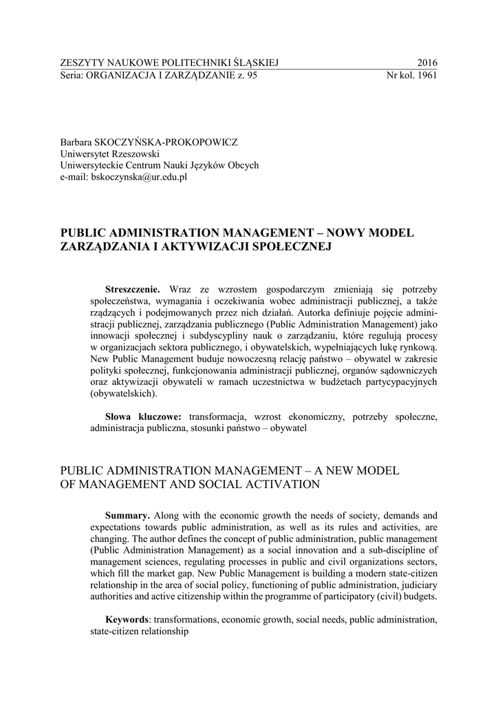 ZESZYTY NAUKOWE POLITECHNIKI ŚLĄSKIEJ Seria: ORGANIZACJA I ZARZĄDZANIE z. 95 2016 Nr kol. 1961 Barbara SKOCZYŃSKA-PROKOPOWICZ Uniwersytet Rzeszowski Uniwersyteckie Centrum Nauki Języków Obcych e-mail: [email protected] PUBLIC ADMINISTRATION MANAGEMENT – NOWY MODEL ZARZĄDZANIA I AKTYWIZACJI SPOŁECZNEJ Streszczenie. Wraz ze wzrostem gospodarczym zmieniają się potrzeby społeczeństwa, wymagania i oczekiwania wobec administracji publicznej, a także rządzących i podejmowanych przez nich działań. Autorka definiuje pojęcie administracji publicznej, zarządzania publicznego (Public Administration Management) jako innowacji społecznej i subdyscypliny nauk o zarządzaniu, które regulują procesy w organizacjach sektora publicznego, i obywatelskich, wypełniających lukę rynkową. New Public Management buduje nowoczesną relację państwo – obywatel w zakresie polityki społecznej, funkcjonowania administracji publicznej, organów sądowniczych oraz aktywizacji obywateli w ramach uczestnictwa w budżetach partycypacyjnych (obywatelskich). Słowa kluczowe: transformacja, wzrost ekonomiczny, potrzeby społeczne, administracja publiczna, stosunki państwo – obywatel PUBLIC ADMINISTRATION MANAGEMENT – A NEW MODEL OF MANAGEMENT AND SOCIAL ACTIVATION Summary. Along with the economic growth the needs of society, demands and expectations towards public administration, as well as its rules and activities, are changing. The author defines the concept of public administration, public management (Public Administration Management) as a social innovation and a sub-discipline of management sciences, regulating processes in public and civil organizations sectors, which fill the market gap. New Public Management is building a modern state-citizen relationship in the area of social policy, functioning of public administration, judiciary authorities and active citizenship within the programme of participatory (civil) budgets. Keywords: transformations, economic growth, social needs, public administration, state-citizen relationship 442 B. Skoczyńska-Prokopowicz 1. Wstęp Wzrost innowacyjności, postęp technologiczny, wyższy poziom wykształcenia w porównaniu do lat poprzednich, ciągłe zmiany na arenie międzynarodowej, urbanizacja, a także rozwój gospodarki wolnorynkowej, konkurencyjności i przedsiębiorczości sprzyjają ciągłemu rozwojowi społeczno-gospodarczemu państw. Wraz ze wzrostem gospodarczym wzrastają również potrzeby społeczeństwa, wymagania i oczekiwania wobec administracji publicznej, a także rządzących i podejmowanych przez nich działań. Społeczeństwa potrzebują innowacji, nowatorskich rozwiązań i metod dopasowanych do ich poziomu życia oraz oczekiwań związanych z instytucją, jaką jest państwo. Innowacyjność, która stała się „europejską kulturą” musi obejmować nie tylko państwo i organizacje państwowe, ale także przedsiębiorców, obywateli i administrację. 2. Public administration management Public Administration Management jako pojęcie wymaga przytoczenia znaczenia terminu administracja publiczna – kluczowego z punktu widzenia omawianego tematu. Administracja publiczna, według słownika zarządzania, jest to: przejęte przez państwo i realizowane przez jego zawisłe organy, a także przez organy samorządu terytorialnego zaspokajanie zbiorowych i indywidualnych potrzeb obywateli, wynikających ze współżycia ludzi w społecznościach. Stanowi całokształt struktur organizacyjnych w państwie oraz ludzi zatrudnionych w tych strukturach spełniających zadania publiczne, zbiorowe i indywidualne, reglamentacyjne i świadczące oraz organizatorskie podmiotów kierowniczych i decydenckich1. Niezależnie od przyjętego sposobu definiowania administracja publiczna jawi się jako zjawisko złożone i, co więcej, wszechobecne2. Przez administrację publiczną należy rozumieć zespolenie różnych administracji działających w zakresie spraw publicznych. Przede wszystkim można wyróżnić administrację państwową, administrację rządową i administrację samorządową. Administracja publiczna jest desygnatem na określenie struktur, działań i ludzi tych wszystkich rodzajów administracji. Nawiązując do doktryny podziału władzy i przyjmując różną perspektywę w stosunku do administracji publicznej, a zwłaszcza do jej funkcji, w nauce administracji publicznej można wyróżnić trzy ujęcia: Penc J.: Encyklopedia zarządzania: podstawowe kategorie i terminy. Wyższa Szkoła Studiów Międzynarodowych, Łódź 2008, s. 238. 2 Błaś A., Boć J., Jeżewski J.: Administracja publiczna. Boć J. (red.). Kolonia Limited, Wrocław 2003, s. 127. 1 Public administration management… polityczne, prawnicze, 443 menedżerskie. Ujęcie polityczne kładzie nacisk na publiczny charakter administracji publicznej, eksponując polityczną odpowiedzialność przed parlamentem oraz społeczeństwem. W ujęciu prawniczym zwraca się uwagę na to, że całość administracji jest działalnością, które znajduje swoje umocowanie w prawie, a ponadto podlega rządom prawa. Ujęcie menadżerskie uwydatnia podobieństwa i konieczność upodabniania administracji do sektora prywatnego3. Administrację publiczną wyróżnia się przede wszystkim w ujęciu organizacyjnym – podmiotowym; stanowi ona ogół podmiotów administracji, a więc organy administracji i inne podmioty, wykonujące określone funkcje z zakresu administracji publicznej. Wyróżniamy również administrację publiczną w ujęciu materialnym, inaczej przedmiotowym, jako działalność państwa; jej przedmiotem są sprawy administracyjne albo inaczej zadania i kompetencje w zakresie władzy wykonawczej. Administracja publiczna w ujęciu formalnym jest to cała działalność wykonywana przez podmioty administracyjne bez względu na to, czy ma ona charakter administracyjny czy też nie ma tego charakteru4. Pojęcie „Public Administration Management” można tłumacz