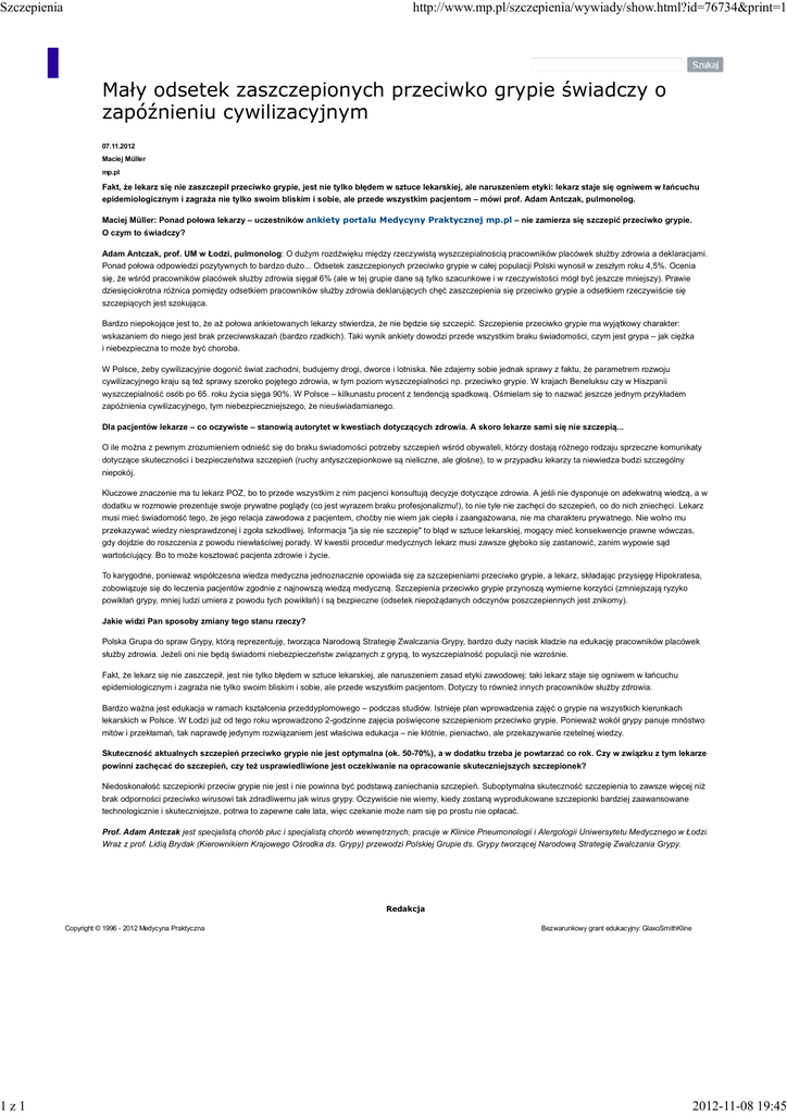 Szczepienia 1z1 http://www.mp.pl/szczepienia/wywiady/show.html?id=76734&print=1 Mały odsetek zaszczepionych przeciwko grypie świadczy o zapóźnieniu cywilizacyjnym 07.11.2012 Maciej Müller mp.pl Fakt, że lekarz się nie zaszczepił przeciwko grypie, jest nie tylko błędem w sztuce lekarskiej, ale naruszeniem etyki: lekarz staje się ogniwem w łańcuchu epidemiologicznym i zagraża nie tylko swoim bliskim i sobie, ale przede wszystkim pacjentom – mówi prof. Adam Antczak, pulmonolog. Maciej Müller: Ponad połowa lekarzy – uczestników ankiety portalu Medycyny Praktycznej mp.pl – nie zamierza się szczepić przeciwko grypie. O czym to świadczy? Adam Antczak, prof. UM w Łodzi, pulmonolog: O dużym rozdźwięku między rzeczywistą wyszczepialnością pracowników placówek służby zdrowia a deklaracjami. Ponad połowa odpowiedzi pozytywnych to bardzo dużo... Odsetek zaszczepionych przeciwko grypie w całej populacji Polski wynosił w zeszłym roku 4,5%. Ocenia się, że wśród pracowników placówek służby zdrowia sięgał 6% (ale w tej grupie dane są tylko szacunkowe i w rzeczywistości mógł być jeszcze mniejszy). Prawie dziesięciokrotna różnica pomiędzy odsetkiem pracowników służby zdrowia deklarujących chęć zaszczepienia się przeciwko grypie a odsetkiem rzeczywiście się szczepiących jest szokująca. Bardzo niepokojące jest to, że aż połowa ankietowanych lekarzy stwierdza, że nie będzie się szczepić. Szczepienie przeciwko grypie ma wyjątkowy charakter: wskazaniem do niego jest brak przeciwwskazań (bardzo rzadkich). Taki wynik ankiety dowodzi przede wszystkim braku świadomości, czym jest grypa – jak ciężka i niebezpieczna to może być choroba. W Polsce, żeby cywilizacyjnie dogonić świat zachodni, budujemy drogi, dworce i lotniska. Nie zdajemy sobie jednak sprawy z faktu, że parametrem rozwoju cywilizacyjnego kraju są też sprawy szeroko pojętego zdrowia, w tym poziom wyszczepialności np. przeciwko grypie. W krajach Beneluksu czy w Hiszpanii wyszczepialność osób po 65. roku życia sięga 90%. W Polsce – kilkunastu procent z tendencją spadkową. Ośmielam się to nazwać jeszcze jednym przykładem zapóźnienia cywilizacyjnego, tym niebezpieczniejszego, że nieuświadamianego. Dla pacjentów lekarze – co oczywiste – stanowią autorytet w kwestiach dotyczących zdrowia. A skoro lekarze sami się nie szczepią... O ile można z pewnym zrozumieniem odnieść się do braku świadomości potrzeby szczepień wśród obywateli, którzy dostają różnego rodzaju sprzeczne komunikaty dotyczące skuteczności i bezpieczeństwa szczepień (ruchy antyszczepionkowe są nieliczne, ale głośne), to w przypadku lekarzy ta niewiedza budzi szczególny niepokój. Kluczowe znaczenie ma tu lekarz POZ, bo to przede wszystkim z nim pacjenci konsultują decyzje dotyczące zdrowia. A jeśli nie dysponuje on adekwatną wiedzą, a w dodatku w rozmowie prezentuje swoje prywatne poglądy (co jest wyrazem braku profesjonalizmu!), to nie tyle nie zachęci do szczepień, co do nich zniechęci. Lekarz musi mieć świadomość tego, że jego relacja zawodowa z pacjentem, choćby nie wiem jak ciepła i zaangażowana, nie ma charakteru prywatnego. Nie wolno mu przekazywać wiedzy niesprawdzonej i zgoła szkodliwej. Informacja "ja się nie szczepię" to błąd w sztuce lekarskiej, mogący mieć konsekwencje prawne wówczas, gdy dojdzie do roszczenia z powodu niewłaściwej porady. W kwestii procedur medycznych lekarz musi zawsze głęboko się zastanowić, zanim wypowie sąd wartościujący. Bo to może kosztować pacjenta zdrowie i życie. To karygodne, ponieważ współczesna wiedza medyczna jednoznacznie opowiada się za szczepieniami przeciwko grypie, a lekarz, składając przysięgę Hipokratesa, zobowiązuje się do leczenia pacjentów zgodnie z najnowszą wiedzą medyczną. Szczepienia przeciwko grypie przynoszą wymierne korzyści (zmniejszają ryzyko powikłań grypy, mniej ludzi umiera z powodu tych powikłań) i są bezpieczne (odsetek niepożądanych odczynów poszczepiennych jest znikomy). Jakie widzi Pan sposoby zmiany tego stanu rzeczy? Polska Grupa do spraw Grypy, którą reprezentuję, tworząca Narodową Strategię Zwalczania Grypy, bardzo duży nacisk kładzie na edukację pracowników placówek służby zdrowia. Jeżeli oni nie będą świadomi niebezpieczeństw związanych z grypą, to wyszczepialność populacji nie wzrośnie. Fakt, że lekarz się nie zaszczepił, jest nie tylko błędem w sztuce lekarskiej, ale naruszeniem zasad etyki zawodowej: taki lekarz staje się ogniwem w łańcuchu epidemiologicznym i zagraża nie tylko swoim bliskim i sobie, ale przede wszystkim pacjentom. Dotyczy to również innych pracowników służby zdrowia. Bardzo ważna jest edukacja w ramach kształcenia przeddyplomowego – podczas studiów. Istnieje plan wprowadzenia zajęć o grypie na wszystkich kierunkach lekarskich w Polsce. W Łodzi już od tego roku wprowadzono 2-godzinne zajęcia poświęcone szczepieniom przeciwko grypie. Ponieważ wokół grypy panuje mnóstwo mitów i przekłamań, tak naprawdę jedynym rozwiązaniem jest właściwa edukacja – nie kłótnie, pieniactwo, ale przekazywanie rzetelnej wiedzy. Skuteczność aktualnych szczepień przeciwko grypie nie jest optymalna (ok. 50-70%), a w dodatku trzeba je powtarzać co rok. Czy w związku z tym lekarze powinni zachęcać do szczepień, czy też usprawiedliwione jest oczekiwanie na opracowanie skuteczniejszych szczepionek? Niedoskonałość szczepionki przeciw grypie nie jest i nie powinna być podstawą zaniechania szczepień. Suboptymalna skuteczność szczepienia to zawsze więcej niż brak odporności przeciwko wirusowi tak zdradliwemu jak wirus grypy. Oczywiście nie wiemy, kiedy zostaną wyprodukowane szczepionki bardziej zaawansowane technologicznie i skuteczniejsze, potrwa to zapewne całe lata, więc czekanie może nam się po prostu nie opłacać. Prof. Adam Antczak je