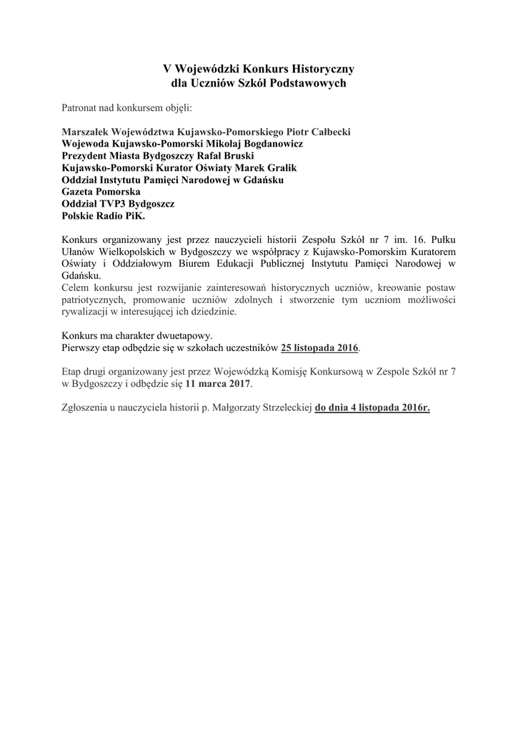 V Wojewódzki Konkurs Historyczny dla Uczniów Szkół Podstawowych Patronat nad konkursem objęli: Marszałek Województwa Kujawsko-Pomorskiego Piotr Całbecki Wojewoda Kujawsko-Pomorski Mikołaj Bogdanowicz Prezydent Miasta Bydgoszczy Rafał Bruski Kujawsko-Pomorski Kurator Oświaty Marek Gralik Oddział Instytutu Pamięci Narodowej w Gdańsku Gazeta Pomorska Oddział TVP3 Bydgoszcz Polskie Radio PiK. Konkurs organizowany jest przez nauczycieli historii Zespołu Szkół nr 7 im. 16. Pułku Ułanów Wielkopolskich w Bydgoszczy we współpracy z Kujawsko-Pomorskim Kuratorem Oświaty i Oddziałowym Biurem Edukacji Publicznej Instytutu Pamięci Narodowej w Gdańsku. Celem konkursu jest rozwijanie zainteresowań historycznych uczniów, kreowanie postaw patriotycznych, promowanie uczniów zdolnych i stworzenie tym uczniom możliwości rywalizacji w interesującej ich dziedzinie. Konkurs ma charakter dwuetapowy. Pierwszy etap odbędzie się w szkołach uczestników 25 listopada 2016. Etap drugi organizowany jest przez Wojewódzką Komisję Konkursową w Zespole Szkół nr 7 w Bydgoszczy i odbędzie się 11 marca 2017. Zgłoszenia u nauczyciela historii p. Małgorzaty Strzeleckiej do dnia 4 listopada 2016r.