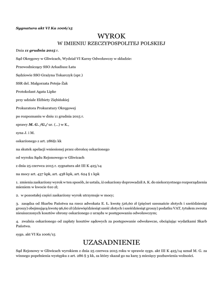 Sygnatura akt VI Ka 1006/15 WYROK W IMIENIU RZECZYPOSPOLITEJ POLSKIEJ Dnia 11 grudnia 2015 r. Sąd Okręgowy w Gliwicach, Wydział VI Karny Odwoławczy w składzie: Przewodniczący SSO Arkadiusz Łata Sędziowie SSO Grażyna Tokarczyk (spr.) SSR del. Małgorzata Peteja-Żak Protokolant Agata Lipke przy udziale Elżbiety Ziębińskiej Prokuratora Prokuratury Okręgowej po rozpoznaniu w dniu 11 grudnia 2015 r. sprawy M. G. /G./ ur. (...) w K., syna J. i M. oskarżonego z art. 286§1 kk na skutek apelacji wniesionej przez obrońcę oskarżonego od wyroku Sądu Rejonowego w Gliwicach z dnia 25 czerwca 2015 r. sygnatura akt III K 425/14 na mocy art. 437 kpk, art. 438 kpk, art. 624 § 1 kpk 1. zmienia zaskarżony wyrok w ten sposób, że ustala, iż oskarżony doprowadził A. K. do niekorzystnego rozporządzenia mieniem w kwocie 610 zł; 2. w pozostałej części zaskarżony wyrok utrzymuje w mocy; 3. zasądza od Skarbu Państwa na rzecz adwokata E. Ł. kwotę 516,60 zł (pięćset szesnaście złotych i sześćdziesiąt groszy) obejmującą kwotę 96,60 zł (dziewięćdziesiąt sześć złotych i sześćdziesiąt groszy) podatku VAT, tytułem zwrotu nieuiszczonych kosztów obrony oskarżonego z urzędu w postępowaniu odwoławczym; 4. zwalnia oskarżonego od zapłaty kosztów sądowych za postępowanie odwoławcze, obciążając wydatkami Skarb Państwa. sygn. akt VI Ka 1006/15 UZASADNIENIE Sąd Rejonowy w Gliwicach wyrokiem z dnia 25 czerwca 2015 roku w sprawie sygn. akt III K 425/14 uznał M. G. za winnego popełnienia występku z art. 286 § 3 kk, za który skazał go na karę 3 miesięcy pozbawienia wolności. Obrońca oskarżonego zaskarżając wyrok w całości zarzuciła obrazę prawa materialnego a to art. 286 § 1 kk, błędy w ustaleniach faktycznych poprzez przyjęcie, że oskarżony celowo przestał odbierać telefon od pokrzywdzonego i nie kontaktował się z nim, gdy wynikało to z pozbawienia wolności, oraz że nie zamierzał dokonać naprawy laptopa. Obrońca wniosła o zmianę wyroku i uniewinnienie oskarżonego, ewentualnie o uchylenie zaskarżonego wyroku i przekazanie sprawy Sądowi I instancji do ponownego rozpoznania. Sąd Okręgowy zważył, co następuje. Apelacja obrońcy oskarżonego nie zasługuje na uwzględnienie, a kontrola odwoławcza przeprowadzonego przez Sąd I instancji postępowania dowodowego, zaskarżonego orzeczenia, jego uzasadnienia oraz analiza uzasadnienia środka odwoławczego, skutkują koniecznością uznania jej za bezzasadną, jakkolwiek w wyniku jej wywiedzenia konieczna była korekta opisu czynu przypisanego oskarżonemu, tak by odpowiadało to poczynionym przez Sąd meriti ustaleniom. Po pierwsze podkreślić należy, iż zarzut błędu w ustaleniach faktycznych, przyjętych za podstawę wyroku, jest tylko wówczas słuszny, gdy zasadność ocen i wniosków, wyprowadzonych przez sąd orzekający z okoliczności ujawnionych w toku przewodu sądowego, nie odpowiada prawidłowości logicznego rozumowania. Zarzut ten nie może jednak sprowadzać się do samej polemiki z ustaleniami sądu, wyrażonymi w uzasadnieniu wyroku, lecz do wykazania, jakich mianowicie konkretnych uchybień w zakresie logicznego rozumowania dopuścił się sąd w ocenie zebranego materiału dowodowego. Możliwość zaś przeciwstawienia ustaleniom sądu orzekającego odmiennego poglądu nie może prowadzić do wniosku o dokonanie przez sąd błędu w ustaleniach faktycznych ( wyrok Sądu Najwyższego z dnia 10.05.2005 roku sygn. WA 12/05 OSNwSK 2005/1/949, wyrok Sądu Apelacyjnego w Katowicach w dnia 5.04.2007 roku w sprawie II AKa 30/07, Prok.i Pr. 2007/11/32). Z kolei przekonanie sądu o wiarygodności lub niewiarygodności określonych dowodów pozostaje pod ochroną zasady wyrażonej w art. 7 k.p.k. wtedy tylko, kiedy spełnione są warunki: ujawnienia całokształtu okoliczności sprawy (art. 410 k.p.k.) w granicach respektujących zasadę prawdy obiektywnej (art. 2 § 2 k.p.k.), rozważenia wszystkich okoliczności zgodnie z zasadą określoną w art. 4 k.p.k. oraz wyczerpującego i logicznego - z uwzględnieniem wskazań wiedzy i doświadczenia życiowego - uzasadnienia przekonania sądu (art. 424 § 1 pkt 1 k.p.k.) (postanowienie Sądu Najwyższego z dnia 14.12.2006 roku w sprawie III KK 415/06 OSNwSK 2006/1/2452 ). Obraza prawa materialnego polega na wadliwym jego zastosowaniu (lub niezastosowaniu) w orzeczeniu opartym na trafnych i niekwestionowanych ustaleniach faktycznych. Nie można, zatem stawiać zarzutu naruszenia prawa materialnego w sytuacji, gdy wadliwość orzeczenia ma polegać na błędnych ustaleniach faktycznych przyjętych za podstawę orzeczenia lub na naruszeniu przepisów procesowych (wyrok SN z dnia 2007.11.28, sygn. II KK 172/07, LEX nr 351223). Naruszenia powołanych wyżej zasad nie sposób dopatrzeć się analizując przebieg postępowania, zapadły wyrok oraz pisemne motywy zaskarżonego orzeczenia. Sąd I instancji przeprowadził wyczerpujące postępowanie, dalej dokonując wszechstronnej oceny zebranych dowodów, nie uchybiając zasadom wiedzy, logicznego rozumowania, ani doświadczenia życiowego, rzetelnie i szczegółowo ocenę tę przedstawiając w pisemnych motywach zaskarżonego orzeczenia. O prawidłowości ustaleń Sądu orzekającego w zakresie ustalenia sprawstwa i winy oskarżonego, a zatem oceny, że w sytuacji zaistniałej pomiędzy oskarżonym a pokrzywdzonym A. K. doszło nie do odpowiedzialności kontraktowej, ale że oskarżony popełnił przestępstwo, przekonuje w pierwszym rzędzie chronologia poszczególnych działań i zaistniałych okoliczności, treść korespondencji mailowej, a wreszcie stan przesyłki, którą otrzymał pokrzywdzony. Po przesłaniu laptopa przez pokrzywdzonego oskarżonemu i zaakceptowaniu kosztu naprawy na 350 złotych, w dniu 29 maja 2013 r. pokrzywdzony skontaktował się z oskarżonym, który zapewnił go o dokonaniu naprawy do poniedziałku, a zatem 3 czerwca 2013 r. (w ciągu pięciu dn