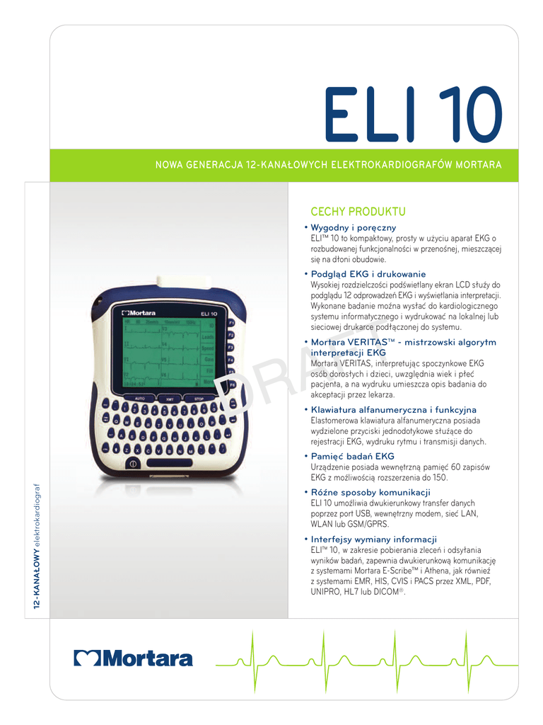 ELI 10 NOWA GENERACJA 12-KANAŁOWYCH ELEKTROKARDIOGRAFÓW MORTARA CECHY PRODUKTU • Wygodny i pore˛czny ELI™ 10 to kompaktowy, prosty w uz· yciu aparat EKG o rozbudowanej funkcjonalności w przenośnej, mieszcza˛cej sie˛ na dłoni obudowie. • Podgla˛d EKG i drukowanie Wysokiej rozdzielczości podświetlany ekran LCD słuźy do podgla˛du 12 odprowadzeń EKG i wyświetlania interpretacji. Wykonane badanie moźna wysłać do kardiologicznego systemu informatycznego i wydrukować na lokalnej lub sieciowej drukarce podła˛czonej do systemu. T F A DR • Mortara VERITAS™ - mistrzowski algorytm interpretacji EKG Mortara VERITAS, interpretuja˛c spoczynkowe EKG osób dorosłych i dzieci, uwzgle˛dnia wiek i płeć pacjenta, a na wydruku umieszcza opis badania do akceptacji przez lekarza. • Klawiatura alfanumeryczna i funkcyjna Elastomerowa klawiatura alfanumeryczna posiada wydzielone przyciski jednodotykowe słuźa˛ce do rejestracji EKG, wydruku rytmu i transmisji danych. 12-KANAŁOWY elektrokardiograf • Pamie˛ć badań EKG Urza˛dzenie posiada wewne˛trzna˛ pamie˛ć 60 zapisów EKG z moźliwościa˛ rozszerzenia do 150. • Róźne sposoby komunikacji ELI 10 umoźliwia dwukierunkowy transfer danych poprzez port USB, wewne˛trzny modem, sieć LAN, WLAN lub GSM/GPRS. • Interfejsy wymiany informacji ELI™ 10, w zakresie pobierania zleceń i odsyłania wyników badań, zapewnia dwukierunkowa˛ komunikacje˛ z systemami Mortara E-Scribe™ i Athena, jak równieź z systemami EMR, HIS, CVIS i PACS przez XML, PDF, UNIPRO, HL7 lub DICOM®. ELEKTROKARDIOGRAF ELI ™ 10 MORTARA INSTRUMENT, INC. MORTARA RANGONI EUROPE, SRL CECHY SPECYFIK ACJA* RODZAJ URZA˛DZENIA 12-kanałowy elektrokardiograf KANAŁY WEJŚCIOWE Równoczesna rejestracja wszystkich 12 kanałów STANDARD ODPROWADZEŃ I, II, III, aVR, aVL, aVF, V1, V2, V3, V4, V5, V6 WYŚWIETLACZ Podświetlany kolorowy LCD 1/4 VGA (320 x 240); prezentacja grup po 3, 8 lub 12 kanałów jednocześnie Spełnia lub przewyz·sza wymagania normy ANSI/AAMI EC11 IMPEDANCJA WEJŚCIOWA DYNAMIKA WEJŚCIOWA NAPIE˛CIE NIEZRÓWNOWAZ·ENIA CMRR PRA˛D UPŁYWU PACJENTA PRA˛D UPŁYWU OBUDOWY Spełnia lub przewyz·sza wymagania normy ANSI/AAMI ES1 CZE˛STOTLIWOŚĆ PRÓBKOWANIA 10 000 próbek/s/kanał stosowana do detekcji pików stymulatora; 1000 próbek/s/kanał stosowana do rejestracji i analizy DRUKARKA USB Wymagana drukarka 300 dpi PCL3. Jednak nie wszystkie drukarki o tych parametrach sa˛ kompatybilne PRE˛DKOŚĆ PRZESUWU 25 mm/s CZUŁOŚĆ 5, 10 lub 20 mm/mV FORMAT WYDRUKU AUTO Standard lub Cabrera: 3+1, 3+3, 6, 6+6 lub 12 kanałów FUNKCJE SPECJALNE Mortara VERITAS – algorytm interpretacji EKG uwzgle˛dniaja˛cy wiek oraz płeć pacjenta; wybór interfejsu dwukierunkowej komunikacji; synchronizacja czsu; wybór ankiety danych demograficznych KLAWIATURA Elastomerowa klawiatura alfanumeryczna, zmienne menu ekranowe i dedykowane klawisze funkcyjne PASMO PRZENOSZENIA 0,05 do 300 Hz FILTRY Filtr linii izoelektrycznej, filtr sieciowy 50/60 Hz, filtry dolnoprzepustowe 40 Hz, 150 Hz i 300 Hz PRZETWARZANIE A/C 20 bitów (1,17 µV LSB) KLASA URZA˛DZENIA Klasa I, Typ CF, urza˛dzenie odporne na defibrylacje˛ PAMIE˛Ć EKG Wewne˛trzna pamie˛ć do 60 zapisów EKG z moźliwościa˛ rozszerzenia do 150 WAGA 540 g z bateria˛ WYMIARY 172 x 135 x 38 mm (bez stacji dokuja˛cej) ZASILANIE 100-240 VAC / 50/60 Hz; akumulator wewne˛trzny bezobsługowy MORTARA INSTRUMENT AUSTRALIA www.mortara.com T F A R D ISO 13485 CERTIFIED GWARANCJA + SERWIS *Specyfikacja moz·e ulec zmianie bez uprzedzenia. ELI™, E-Scribe™, i VERITAS™ sa˛ znakami towarowymi Mortara Instrument, Inc. DICOM® jest znakiem towarowym zarejestrowanym przez National Electrical Manufacturers Association odnosza˛cym sie˛ do stosowanego w medycynie standardu komunikacji cyfrowej. ENG 6 DYSTRYBUCJA I SERWIS W POLSCE: Ref: 9513-170-01-POL Rev 2