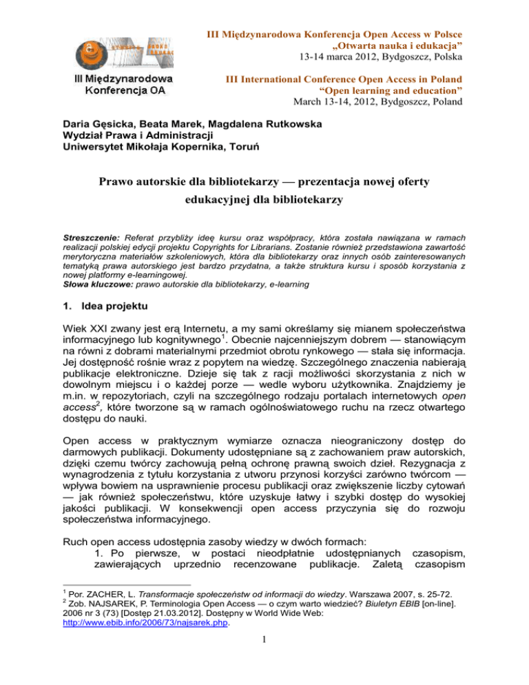 III Międzynarodowa Konferencja Open Access w Polsce „Otwarta nauka i edukacja” 13-14 marca 2012, Bydgoszcz, Polska III International Conference Open Access in Poland “Open learning and education” March 13-14, 2012, Bydgoszcz, Poland Daria Gęsicka, Beata Marek, Magdalena Rutkowska Wydział Prawa i Administracji Uniwersytet Mikołaja Kopernika, Toruń Prawo autorskie dla bibliotekarzy — prezentacja nowej oferty edukacyjnej dla bibliotekarzy Streszczenie: Referat przybliży ideę kursu oraz współpracy, która została nawiązana w ramach realizacji polskiej edycji projektu Copyrights for Librarians. Zostanie również przedstawiona zawartość merytoryczna materiałów szkoleniowych, która dla bibliotekarzy oraz innych osób zainteresowanych tematyką prawa autorskiego jest bardzo przydatna, a także struktura kursu i sposób korzystania z nowej platformy e-learningowej. Słowa kluczowe: prawo autorskie dla bibliotekarzy, e-learning 1. Idea projektu Wiek XXI zwany jest erą Internetu, a my sami określamy się mianem społeczeństwa informacyjnego lub kognitywnego1. Obecnie najcenniejszym dobrem — stanowiącym na równi z dobrami materialnymi przedmiot obrotu rynkowego — stała się informacja. Jej dostępność rośnie wraz z popytem na wiedzę. Szczególnego znaczenia nabierają publikacje elektroniczne. Dzieje się tak z racji możliwości skorzystania z nich w dowolnym miejscu i o każdej porze — wedle wyboru użytkownika. Znajdziemy je m.in. w repozytoriach, czyli na szczególnego rodzaju portalach internetowych open access2, które tworzone są w ramach ogólnoświatowego ruchu na rzecz otwartego dostępu do nauki. Open access w praktycznym wymiarze oznacza nieograniczony dostęp do darmowych publikacji. Dokumenty udostępniane są z zachowaniem praw autorskich, dzięki czemu twórcy zachowują pełną ochronę prawną swoich dzieł. Rezygnacja z wynagrodzenia z tytułu korzystania z utworu przynosi korzyści zarówno twórcom — wpływa bowiem na usprawnienie procesu publikacji oraz zwiększenie liczby cytowań — jak również społeczeństwu, które uzyskuje łatwy i szybki dostęp do wysokiej jakości publikacji. W konsekwencji open access przyczynia się do rozwoju społeczeństwa informacyjnego. Ruch open access udostępnia zasoby wiedzy w dwóch formach: 1. Po pierwsze, w postaci nieodpłatnie udostępnianych czasopism, zawierających uprzednio recenzowane publikacje. Zaletą czasopism 1 Por. ZACHER, L. Transformacje społeczeństw od informacji do wiedzy. Warszawa 2007, s. 25-72. Zob. NAJSAREK, P. Terminologia Open Access — o czym warto wiedzieć? Biuletyn EBIB [on-line]. 2006 nr 3 (73) [Dostęp 21.03.2012]. Dostępny w World Wide Web: http://www.ebib.info/2006/73/najsarek.php. 2 1 III Międzynarodowa Konferencja Open Access w Polsce „Otwarta nauka i edukacja” 13-14 marca 2012, Bydgoszcz, Polska III International Conference Open Access in Poland “Open learning and education” March 13-14, 2012, Bydgoszcz, Poland wydawanych w formie elektronicznej i na zasadach open access jest znaczna redukcja kosztów publikacji, które ograniczają się do nakładów poniesionych w związku z procesem recenzowania oraz udostępnieniem miejsca na serwerze. Tego typu wydawnictwa powstają często przy współpracy z uniwersytetami lub fundacjami. 2. Po drugie, w postaci repozytoriów prac naukowych, które nie podlegają ocenie merytorycznej ani procedurze recenzowania. Nie są udostępniane periodycznie, nie zostały również pogrupowane tematycznie3. Przykładem wykorzystania możliwości oferowanych przez open access w działalności bibliotekarzy jest projekt pt. Prawo autorskie dla Bibliotekarzy — otwarty program nauczania z zakresu prawa autorskiego. Stanowi on tłumaczenie projektu Copyright for Librarians przygotowanego przez Centrum Badań Cyberprzestrzeni Uniwersytetu Harvarda (Berkman Center for Internet & Society4). Projekt został zainicjowany przez eIFL (Elektroniczną Informację dla Bibliotek), działającą od 1999 r. międzynarodową organizację zrzeszającą biblioteki z 60 rozwijających się krajów położonych na czterech kontynentach: w Europie, Azji, Ameryce Łacińskiej oraz Afryce. Hasłem przewodnim organizacji jest „wiedza bez barier” (ang. knowledge without boundaries), a misją — udostępnianie wiedzy przez biblioteki z krajów rozwijających się w celu usprawnienia procesów rozwoju gospodarczego i społecznego5. W 2011 i 2012 r. opracowania polskiej edycji kursu podjęli się studenci Wydziału Prawa i Administracji Uniwersytetu Mikołaja Kopernika w Toruniu oraz Wydziału Prawa Uniwersytetu w Białymstoku. Korzystając z szablonu ustalonego przez członków Centrum Berkmana, stworzyli platformę e-learningową, która przybliża bibliotekarzom często niełatwe zagadnienia z dziedziny prawa autorskiego. Opiekunem merytorycznym projektu była dr Monika Wałachowska (WPiA UMK w Toruniu). Pracę koordynowała Beata Marek (prezes Studenckiego Koła Naukowego Prawa Nowych Technologii), a doradcami merytorycznymi były mgr Daria Gęsicka (doktorantka z WPiA UMK w Toruniu) oraz mgr Magdalena Rutkowska (doktorantka z WP UWB). Redaktorem merytorycznym była Bożena Bednarek-Michalska z Biblioteki Uniwersyteckiej w Toruniu a redaktorem technicznym — doktorant Dominik Mirosław Piotrowski również z Biblioteki Uniwersyteckiej w Toruniu. 2. Zawartość kursu / Wartości merytoryczne Kurs składa się z dziewięciu modułów. Poszczególne rozdziały zostały przetłumaczone z języka angielskiego. Ich treść poszerzono o informacje z zakresu polskiego prawa autorskiego. Wprowadzono także materiały dodatkowe: filmy, 3 SUBER, P. A very brief introduction to open access [on-line]. [Dostęp 21.03.2012]. Dostępny w World Wide Web: http://www.earlham.edu/~peters/fos/brief.htm. 4 Wszystkie odesłania do stron internetowych przedstawiają wersję aktualną w dn. 21.03.2012 r. 5 Zob. też: Who we are? [on-line]. [Dostęp 21.03.2012