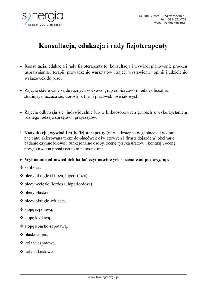 44-100 Gliwice, ul.Skowrończa 55 tel.: 698-851-751 www: treningmozgu.pl Konsultacja, edukacja i rady fizjoterapeuty Konsultacja, edukacja i rady fizjoterapeuty to: konsultacja i wywiad, planowanie procesu usprawniania i terapii, prowadzenie warsztatów i zajęć, wystawienie opinii i udzielenie wskazówek do pracy. Zajęcia skierowane są do różnych wiekowo grup odbiorców (młodzież licealna, studiująca, ucząca się, dorośli) z firm i placówek oświatowych. Zajęcia odbywają się indywidualnie lub w kilkuosobowych grupach z wykorzystaniem różnego rodzaju sprzętów i przyrządów. 1. Konsultacja, wywiad i rady fizjoterapeuty (oferta dostępna w gabinecie i w domu pacjenta; skierowana także do placówek oświatowych i firm z dojazdem) obejmuje badanie czynnościowe i funkcjonalne osoby, ocenę ryzyka urazów i kontuzji, ocenę przygotowania przed sezonem narciarskim: Wykonanie odpowiednich badań czynnościowych - ocena wad postawy, np: skolioza, plecy okrągłe (kifoza, hiperkifoza), plecy wklęsłe (lordoza, hiperlordoza), plecy płaskie, plecy okrągło-wklęsłe, stopę szpotawą, stopę koślawą, stopę końsko-szpotawą, płaskostopie, kolana szpotawe, kolana koślawe. www.treningmozgu.pl 44-100 Gliwice, ul.Skowrończa 55 tel.: 698-851-751 www: treningmozgu.pl Badanie stanu funkcjonalnego pleców, m.in.: zespoły przeciążeniowe, zespoły korzeniowe, Ocena ruchomości poszczególnych stawów i mięśni, Ocena ryzyka urazów/kontuzji, Badanie stanu funkcjonalnego przed wyjazdem na narty, w góry; przed rozpoczęciem uprawiania sportu i rekreacji, Planowanie procesu usprawniania i terapii: trening siłowy, wzmacniający mięśnie osłabione, poizometryczna relaksacja mięśni. 2. Kinezyterapia, terapia metodą SI, sensomotoryka (oferta dostępna w gabinecie). 3. Fizjoterapia domowa (oferta niedostępna w gabinecie; dotyczy prowadzenia terapii w domu pacjenta; skierowana także do placówek oświatowych i firm z dojazdem): masaż klasyczny, relaksacyjny, izometryczny; usprawnianie po udarach, urazach ortopedycznych, zabiegach kardiologicznych, kinezyterapia, rehabilitacja dziecięca, terapia metodą SI, sensomotoryka. 4. Warsztaty (oferta dostępna w gabinecie; skierowana także do placówek oświatowych i firm z dojazdem):: gimnastyka korekcyjna, zdrowe plecy, ergonomia pracy. 5. Opinia fizjoterapeuty + omówienie i wskazówki. Prowadzenie: Łukasz Żynda, Fizjoterapeuta, Państwowa Wyższa Szkoła Zawodowa w Pile, Zdrowie Publiczne - Studia magisterskie Uniwersytet Medyczny w Poznaniu, Fizjoterapia w kardiologii - studia podyplomowe Uniwersytet Medyczny w Szczecinie. Instruktor Ultimate Frisbee, Terapeuta EEG-Biofeedback (BFB) 796 337 052 Koszt spotkania: zgodnie z cennikiem ustalanym na dany rok szkolny (od września 2013r. do sierpnia 2014r.; od września 2014r. nowy cennik). Miejsce spotkań: Synergia. Gabinet EEG-Biofeedback. Diagnoza, Terapia, Konsultacje, Szkolenia. Iwona Garcarz, 44-100 Gliwice, ul. Skowrończa 55 (zajęcia prowadzone indywidualnie lub grupowo w gabinecie Synergia), w domu (z dojazdem) lub na terenie placówki oświatowej, firmy (z dojazdem). Osoby zainteresowane proszę o kontakt: Iwona Garcarz, nr telefonu: 698-851-751 www.treningmozgu.pl