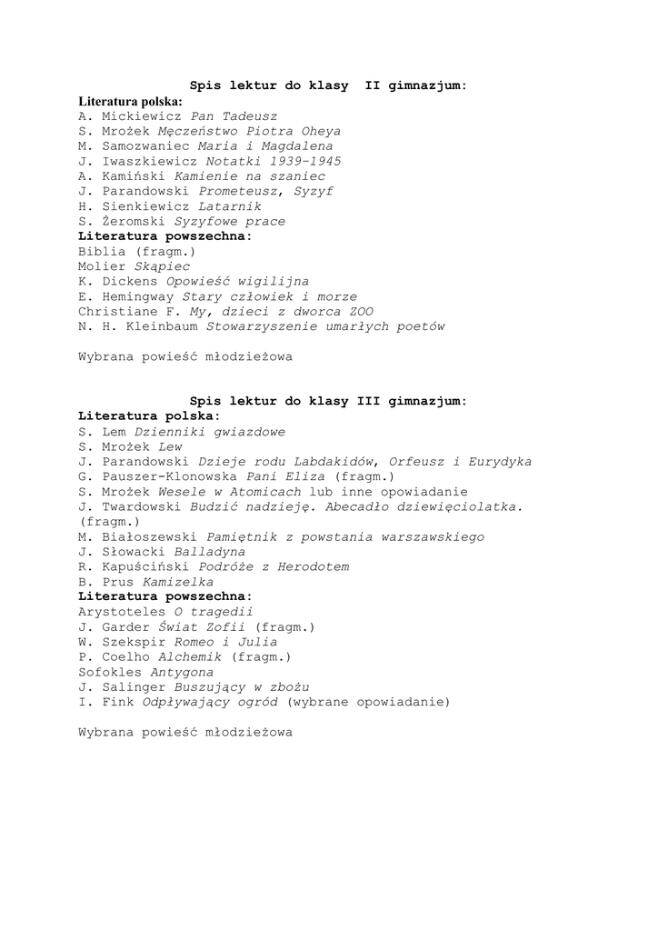 Spis lektur do klasy II gimnazjum: Literatura polska: A. Mickiewicz Pan Tadeusz S. Mrożek Męczeństwo Piotra Oheya M. Samozwaniec Maria i Magdalena J. Iwaszkiewicz Notatki 1939–1945 A. Kamiński Kamienie na szaniec J. Parandowski Prometeusz, Syzyf H. Sienkiewicz Latarnik S. Żeromski Syzyfowe prace Literatura powszechna: Biblia (fragm.) Molier Skąpiec K. Dickens Opowieść wigilijna E. Hemingway Stary człowiek i morze Christiane F. My, dzieci z dworca ZOO N. H. Kleinbaum Stowarzyszenie umarłych poetów Wybrana powieść młodzieżowa Spis lektur do klasy III gimnazjum: Literatura polska: S. Lem Dzienniki gwiazdowe S. Mrożek Lew J. Parandowski Dzieje rodu Labdakidów, Orfeusz i Eurydyka G. Pauszer-Klonowska Pani Eliza (fragm.) S. Mrożek Wesele w Atomicach lub inne opowiadanie J. Twardowski Budzić nadzieję. Abecadło dziewięciolatka. (fragm.) M. Białoszewski Pamiętnik z powstania warszawskiego J. Słowacki Balladyna R. Kapuściński Podróże z Herodotem B. Prus Kamizelka Literatura powszechna: Arystoteles O tragedii J. Garder Świat Zofii (fragm.) W. Szekspir Romeo i Julia P. Coelho Alchemik (fragm.) Sofokles Antygona J. Salinger Buszujący w zbożu I. Fink Odpływający ogród (wybrane opowiadanie) Wybrana powieść młodzieżowa
