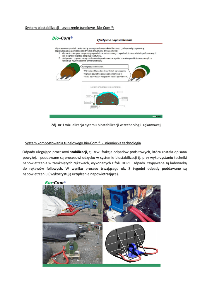 System biostabilizacji urządzenie tunelowe Bio-Com ®; Zdj. nr 1 wizualizacja sytemu biostabilizacji w technologii rękawowej System kompostowania tunelowego Bio-Com ® - niemiecka technologia Odpady ulegające procesowi stabilizacji, tj. tzw. frakcja odpadów podsitowych, która została opisana powyżej, poddawane są procesowi odzysku w systemie biostabilizacji tj. przy wykorzystaniu techniki napowietrzania w zamkniętych rękawach, wykonanych z folii HDPE. Odpady zsypywane są ładowarką do rękawów foliowych. W wyniku procesu trwającego ok. 8 tygodni odpady poddawane są napowietrzaniu ( wykorzystują urządzenie napowietrzające). Zdj. nr 2 system napowietrzania Całe powietrze procesowe które jest równomiernie wpompowywane w rękawy, po przejściu przez odpad jest doprowadzenie do biofiltra, którego zadaniem jest wyeliminowanie bioareozoli w tym metanu i siarkowodoru. Cały proces jest procesem zamkniętym. Biofiltr to nic innego jak ułożone warstwy trocin, rozdrobnionych karp i konarów. Jest to skuteczny system filtracji powietrza, celem niwelacji nieprzyjemnych zapachów. Po uzyskaniu wartości AT4 poniżej 10 mg O2/g s.m (tj., obniżenie do minimum wartości organicznej w całej suchej masie odpadów), odpady zostaną poddane przesianiu na mobilnym sicie bębnowym. Sito o średnicy oczka 20 mm. Po rozdzieleniu na dwie frakcje, odpady są kierowane do odbiorców odpadów celem poddania ich odzyskowi lub unieszkodliwieniu. Odpady te, po przejściu procesu stają się obojętne dla środowiska naturalnego. System stabilizacji w pełni spełnia kryteria instalacji zdefiniowanej w ustawie prawo ochrony środowiska, gdyż jest „zespołem stacjonarnych urządzeń technicznych (ściany czołowe, rękawy foliowe, biofiltr, system dystrybucji powietrza, sterownia kontenerowa) powiązanych technologicznie…”. W porównaniu z biostabilizacją w pryzmach, rękawy foliowe wymagają mniej niż jedną piątą powierzchni, ponieważ proces w rękawie foliowym przebiega znacznie szybciej. Ponadto system z pryzmowaniem na otwartej przestrzeni, dopuszczony przez Polskie prawo do funkcjonowania w instalacjach MBP jest systemem bardziej odczuwalnym emisyjnie niż rękawy foliowe. W systemie biostabilizacji odpadów komunalnych w rękawach foliowych, proces rozkładu masy organicznej przebiega w reaktorze zamkniętym, jakim jest rękaw foliowy szczelnie zamknięty z obu stron. Powietrze poprocesowe jest odprowadzane rurami PE do biofiltra, gdzie następuje jego oczyszczenie. Odziaływanie na środowisko jest zatem znacząco zminimalizowane. Rękaw foliowy (zwany też tunelem) tworząc też barierę, jednocześnie zapewnia łatwiejsze sterowanie procesem biostabilizacji. Wyeliminowana jest także, możliwość niekorzystnego wpływu opadów atmosferycznych, wiatru, owadów, gryzoni, ptaków i innych zwierząt. W trakcie eksploatacji materiałem zużywającym się są jednorazowe rękawy foliowe oraz rury napowietrzające. Ze względu na to, iż zarówno rękawy jaki i rury wykonane są z polietylenu, istnieje duża łatwość poddania go recyklingowi. Dodatkowo, nadmienić trzeba, iż w sytuacji przypadkowego uszkodzenia, przerwania folii, perforację w łatwy sposób można uszczelnić, zaklejając ją łatą z polietylenu lub zakładając płytę uszczelniającą. Instalacje ww. wykorzystywane do biostabilizacji odpadów komunalnych funkcjonują z powodzeniem w Stanach Zjednoczonych, a w Europie w takich krajach jak: Francja, Hiszpania, Szwecja, Włochy, Węgry i Belgia. Od początku 2013 roku stabilizacja podsitowej frakcji odpadów komunalnych w rękawach foliowych Bio-Com stosowana jest w większości firm w Polsce, które otrzymały status instalacji regionalnej. Poniżej kilka przykładowych zdjęć technologii biocom Zdj. nr 3 i 4 płyta czołowa wraz systemem napowietrzającym Zdj. nr 5 i 6 urządzenie napełniające rękawy oraz wprowadzające system napowietrzania do rękawów Zdj. nr 7 przykładowy widok usytuowania rękawów w kilku zakładach w Polsce i zagranicą.