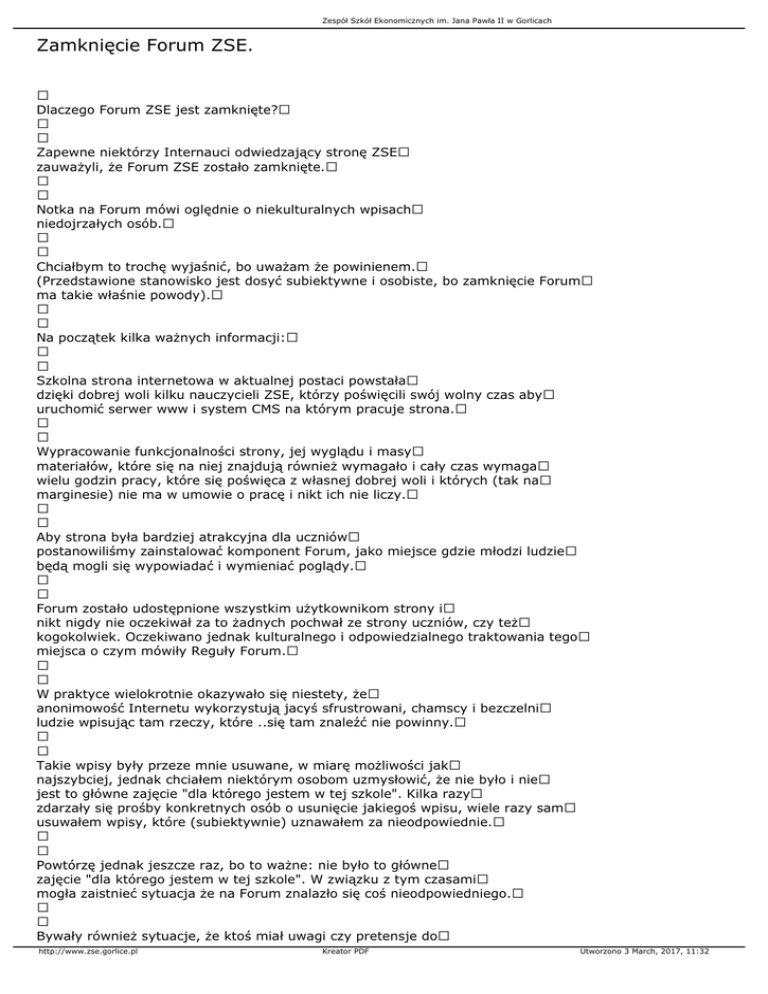 Zespół Szkół Ekonomicznych im. Jana Pawła II w Gorlicach Zamknięcie Forum ZSE. Dlaczego Forum ZSE jest zamknięte? Zapewne niektórzy Internauci odwiedzający stronę ZSE zauważyli, że Forum ZSE zostało zamknięte. Notka na Forum mówi oględnie o niekulturalnych wpisach niedojrzałych osób. Chciałbym to trochę wyjaśnić, bo uważam że powinienem. (Przedstawione stanowisko jest dosyć subiektywne i osobiste, bo zamknięcie Forum ma takie właśnie powody). Na początek kilka ważnych informacji: Szkolna strona internetowa w aktualnej postaci powstała dzięki dobrej woli kilku nauczycieli ZSE, którzy poświęcili swój wolny czas aby uruchomić serwer www i system CMS na którym pracuje strona. Wypracowanie funkcjonalności strony, jej wyglądu i masy materiałów, które się na niej znajdują również wymagało i cały czas wymaga wielu godzin pracy, które się poświęca z własnej dobrej woli i których (tak na marginesie) nie ma w umowie o pracę i nikt ich nie liczy. Aby strona była bardziej atrakcyjna dla uczniów postanowiliśmy zainstalować komponent Forum, jako miejsce gdzie młodzi ludzie będą mogli się wypowiadać i wymieniać poglądy. Forum zostało udostępnione wszystkim użytkownikom strony i nikt nigdy nie oczekiwał za to żadnych pochwał ze strony uczniów, czy też kogokolwiek. Oczekiwano jednak kulturalnego i odpowiedzialnego traktowania tego miejsca o czym mówiły Reguły Forum. W praktyce wielokrotnie okazywało się niestety, że anonimowość Internetu wykorzystują jacyś sfrustrowani, chamscy i bezczelni ludzie wpisując tam rzeczy, które ..się tam znaleźć nie powinny. Takie wpisy były przeze mnie usuwane, w miarę możliwości jak najszybciej, jednak chciałem niektórym osobom uzmysłowić, że nie było i nie jest to główne zajęcie "dla którego jestem w tej szkole". Kilka razy zdarzały się prośby konkretnych osób o usunięcie jakiegoś wpisu, wiele razy sam usuwałem wpisy, które (subiektywnie) uznawałem za nieodpowiednie. Powtórzę jednak jeszcze raz, bo to ważne: nie było to główne zajęcie "dla którego jestem w tej szkole". W związku z tym czasami mogła zaistnieć sytuacja że na Forum znalazło się coś nieodpowiedniego. Bywały również sytuacje, że ktoś miał uwagi czy pretensje do http://www.zse.gorlice.pl Kreator PDF Utworzono 3 March, 2017, 11:32 Zespół Szkół Ekonomicznych im. Jana Pawła II w Gorlicach mnie i wpisywał je na Forum. Z reguły nie były to teksty obraźliwe, więc starałem się na nie odpowiadać, pomimo, że zdarzały się również teksty bardziej ..zdecydowane, czy złośliwe. Jednak to co przeczytałem na Forum w piątek 5.X przekroczyło pewne granice. Zacytuję fragmenty tamtego postu, do Waszej oceny. "Co to ma byc za wielki admistrator forum zse??!! Pewnie Robert. Berkowicz!! Człowieku, ty te posty czytaj a nie oglądaj, siedziec na dupie ja tez potrafie, i mówic o głupotach!!" "A Ty jestes od czego w tej szkole??!! Od czyszczenia swoich szkiełek z nosa??" "wez sie szanowny <<Magistrze>> (chociaz nie wiem czy podstawówke skończyłeś) Opanuj!! i weź do tej strony jak nalezy!!" (?) Nie wiem tak naprawdę czym był powodowany taki wpis. Mogę się domyślać, że ktoś się poczuł urażony jakimś postem i mówiąc obrazowo "pojechał po mnie". W stylu, który chyba nie wymaga specjalnego komentarza. Osoba, która wpisała "swoją uwagę" podpisała się "szczery". Ja mogę określić ją tylko określeniem "Niewdzięczny Roszczeniowy Bezczelny Cham". Mam nadzieję, że zdecydowana większość osób korzystających z Forum zrozumie sytuację i nie będzie miało pretensji za wyłączenie Forum. Nie po to przecież pracuje się nad stroną, udostępnia pewne funkcje, żeby ktoś potem pluł po osobach, które to robią. Na razie więc Forum ZSE zostaje zamknięte. Ewentualne komentarze i uwagi proszę kierować na mój adres e-mail lub osobiście. (Przypuszczam, że osoby typu "szczery" potrafią tylko anonimowo zapaskudzić Internet i na nic więcej się nie odważą) PS.: Były propozycje wprowadzenia rejestracji i identyfikowania użytkowników - pomysł do przemyślenia, tylko szczerze mówiąc - odechciewa się .. Robert Berkowicz http://www.zse.gorlice.pl Kreator PDF Utworzono 3 March, 2017, 11:32