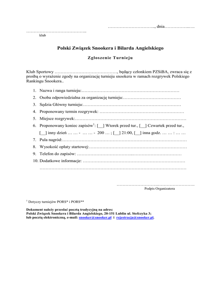 ………………………….., dnia……………..…. ………………………………….. klub Polski Związek Snookera i Bilarda Angielskiego Zgłoszenie Turnieju Klub Sportowy ……………………………………, będący członkiem PZSiBA, zwraca się z prośbą o wyraŜenie zgody na organizację turnieju snookera w ramach rozgrywek Polskiego Rankingu Snookera.. 1. Nazwa i ranga turnieju:………………………………………………………… 2. Osoba odpowiedzialna za organizację turnieju:………………………………… 3. Sędzia Główny turnieju:………………………………………………………… 4. Proponowany termin rozgrywek: ………………………………………………… 5. Miejsce rozgrywek:………………………………………………………………… 6. Proponowany koniec zapisów1: [__] Wtorek przed tur., [__] Czwartek przed tur., [__] inny dzień … … - … … - 200 … ; [__] 21:00, [__] inna godz. … … : … … 7. Pula nagród:………………………………………………………………………… 8. Wysokość opłaty startowej:………………………………………………………… 9. Telefon do zapisów: ………………………………..…………………………… 10. Dodatkowe informacje: …………………………………………………………… ……………………………………………………………………………………… ……………………….……………………. Podpis Organizatora 1 Dotyczy turniejów PORS* i PORS** Dokument naleŜy przesłać pocztą tradycyjną na adres: Polski Związek Snookera i Bilarda Angielskiego, 20-151 Lublin ul. Stefczyka 3; lub pocztą elektroniczną, e-mail: [email protected] i [email protected].