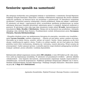 Seniorów sposób na samotność Dla integracji środowiska oraz pomagania ludziom w wychodzeniu z samotności Zarząd Rejonowy Polskiego Związku Emerytów i Rencistów z siedzibą w Bełchatowie organizuje dla swoich członków cykliczne spotkania, na których łączy się przyjemne z pożytecznym. W atmosferze wzajemnej życzliwości i otwartości seniorzy rozmawiają o swoich problemach, dzielą się radami i radościami. W zależności od okazji i zaproszonych gości uczestnikom spotkania przekazywane są ważne informacje dotyczące tematyki zdrowotnej, załatwiania spraw w urzędach, bieżących wydarzeń w powiecie. W pierwszej w tym roku tego typu inicjatywie wzięło udział 50 osób, reprezentujących mieszkańców Kluk, Drużbic i Bełchatowa. Okazją stał się karnawał oraz przełożone z listopada ubiegłego roku obchody Dnia Seniora. Przedsięwzięcie zostało dofinansowane przez Szczepana Chrzęsta, Starostę Bełchatowskiego. - Wszystkie działania przez nas podejmowane kierujemy do emerytów, rencistów oraz inwalidów – mówi Lucyna Gorzelak, szefowa organizacji. - Główny cel jest jeden: pomoc osobom starszym. Nierzadko są to ludzie chorzy, samotni, odcięci od innych i świata. Nasze spotkania są dla nich okazją i mobilizacją do wyjścia z domu. Trzeba w to włożyć wysiłek, ale ten trud opłaca się. Kiedy jesteśmy razem dużo rozmawiamy, śmiejemy się i tańczymy, czasem płaczemy. Wciąż uczymy się przezwyciężać trudne sytuacje życiowe, a ponadto poprzez swoje działanie pielęgnujemy narodowe tradycje i polskość, prawa człowieka i swobody obywatelskie. Bełchatowski oddział organizacji zrzesza około 290 członków, w tym 200 kobiet po 60. roku życia. Gros osób ma legitymację inwalidzką. W zależności od posiadanych środków – głównie składek członkowskich - oraz hojności darczyńców, stowarzyszenie organizuje wyjazdy wypoczynkowe i rehabilitacyjne, wycieczki krajoznawcze. Najbliższe spotkanie integracyjne odbędzie się w marcu. Siedziba bełchatowskiego Zarządu Rejonowego Polskiego Związku Emerytów i Rencistów mieści się przy ul. 1 Maja 45 w Bełchatowie. Agnieszka Zawodzińska, Wydział Promocji i Rozwoju Powiatu w starostwie