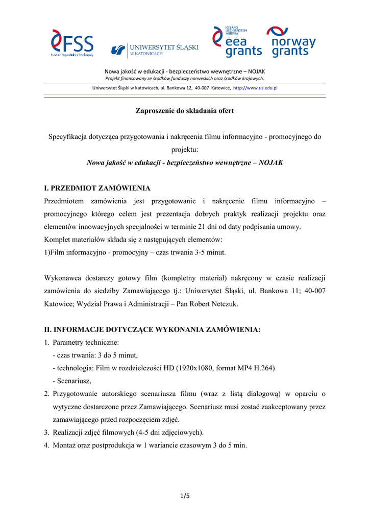 Nowa jakość w edukacji - bezpieczeństwo wewnętrzne – NOJAK Projekt finansowany ze środków funduszy norweskich oraz środków krajowych. Uniwersytet Śląski w Katowicach, ul. Bankowa 12, 40-007 Katowice, http://www.us.edu.pl Zaproszenie do składania ofert Specyfikacja dotycząca przygotowania i nakręcenia filmu informacyjno - promocyjnego do projektu: Nowa jakość w edukacji - bezpieczeństwo wewnętrzne – NOJAK I. PRZEDMIOT ZAMÓWIENIA Przedmiotem zamówienia jest przygotowanie i nakręcenie filmu informacyjno – promocyjnego którego celem jest prezentacja dobrych praktyk realizacji projektu oraz elementów innowacyjnych specjalności w terminie 21 dni od daty podpisania umowy. Komplet materiałów składa się z następujących elementów: 1)Film informacyjno - promocyjny – czas trwania 3-5 minut. Wykonawca dostarczy gotowy film (kompletny materiał) nakręcony w czasie realizacji zamówienia do siedziby Zamawiającego tj.: Uniwersytet Śląski, ul. Bankowa 11; 40-007 Katowice; Wydział Prawa i Administracji – Pan Robert Netczuk. II. INFORMACJE DOTYCZĄCE WYKONANIA ZAMÓWIENIA: 1. Parametry techniczne: - czas trwania: 3 do 5 minut, - technologia: Film w rozdzielczości HD (1920x1080, format MP4 H.264) - Scenariusz, 2. Przygotowanie autorskiego scenariusza filmu (wraz z listą dialogową) w oparciu o wytyczne dostarczone przez Zamawiającego. Scenariusz musi zostać zaakceptowany przez zamawiającego przed rozpoczęciem zdjęć. 3. Realizacji zdjęć filmowych (4-5 dni zdjęciowych). 4. Montaż oraz postprodukcja w 1 wariancie czasowym 3 do 5 min. 1/5 Nowa jakość w edukacji - bezpieczeństwo wewnętrzne – NOJAK Projekt finansowany ze środków funduszy norweskich oraz środków krajowych. Uniwersytet Śląski w Katowicach, ul. Bankowa 12, 40-007 Katowice, http://www.us.edu.pl 5. Przedstawienie wstępnego montażu off-line do akceptacji. Materiał zostanie skierowany do dalszej obróbki po uwzględnieniu wszystkich uwag i poprawek wniesionych przez Zamawiającego. 6. Zapewnienie lektora polskojęzycznego, tłumaczenia na język migowy, napisów w pasku /subtitles/. 7. Zapewnienia podkładu muzycznego wraz z prawami autorskimi do jego wykorzystania w filmie oraz odtwarzania i kopiowania. 8. Przekazania całości praw majątkowych do wykonanego filmu. Film przeznaczony będzie do dystrybucji w Internecie, UŚ TV oraz na płytach DVD. Wykonawca zobowiązuje się do dostarczenia wyprodukowanego filmu na elektronicznym nośniku danych do siedziby Zamawiającego. 9. Należność za wykonanie zamówienia będzie płatna po jego zrealizowaniu, na podstawie faktury VAT rachunku wystawionego przez Wykonawcę, pod warunkiem dokonania wcześniejszej akceptacji filmu przez Zamawiającego. Oferowana cena pokrywa wszelkie roszczenia Wykonawcy z tytułu wykonania umowy. 10. Wykonawca uzyska zgody na przetwarzanie wizerunku osób zaangażowanych w nakręcenie filmu. 11. Film powinien zostać oznakowany zgodnie z obowiązującymi wytycznymi Instytucji – Fundusz Stypendialny i Szkoleniowy dostępne na stronie: http://www.fss.org.pl/promocja, oraz logotypami UŚ, 12. Przed przystąpieniem do realizacji filmu, Wykonawca zobowiązuje się do przeprowadzenia z Zamawiającym konsultacji w jego siedzibie w celu wyjaśnienia wszelkich wątpliwości dotyczących przedmiotu umowy. 13. Wykonawca zobowiązany jest w terminie do 3 dni od podpisania umowy przedstawić Zamawiającemu wstępny projekt scenariusza do akceptacji. W przypadku uwag Zamawiającego, dotyczących przygotowanego projektu scenariusza, Zamawiający zobowiązany jest do wprowadzenia poprawek w terminie do 2 dni od przekazania scenariusza do akceptacji. Ostateczną wersję scenariusza wykonawca przedstawi do ponownej akceptacji w ciągu 2 dni od daty otrzymania uwag zamawiającego. 2/5 Nowa jakość w edukacji - bezpieczeństwo wewnętrzne – NOJAK Projekt finansowany ze środków funduszy norweskich oraz środków krajowych. Uniwersytet Śląski w Katowicach, ul. Bankowa 12, 40-007 Katowice, http://www.us.edu.pl 14. Po zaakceptowaniu scenariusza filmu (bez uwag), Wykonawca dokona realizacji filmu w terminie nieprzekraczającym termin określonego w pkt. I niniejszej specyfikacji. 15. Podpisany dwustronnie protokół odbioru (bez uwag), upoważnia Wykonawcę do wystawienia faktury VAT/rachunku za przygotowanie filmu, po przekazaniu gotowego materiału Zamawiającemu. III. Termin składania oferty: do 5 maja 2014 r. do godz. 10.00 Oferty na ww. zadania powinny zostać złożone w formie elektronicznej drogą e-mail pod adresem [email protected] zgodnie z załącznikiem nr 1. IV. Kontakt z Zamawiającym Osobą upoważnioną ze strony Zamawiającego do kontaktu z Wykonawcami jest Pan Robert Netczuk tel. 605656076 V. KRYTERIA OCENY OFERTY Za ofertę najkorzystniejszą Zamawiający uzna ofertę z najniższą ceną usługi, spełniającą wszystkie wskazane przez Zamawiającego w pkt. I i II warunki, w szczególności uwzględniającą wszelkie czynności związane z wyprodukowaniem filmu. Termin wykonania Zlecenia – 21 dni od daty podpisania umowy. VI. UWAGI KOŃCOWE 1. Zamawiający zastrzega sobie prawo odstąpienia bądź unieważnienia zapytania ofertowego bez podania przyczyny w przypadku zaistnienia okoliczności nieznanych Zamawiającemu w dniu sporządzania niniejszego zapytania Ofertowego. 2. Oferent może wprowadzić zmiany w złożonej ofercie lub ją wycofać, pod warunkiem, że uczyni to przed upływem terminu składania ofert. Zarówno zmiana, jak i wycofanie oferty, wymagają zachowania formy pisemnej. 3. Ze względu na założenia budżetowe i ograniczenia finansowe, w przypadku, gdy kwoty przedstawione w odpowiedziach na zapytanie będą wyższe od zaplanowanych w budżecie ww. projektu Zamawiający, zastrzega sobie prawo negocjacji z 3/5 Nowa jakość w edukacji - bezpieczeństwo wewnętrzne – NOJAK Projekt finansowany ze środków funduszy norweskich oraz środków krajowych. Uniwersytet Śląski w Katowica