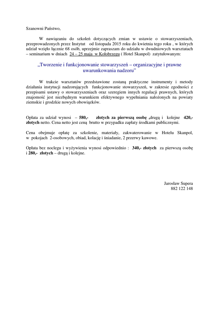 Szanowni Państwo, W nawiązaniu do szkoleń dotyczących zmian w ustawie o stowarzyszeniach, przeprowadzonych przez Instytut od listopada 2015 roku do kwietnia tego roku , w których udział wzięło łącznie 68 osób, uprzejmie zapraszam do udziału w dwudniowych warsztatach – seminarium w dniach 24 – 25 maja w Kołobrzegu ( Hotel Skanpol) zatytułowanym: „Tworzenie i funkcjonowanie stowarzyszeń – organizacyjne i prawne uwarunkowania nadzoru” W trakcie warsztatów przedstawione zostaną praktyczne instrumenty i metody działania instytucji nadzorujących funkcjonowanie stowarzyszeń, w zakresie zgodności z przepisami ustawy o stowarzyszeniach oraz szeregiem innych regulacji prawnych, których znajomość jest niezbędnym warunkiem efektywnego wypełniania nałożonych na powiaty ziemskie i grodzkie nowych obowiązków. Opłata za udział wynosi – 580,złotych za pierwszą osobę ,drugą i kolejne 420,złotych netto. Cena netto jest ceną brutto w przypadku zapłaty środkami publicznymi. Cena obejmuje opłatę za szkolenie, materiały, zakwaterowanie w Hotelu Skanpol, w pokojach 2-osobowych, obiad, kolację i śniadanie, 2 przerwy kawowe. Opłata bez noclegu i wyżywienia wynosi odpowiednio : 340,- złotych za pierwszą osobę i 280,- złotych – drugą i kolejne. Jarosław Supera 882 122 148